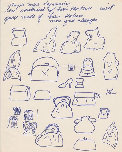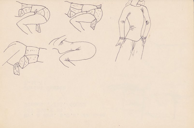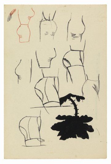 Untitled (corsets, mannequins, and undergarments) c. 1972 blue and red ballpoint pen on paper card 6 x 4 inches