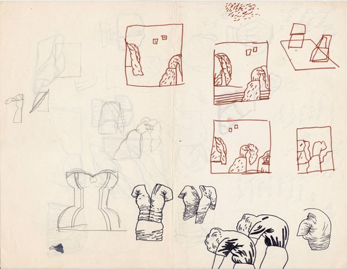 Untitled (torsos) c. 1971 ballpoint pen and colored pencil on paper 4 x 6 inches