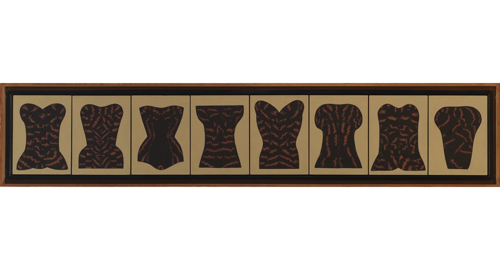 Corset/Urns 1970 acrylic on 8 masonite panels 10 x 7 1/2 inches each panel; 13 x 66 1/2 inches, 8 panels; framed