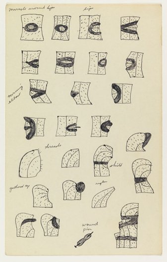 Untitled (clamped in place) c. 1970 ink and ballpoint pen on paper 6 x 4 inches
