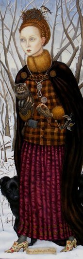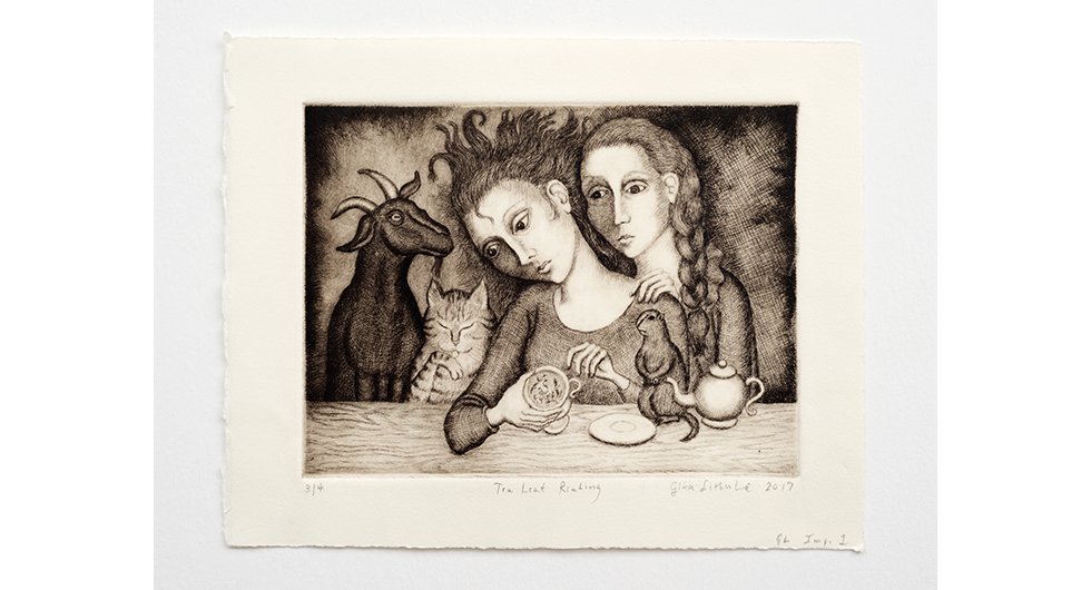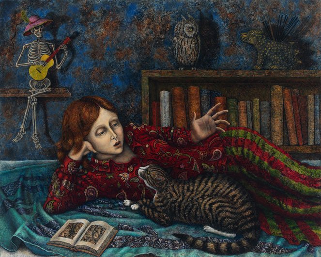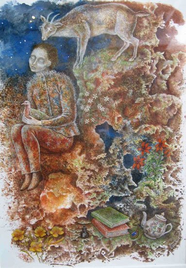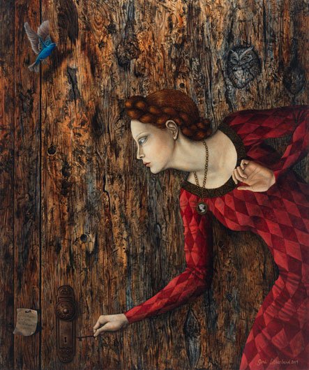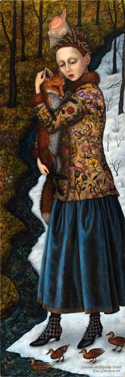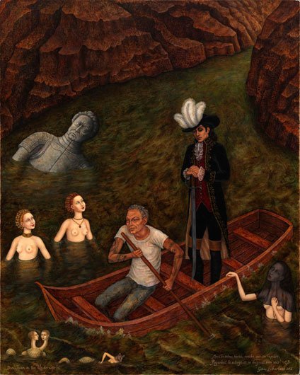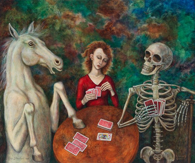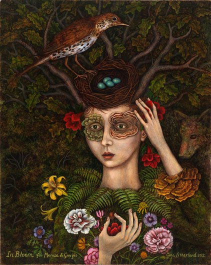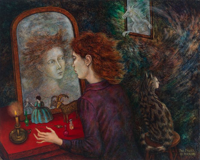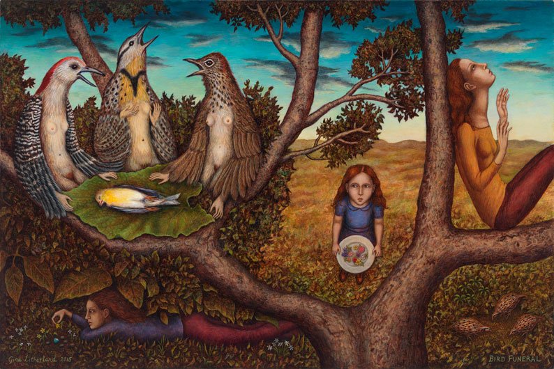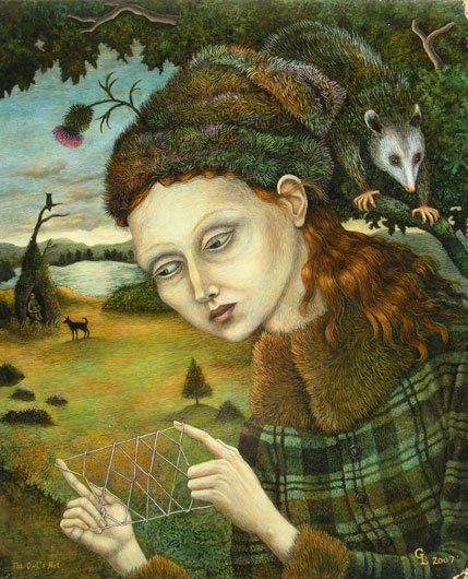 b. 1955 Lives and works in Wisconsin. In her magnificently detailed and inventive paintings, Gina Litherland extends a tradition of Midwest surrealism and magic realism that stretches back to the ’30s and ’40s and the work of Gertrude Abercrombie, Sylvia Fein, Julia Thecla and John Wilde. Born in Gary, Indiana, Litherland has been active in the visual arts since the mid 1970s, exploring photography, performance, and painting. From 1979 to 1982 she participated in weekly experimental multimedia performances at the Emergency Theatre in Chicago. Long a resident of Chicago, she studied painting at the School of the Art Institute, and her paintings, drawings, and articles have been published worldwide in journals and periodicals associated with the international surrealist movement. Her essay on the connections between creative activity and the natural world, “Imagination & Wilderness,” appeared in Surrealist Women: An International Anthology, published by University of Texas Press. Litherland’s recent work was the subject of a museum exhibition at the James Watrous Gallery of the Wisconsin Academy of Sciences, Arts, and Letters in Madison in 2006.