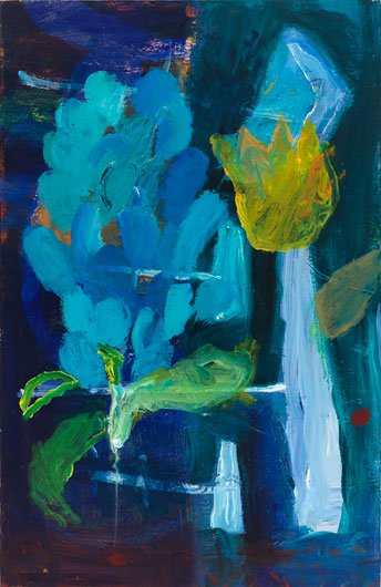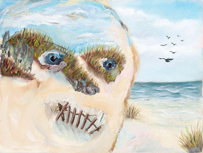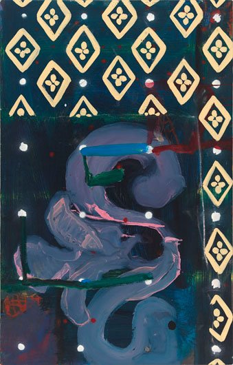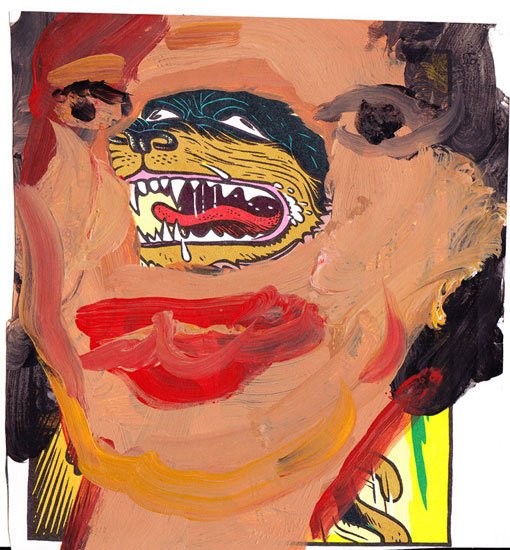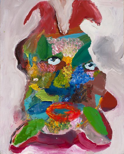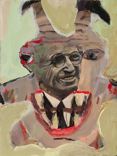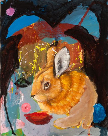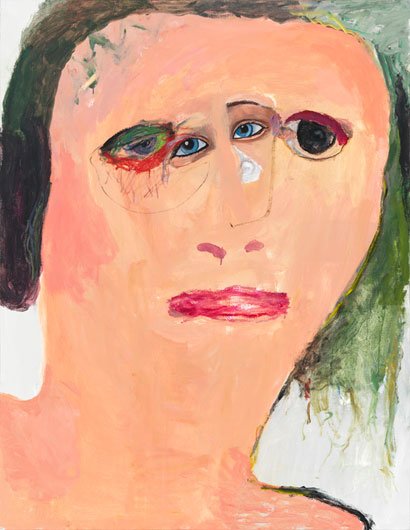 Active in Chicago since the late 1950s, Margot Bergman’s work in the last few decades has primarily revolved around two bodies of work, the Wonderland paintings and her Other Reveries series. For the latter, she uses existing artworks – usually found in thrift shops or flea markets – on which she adds just enough to draw out a portrait latent in the image. Some of the latest visages feature an uncanny double-face, both of which directly address the viewer. These collaborations are alternately playful, haunting, surrealistic, melancholic and evocative, and they betray an incredibly potent imagination. In her neo-expressionistic Wonderland paintings, Bergman has created a post-apocalyptic or prehistoric topography populated by explosively animated creatures including rabbits, pigs, jackals, and birds. Ferociously personal and ambitious in scale, the Wonderland pieces are frightening and revelatory.