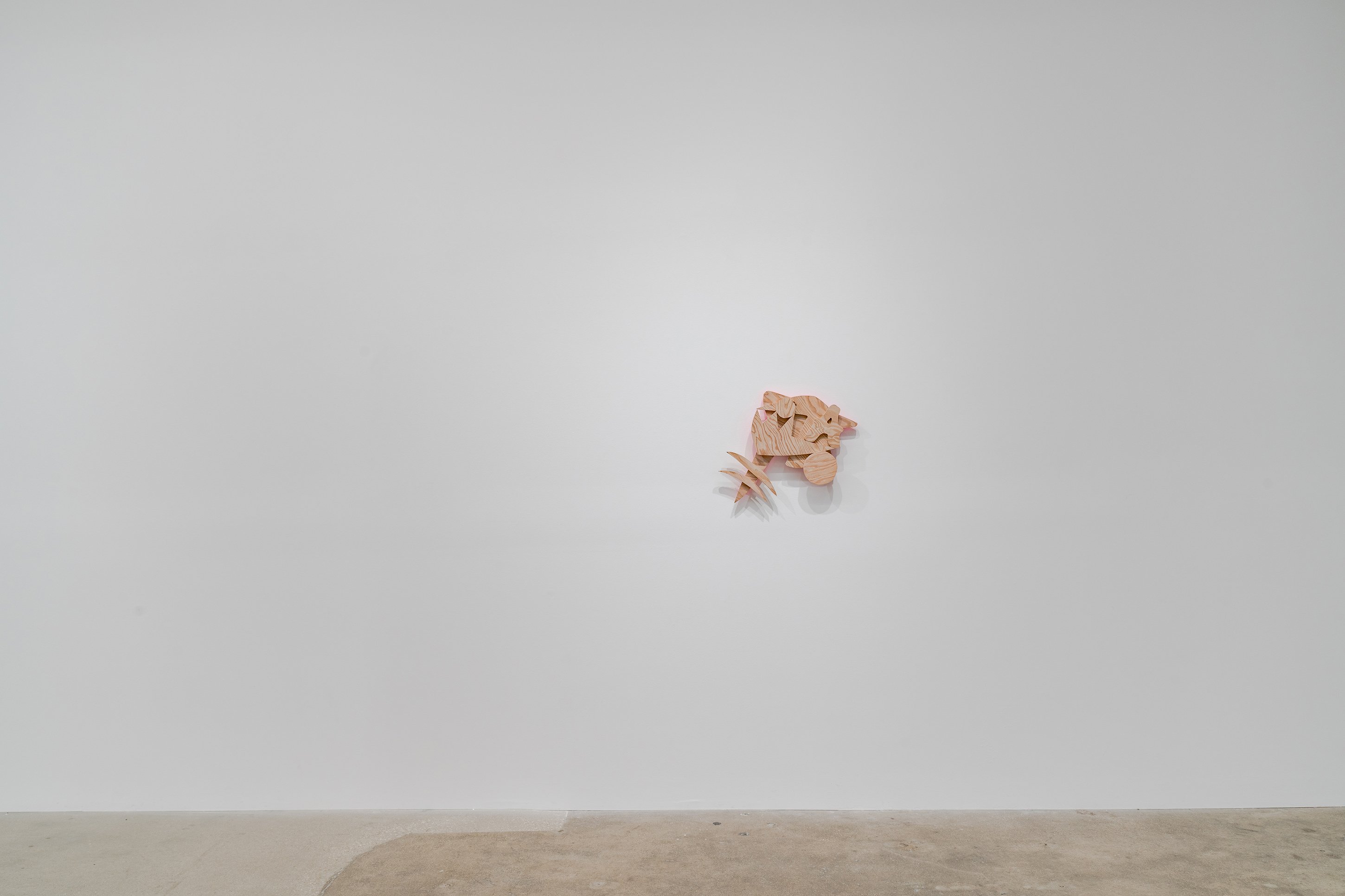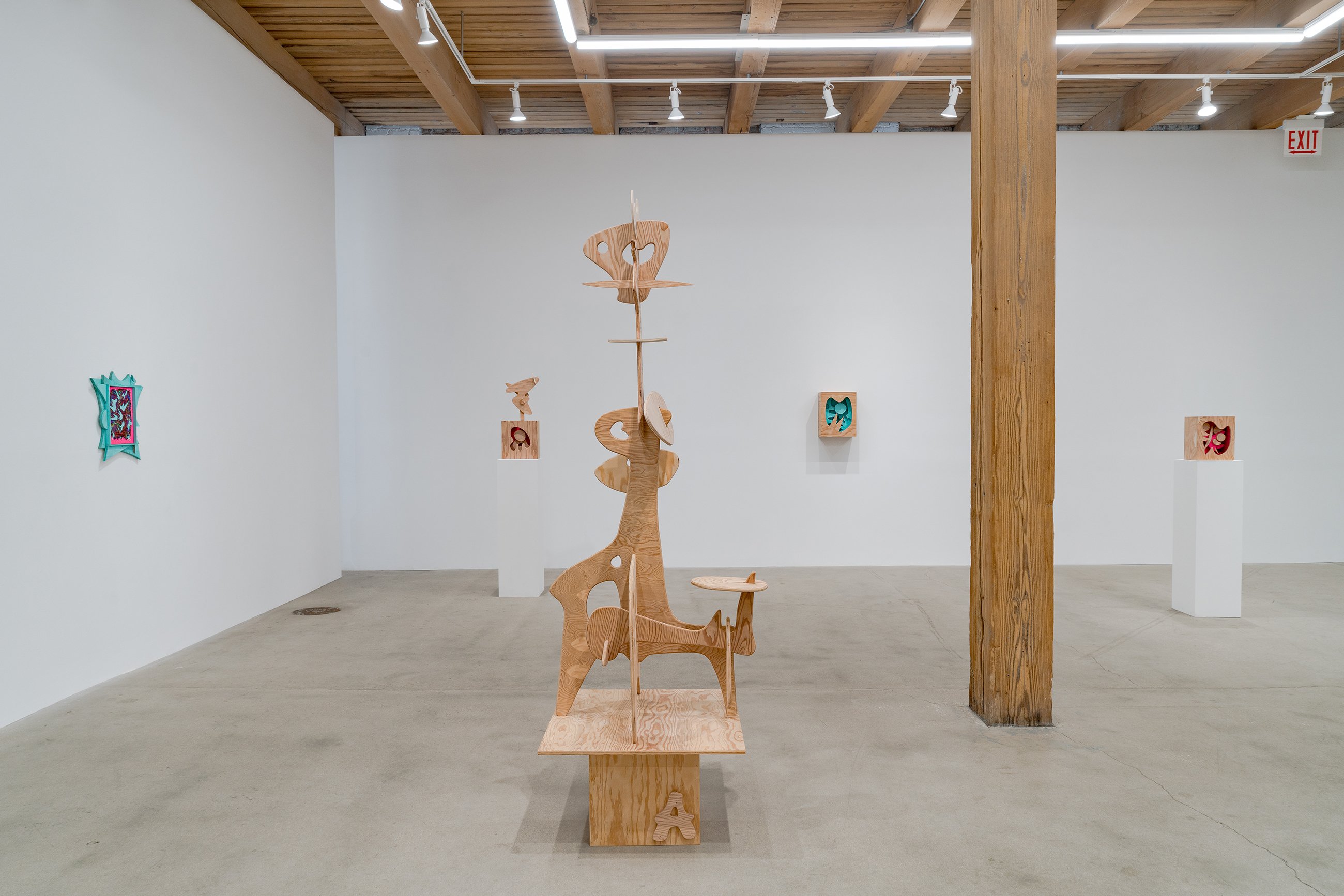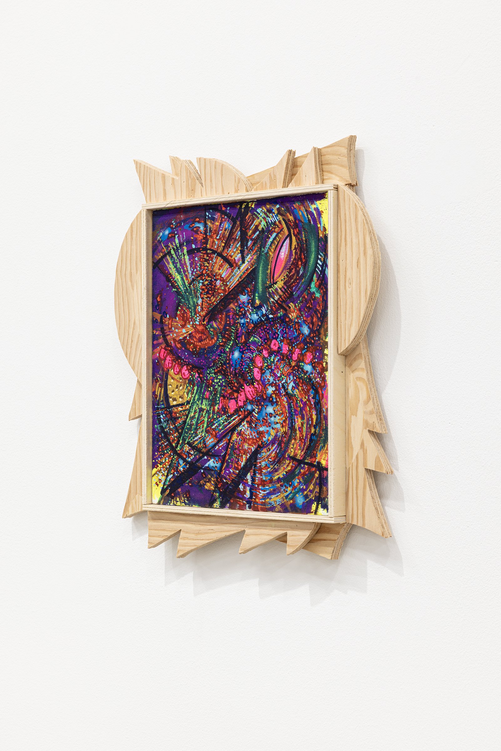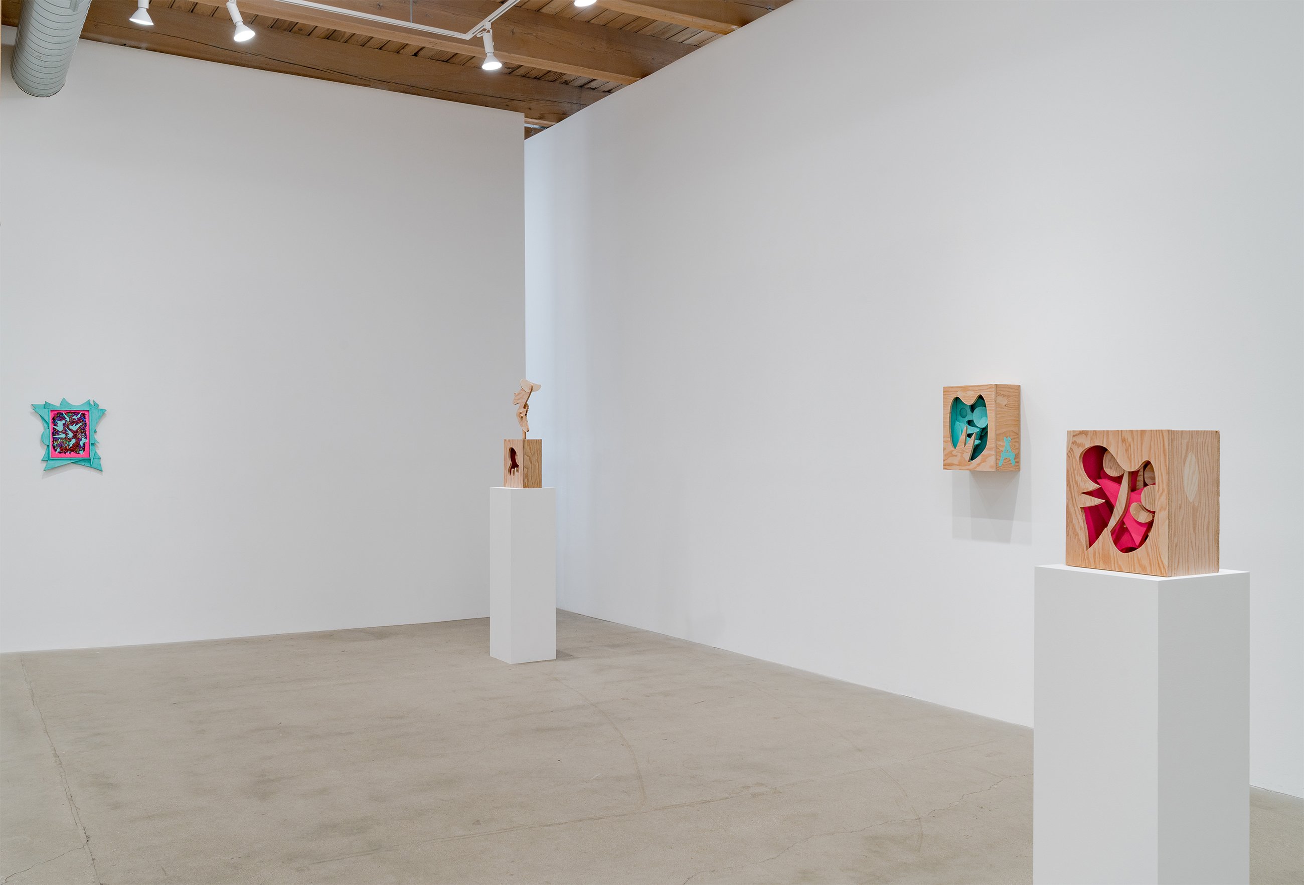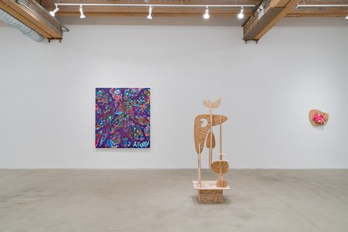 Aaron Curry (b. 1972) has charted a unique space for his work between the most sub-underground mania of the American pulp grotesque (think comix culture and the surreal side of sleazy commercialism) and the most refined formal elements of European high modernism (think Arp, Miro, Picasso). Based primarily in floor sculpture, his practice moves wildly between mediums, attaching to the walls (paintings, 3-D hanging boxes, collages), spreading into print (books, magazines, newsprint), as well as music and video. An avid historian of offbeat cultural materials, he synthesizes these points of reference in works that are often awash in dizzyingly clashing colors, hyperactive Matta-esque motion, and an ingenuity of construction that is as beautiful as it can be baffling. In Raw Dog, Curry introduces a new component to his wood sculptures, which is to leave them largely unpainted, allowing the natural grain of the material, its whorls and knots and eyes, to carry that sense of flow. Occasional flashes of hot pink, turquoise, and grape purple complement the tanscapes on several boxes and flatworks, while two human-scale sculptures are resolutely wooden, with cut away holes and curvilinear forms dancing with the wood's own patterns, the whole work suggesting a figure, cock's comb perched atop. One large painting compresses all the color that might have been in the other works into a single, atomically-charged abstract canvas.