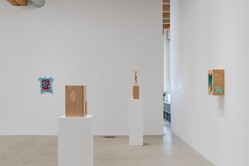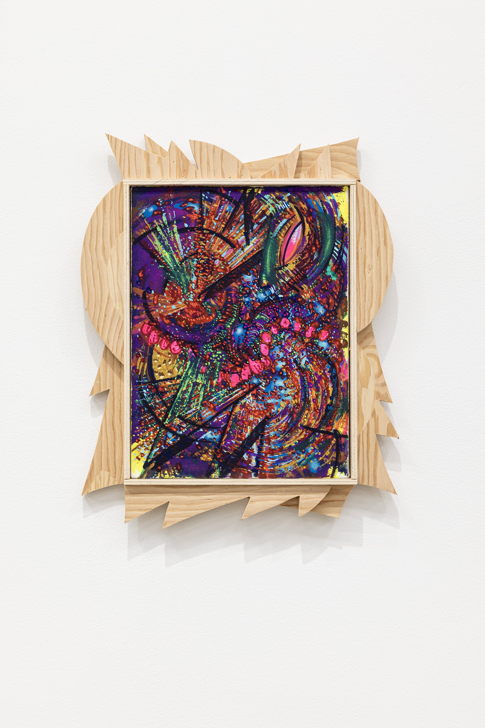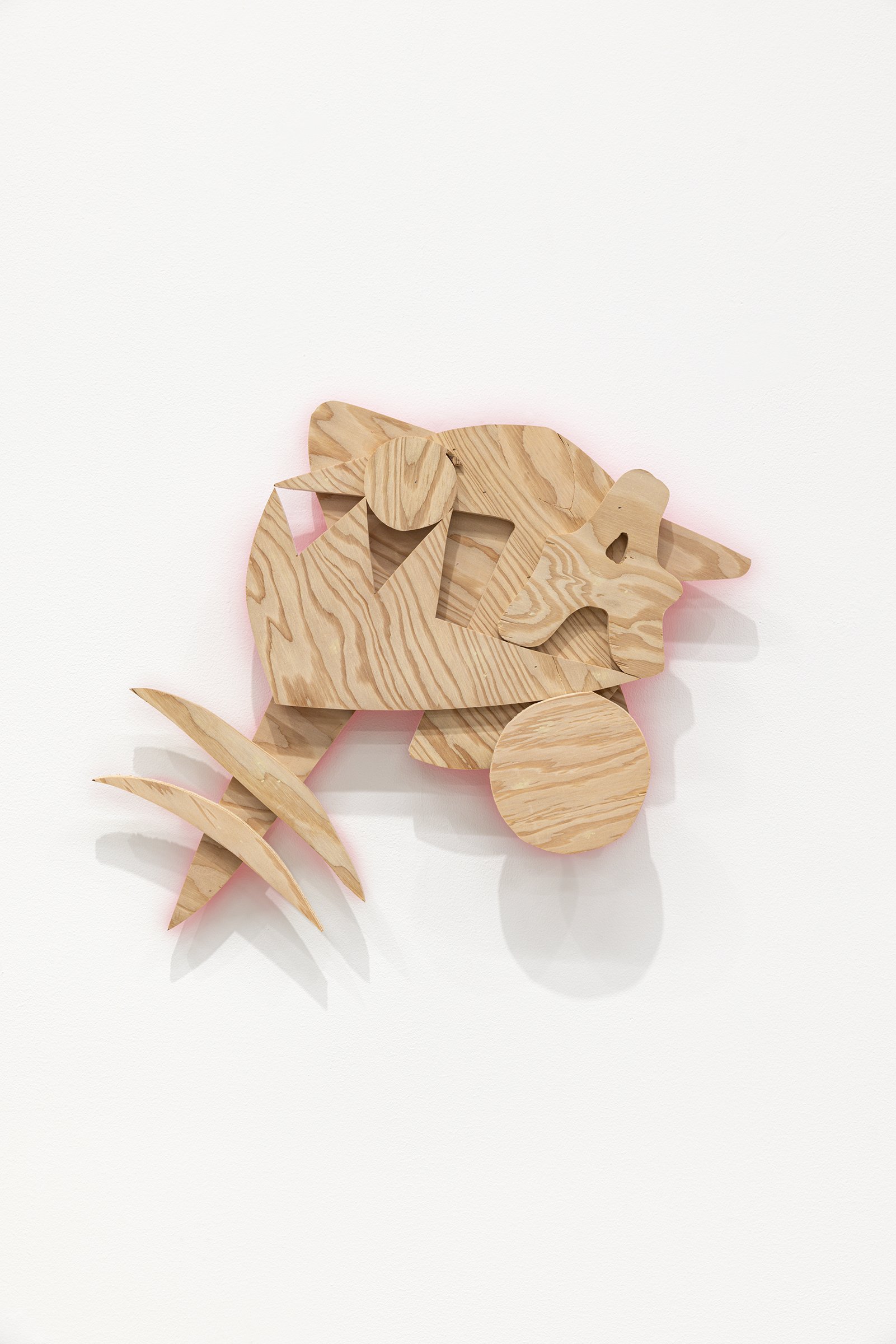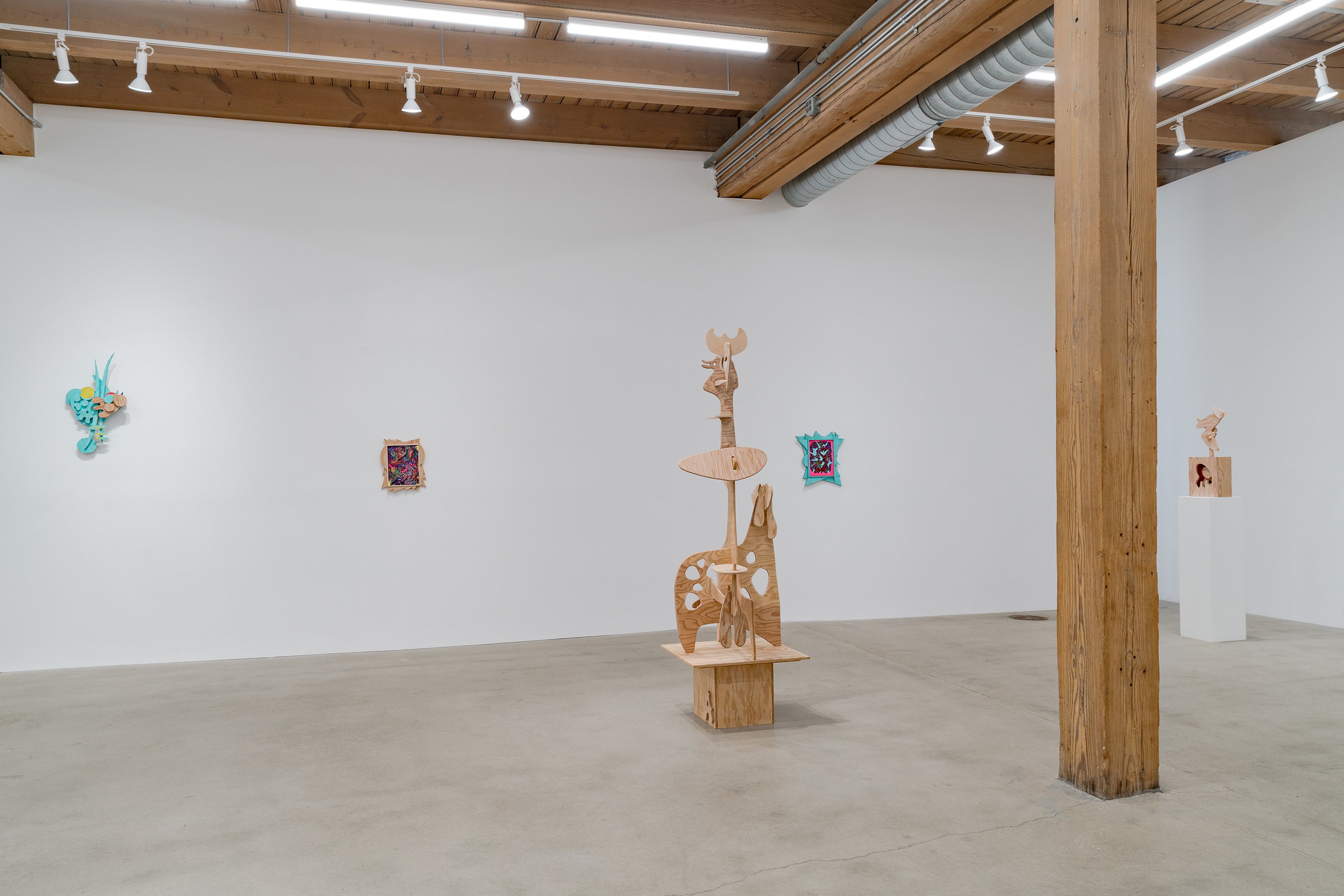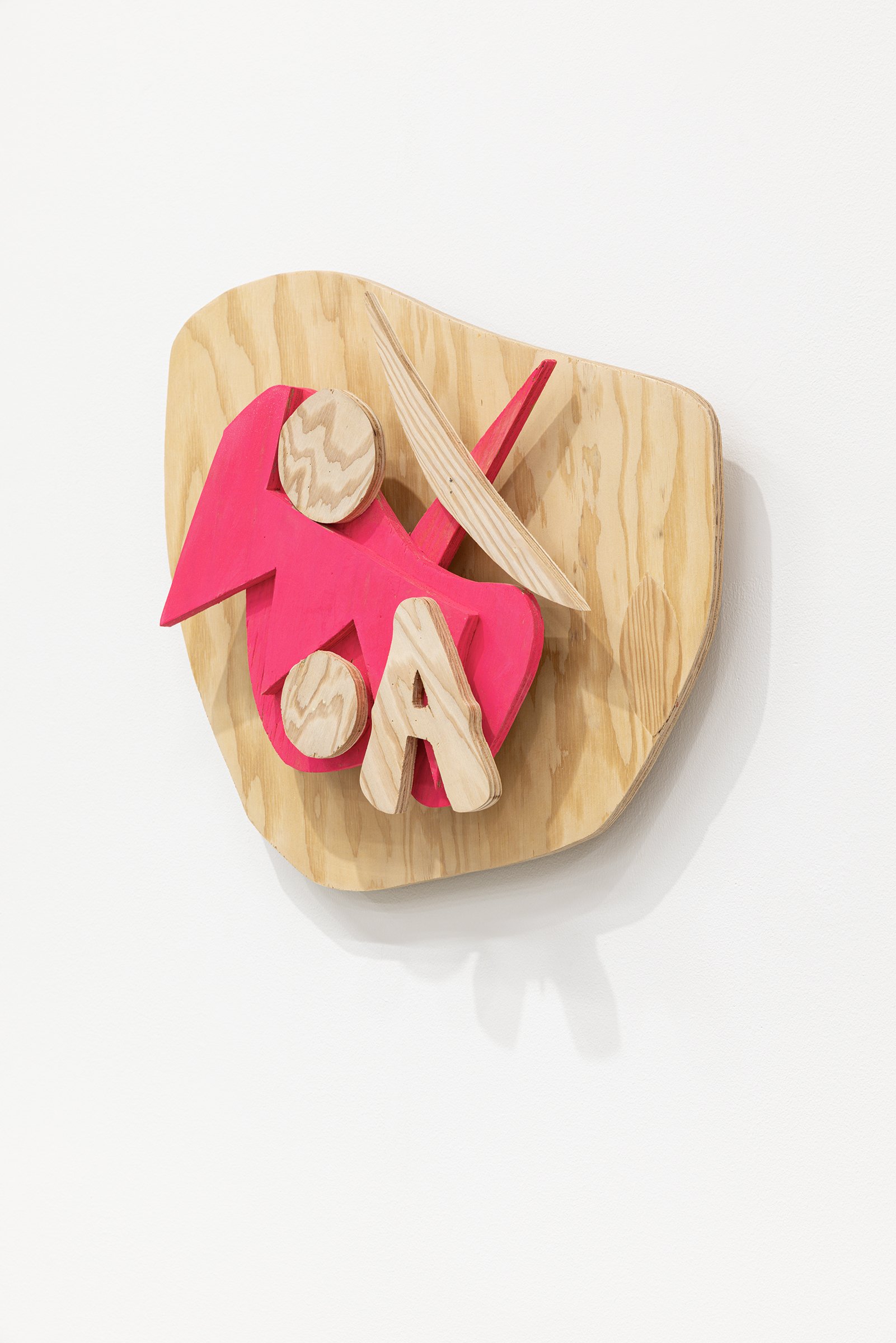 Aaron Curry (b. 1972) has charted a unique space for his work between the most sub-underground mania of the American pulp grotesque (think comix culture and the surreal side of sleazy commercialism) and the most refined formal elements of European high modernism (think Arp, Miro, Picasso). Based primarily in floor sculpture, his practice moves wildly between mediums, attaching to the walls (paintings, 3-D hanging boxes, collages), spreading into print (books, magazines, newsprint), as well as music and video. An avid historian of offbeat cultural materials, he synthesizes these points of reference in works that are often awash in dizzyingly clashing colors, hyperactive Matta-esque motion, and an ingenuity of construction that is as beautiful as it can be baffling. In Raw Dog, Curry introduces a new component to his wood sculptures, which is to leave them largely unpainted, allowing the natural grain of the material, its whorls and knots and eyes, to carry that sense of flow. Occasional flashes of hot pink, turquoise, and grape purple complement the tanscapes on several boxes and flatworks, while two human-scale sculptures are resolutely wooden, with cut away holes and curvilinear forms dancing with the wood's own patterns, the whole work suggesting a figure, cock's comb perched atop. One large painting compresses all the color that might have been in the other works into a single, atomically-charged abstract canvas.