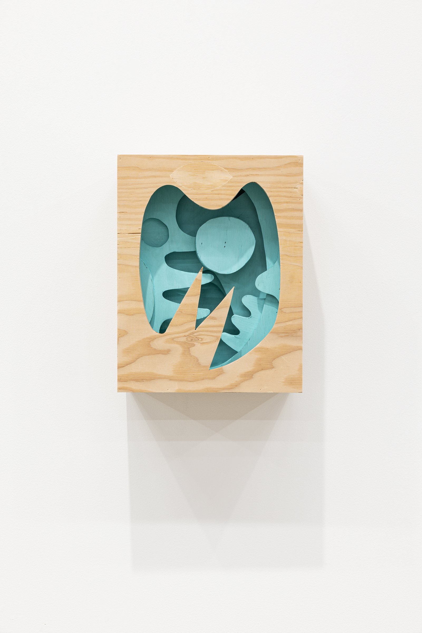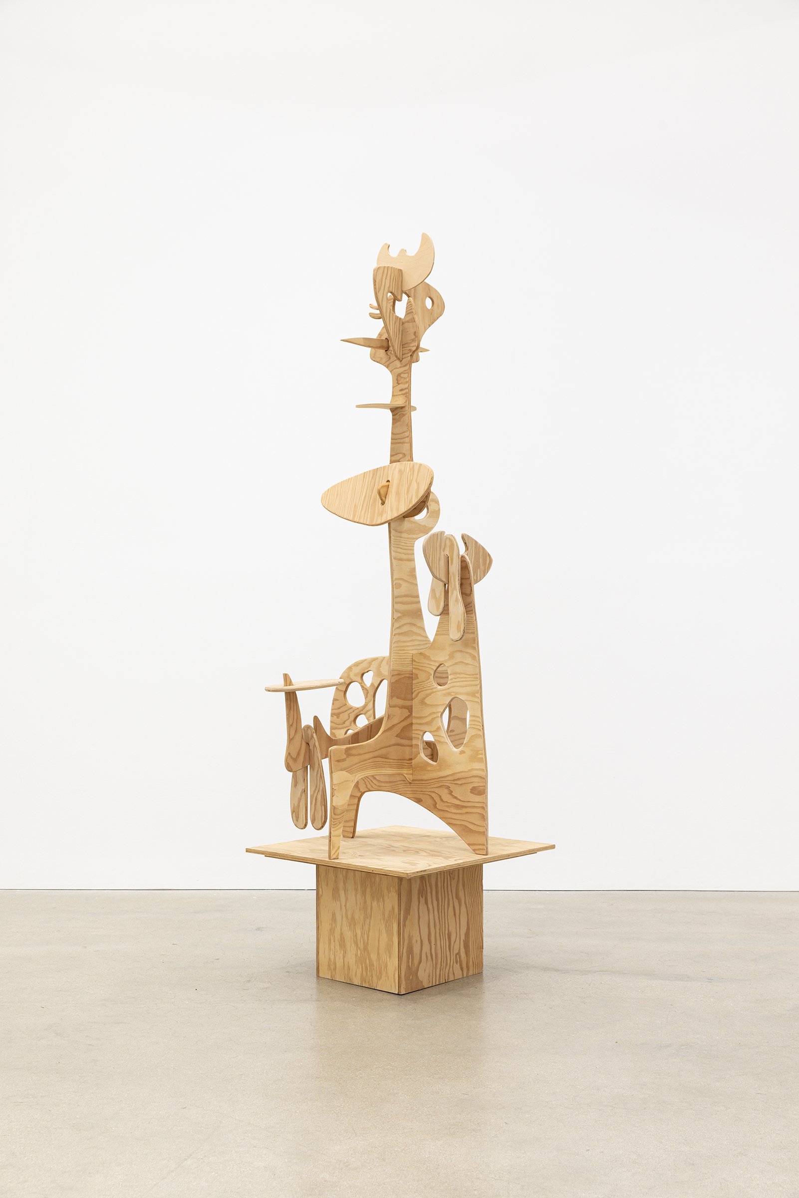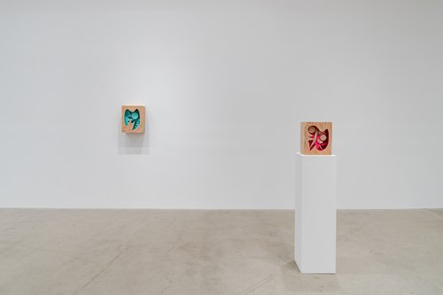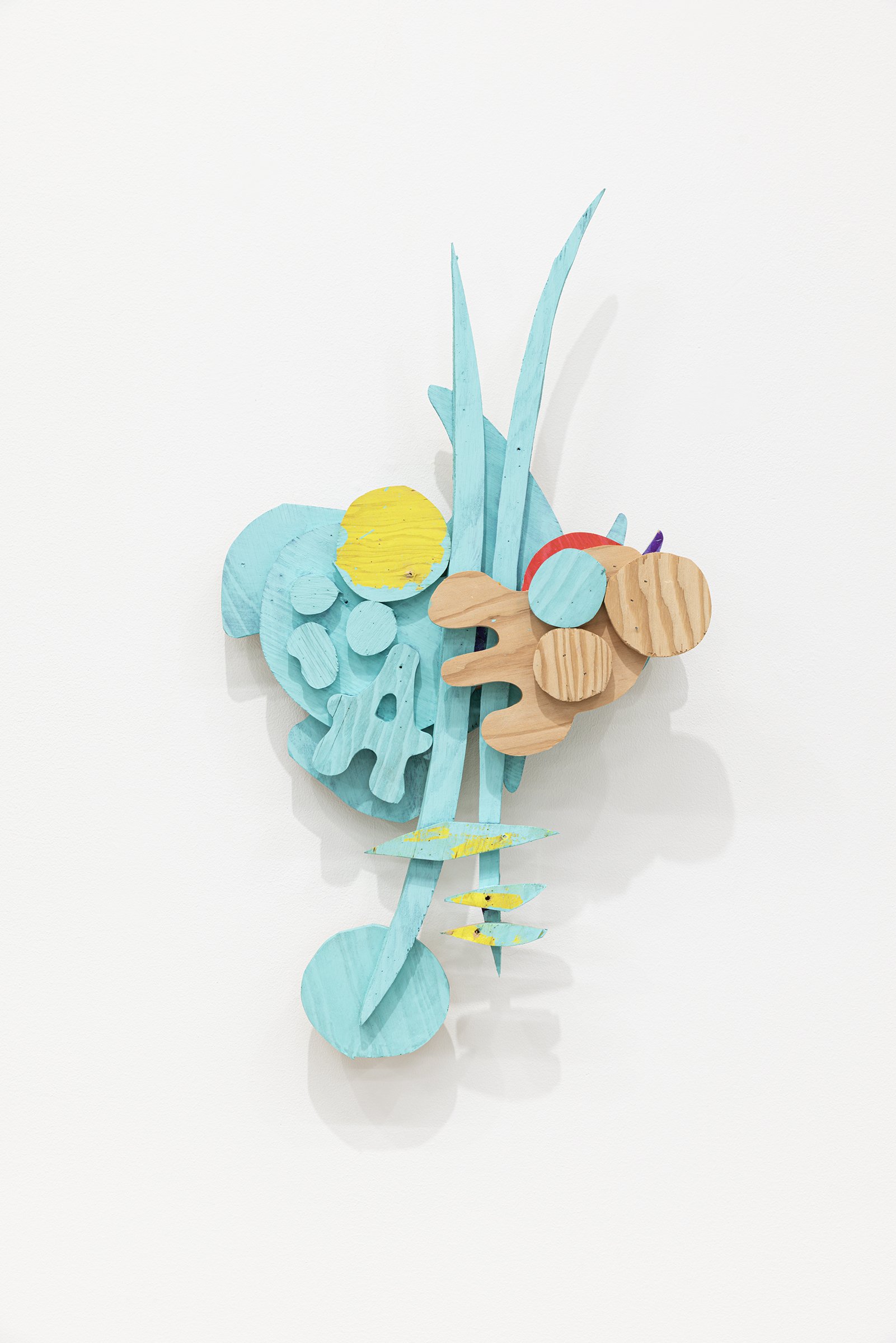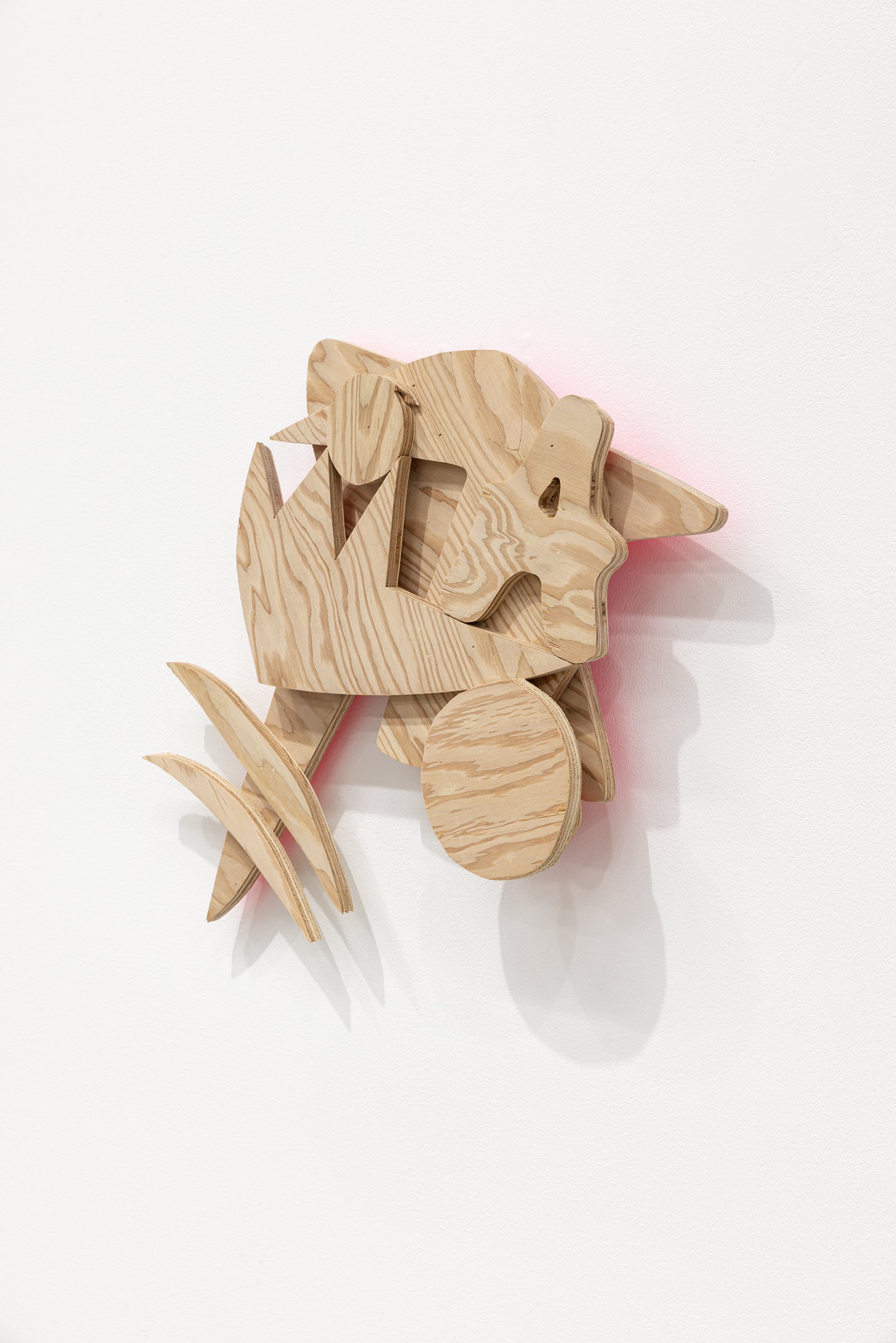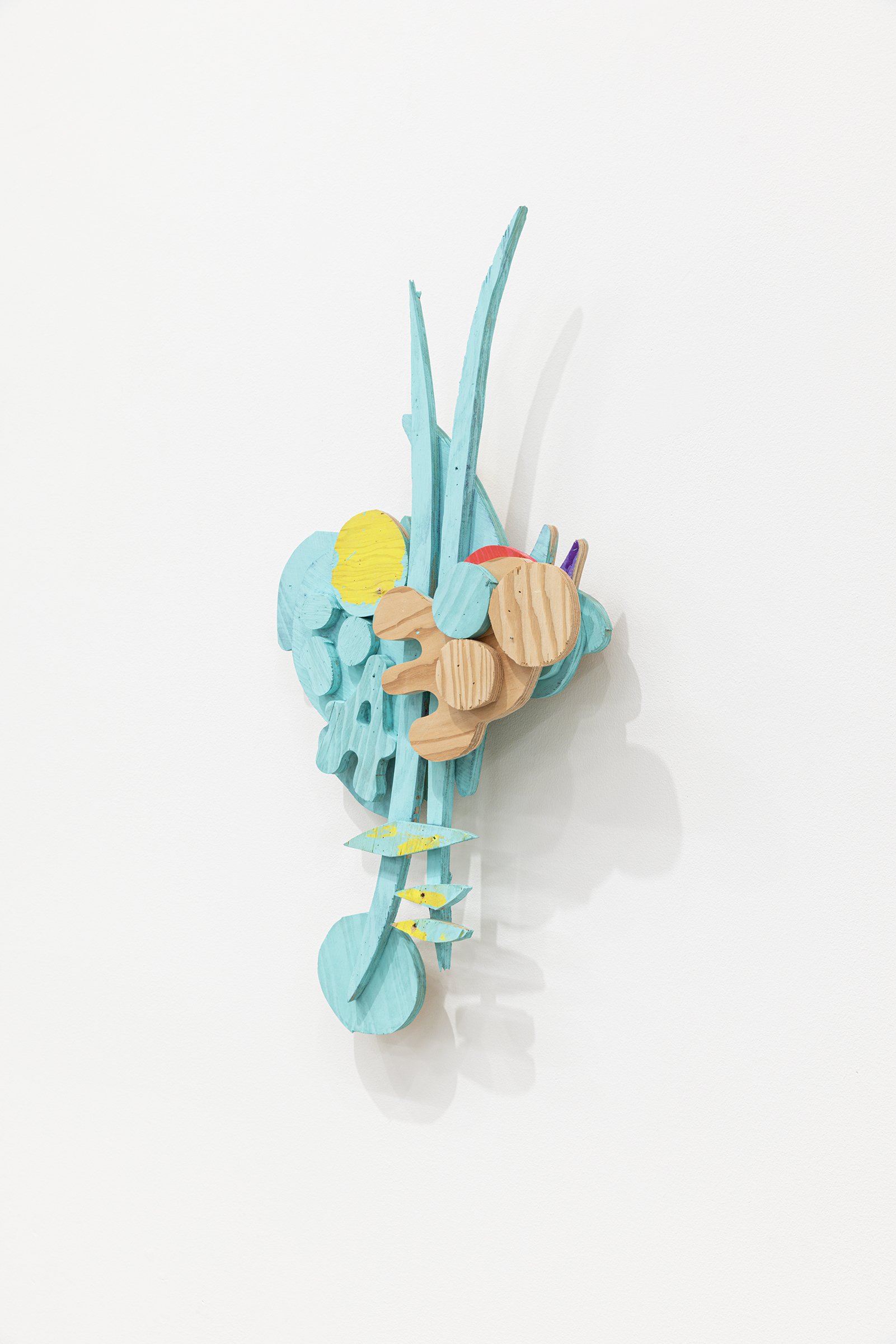 Aaron Curry (b. 1972) has charted a unique space for his work between the most sub-underground mania of the American pulp grotesque (think comix culture and the surreal side of sleazy commercialism) and the most refined formal elements of European high modernism (think Arp, Miro, Picasso). Based primarily in floor sculpture, his practice moves wildly between mediums, attaching to the walls (paintings, 3-D hanging boxes, collages), spreading into print (books, magazines, newsprint), as well as music and video. An avid historian of offbeat cultural materials, he synthesizes these points of reference in works that are often awash in dizzyingly clashing colors, hyperactive Matta-esque motion, and an ingenuity of construction that is as beautiful as it can be baffling. In Raw Dog, Curry introduces a new component to his wood sculptures, which is to leave them largely unpainted, allowing the natural grain of the material, its whorls and knots and eyes, to carry that sense of flow. Occasional flashes of hot pink, turquoise, and grape purple complement the tanscapes on several boxes and flatworks, while two human-scale sculptures are resolutely wooden, with cut away holes and curvilinear forms dancing with the wood's own patterns, the whole work suggesting a figure, cock's comb perched atop. One large painting compresses all the color that might have been in the other works into a single, atomically-charged abstract canvas.