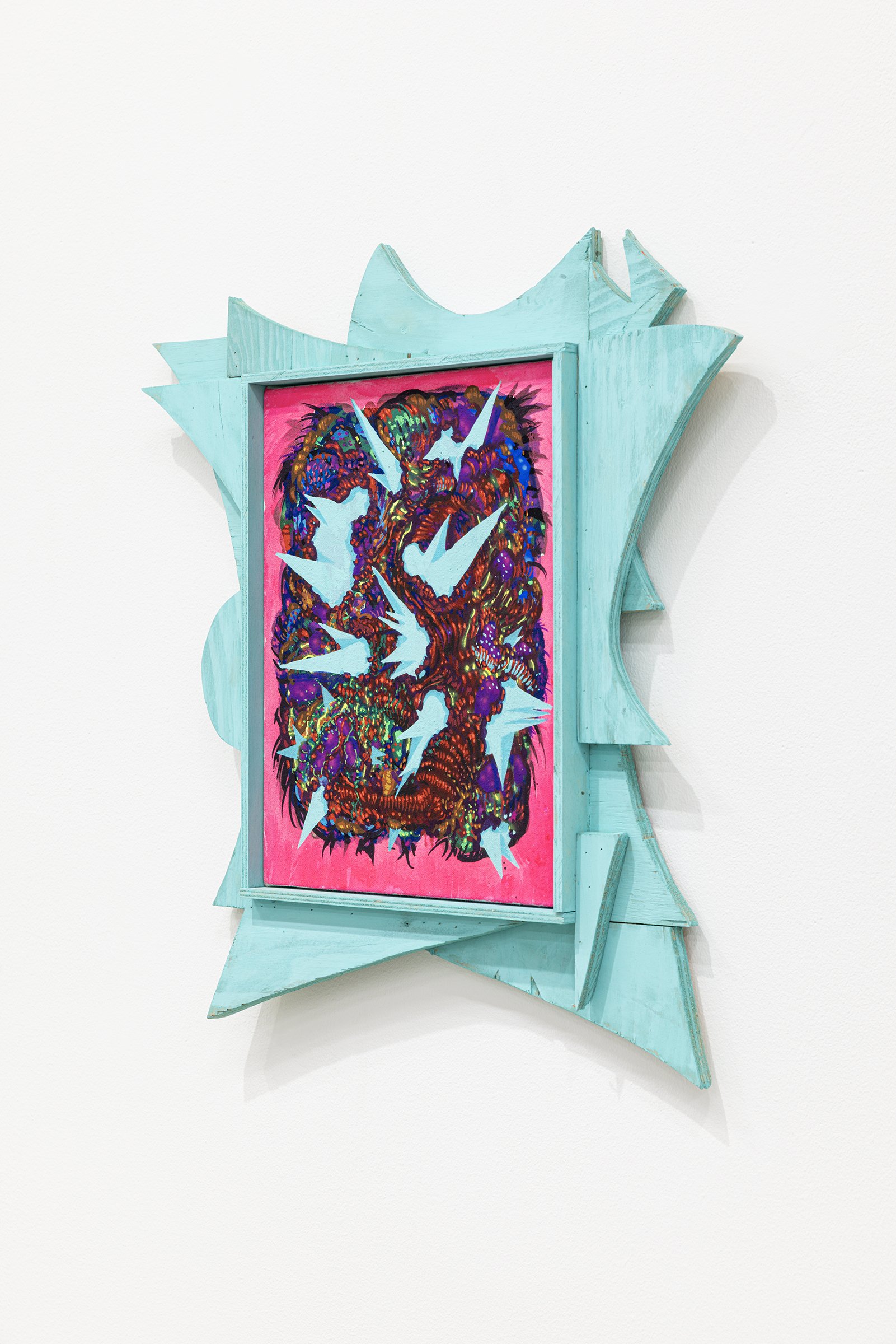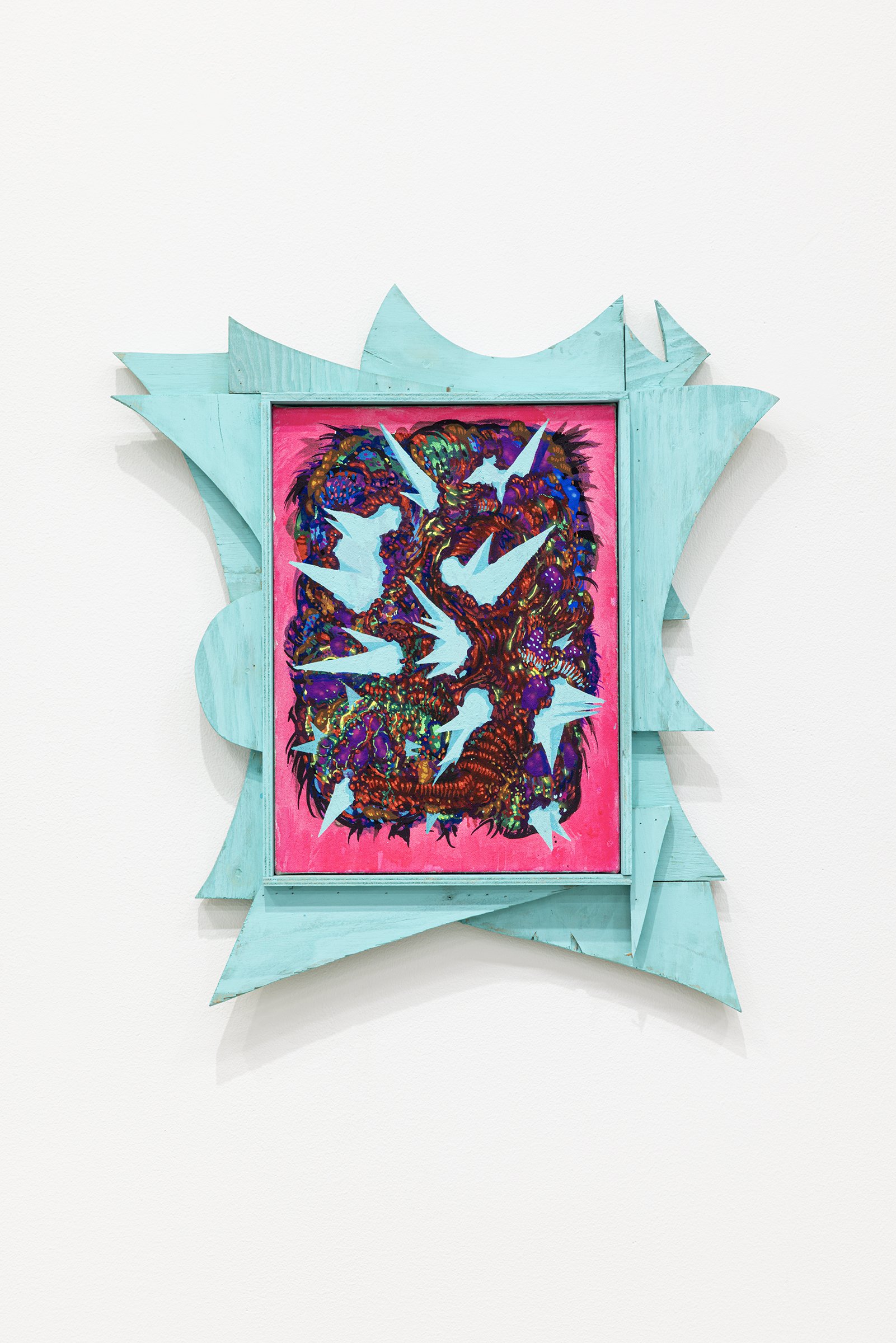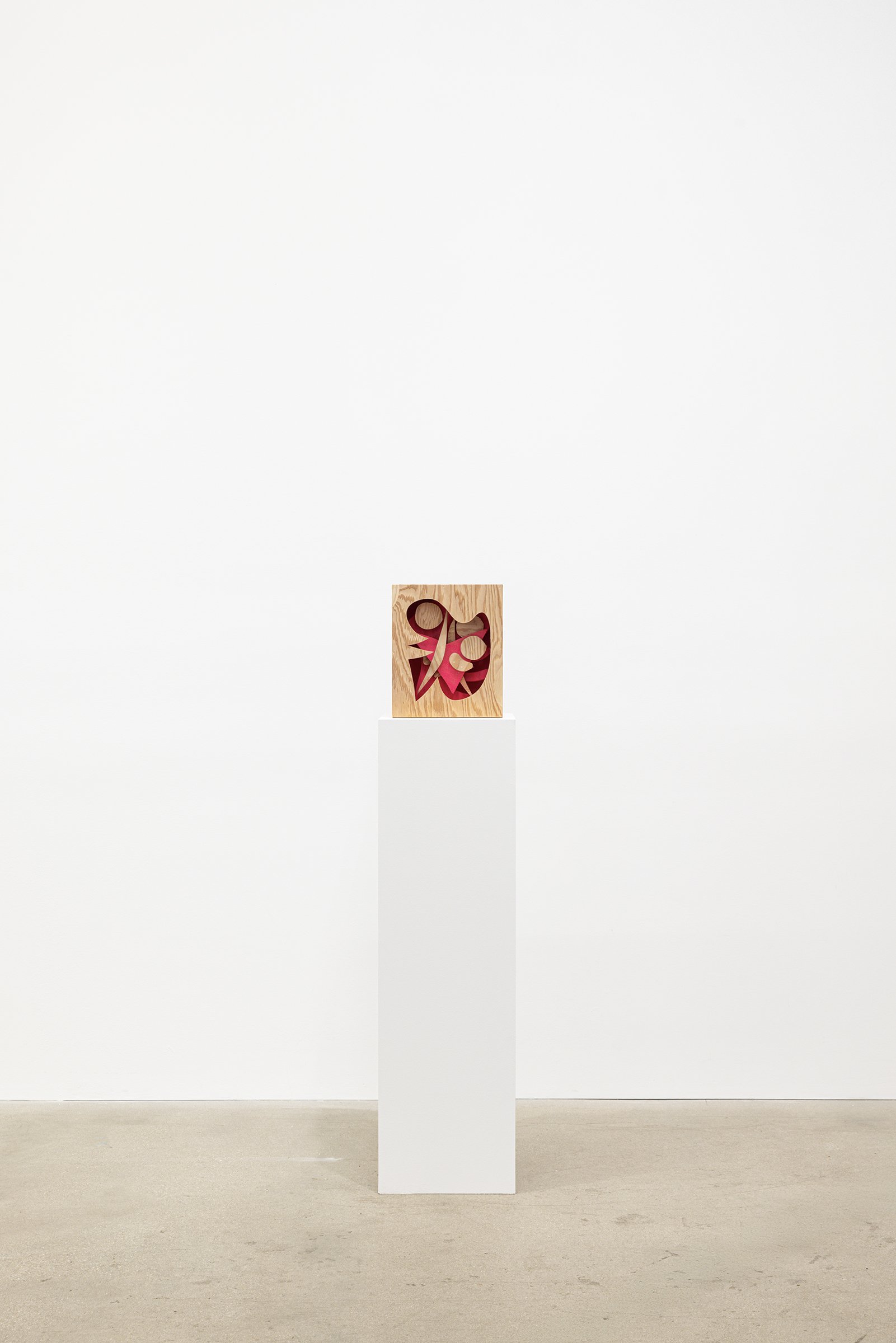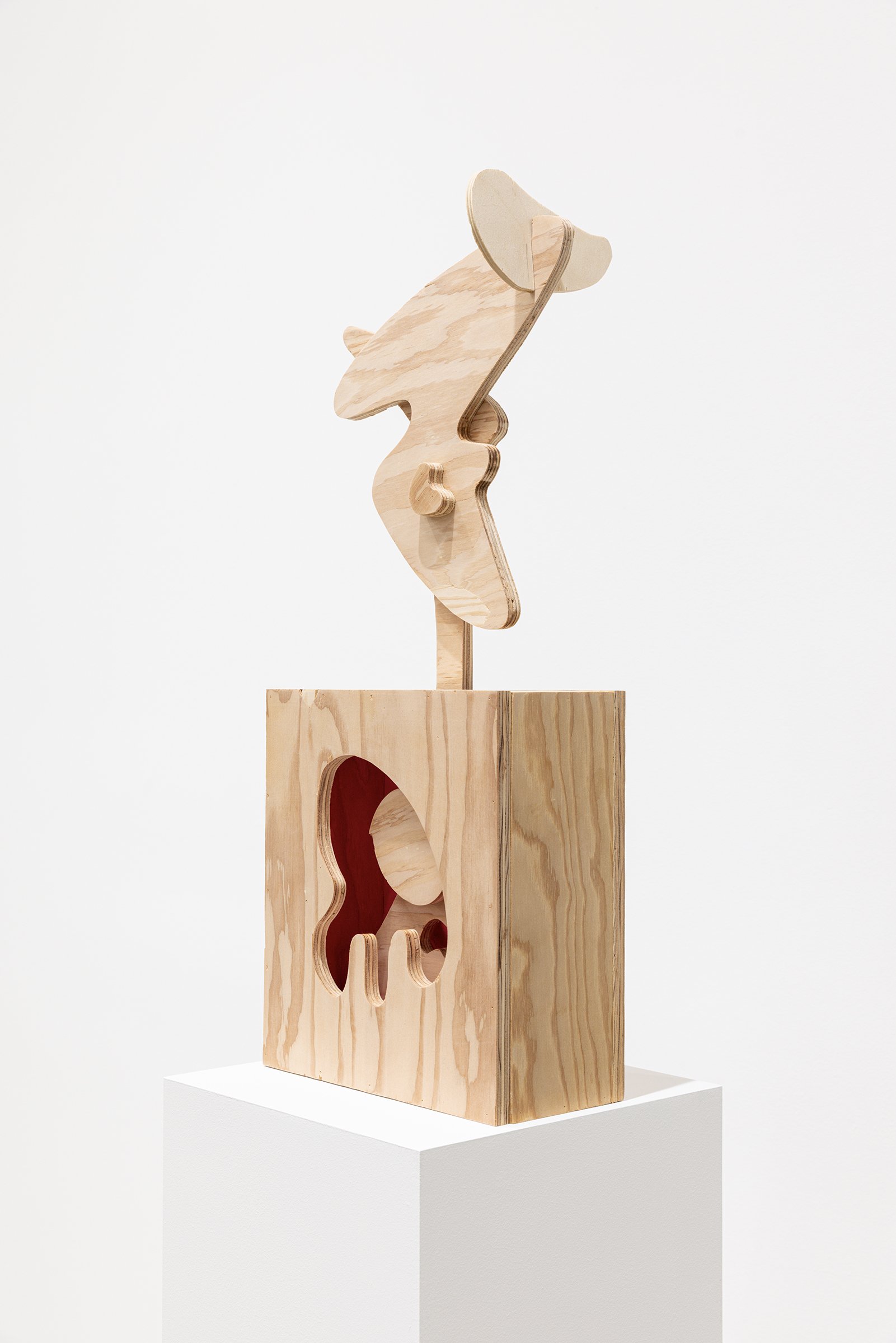 Aaron Curry (b. 1972) has charted a unique space for his work between the most sub-underground mania of the American pulp grotesque (think comix culture and the surreal side of sleazy commercialism) and the most refined formal elements of European high modernism (think Arp, Miro, Picasso). Based primarily in floor sculpture, his practice moves wildly between mediums, attaching to the walls (paintings, 3-D hanging boxes, collages), spreading into print (books, magazines, newsprint), as well as music and video. An avid historian of offbeat cultural materials, he synthesizes these points of reference in works that are often awash in dizzyingly clashing colors, hyperactive Matta-esque motion, and an ingenuity of construction that is as beautiful as it can be baffling. In Raw Dog, Curry introduces a new component to his wood sculptures, which is to leave them largely unpainted, allowing the natural grain of the material, its whorls and knots and eyes, to carry that sense of flow. Occasional flashes of hot pink, turquoise, and grape purple complement the tanscapes on several boxes and flatworks, while two human-scale sculptures are resolutely wooden, with cut away holes and curvilinear forms dancing with the wood's own patterns, the whole work suggesting a figure, cock's comb perched atop. One large painting compresses all the color that might have been in the other works into a single, atomically-charged abstract canvas.