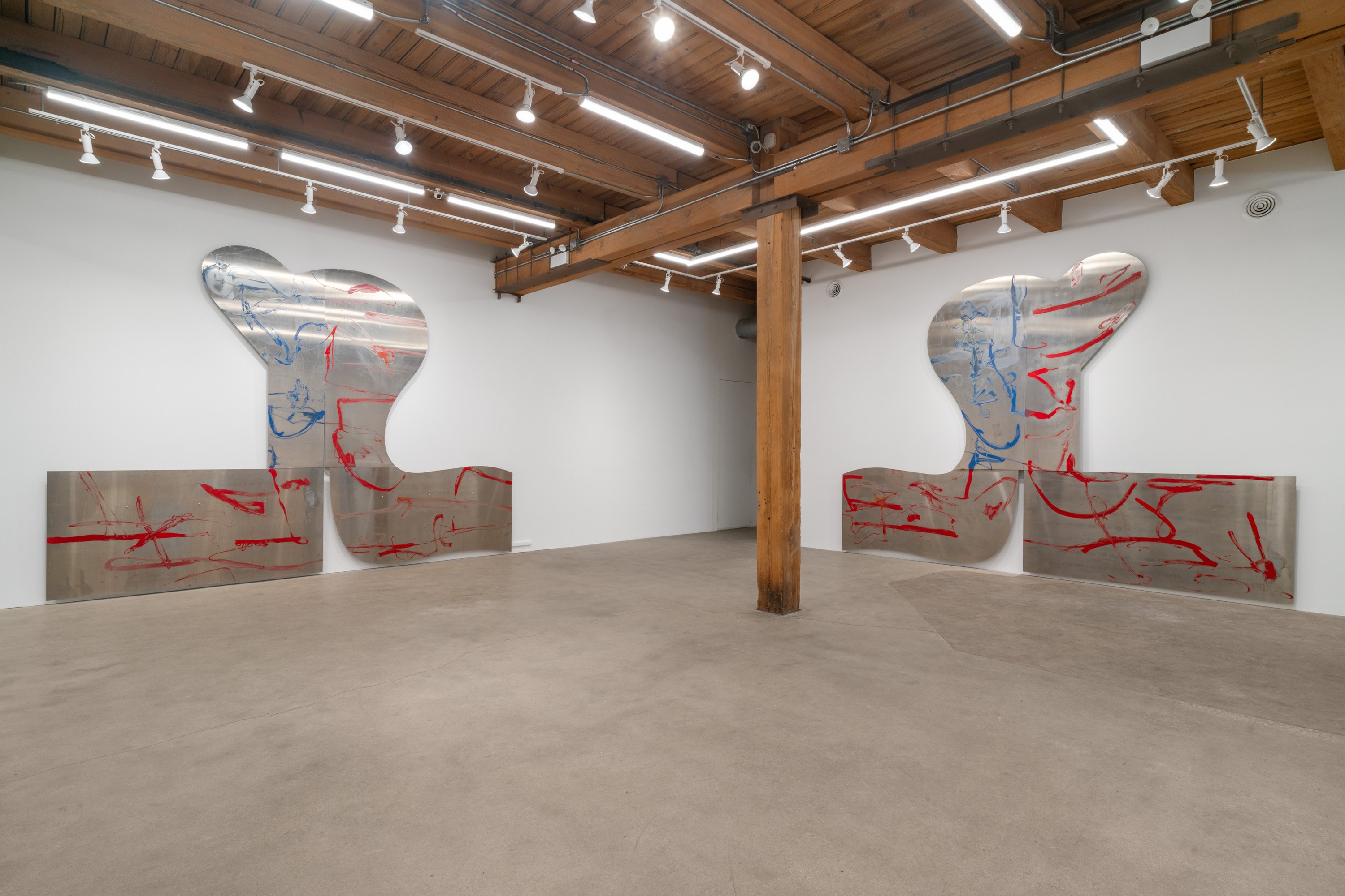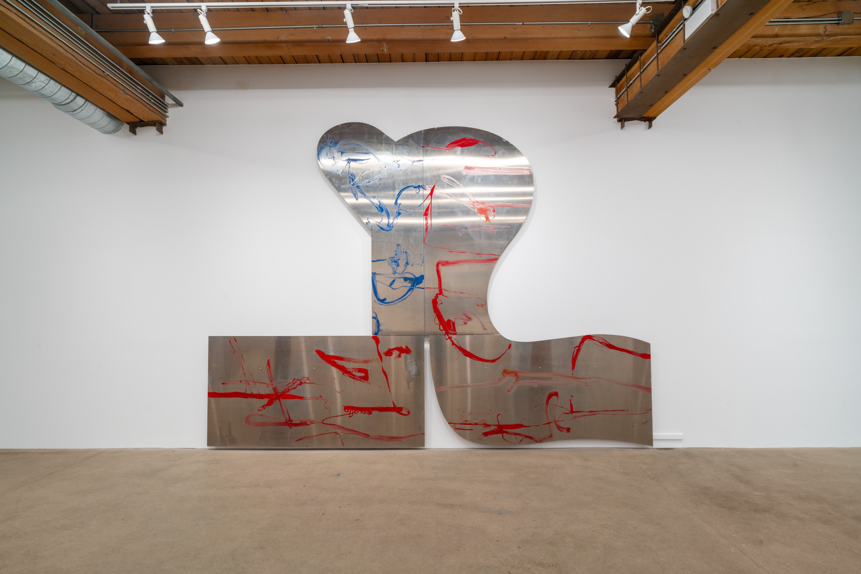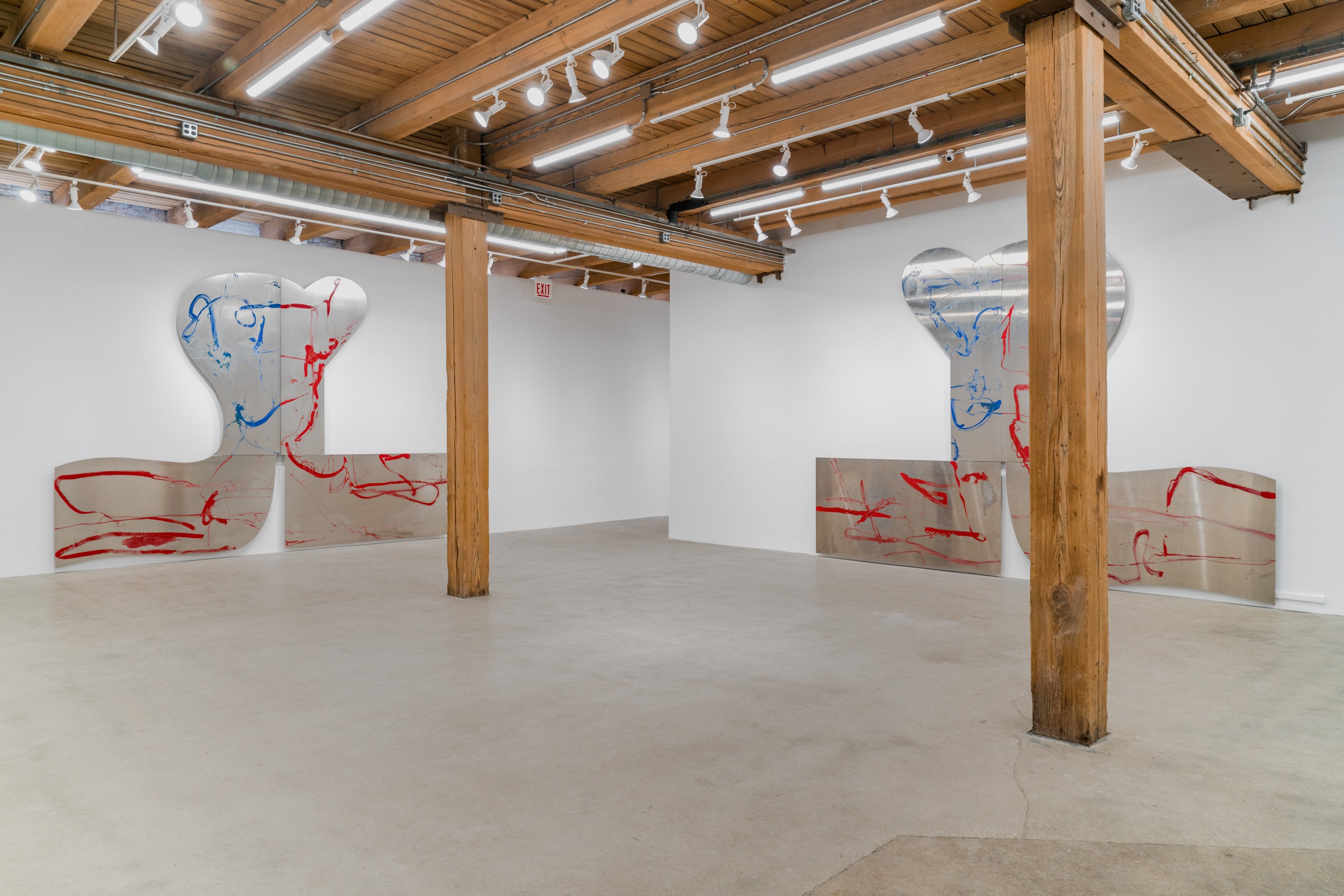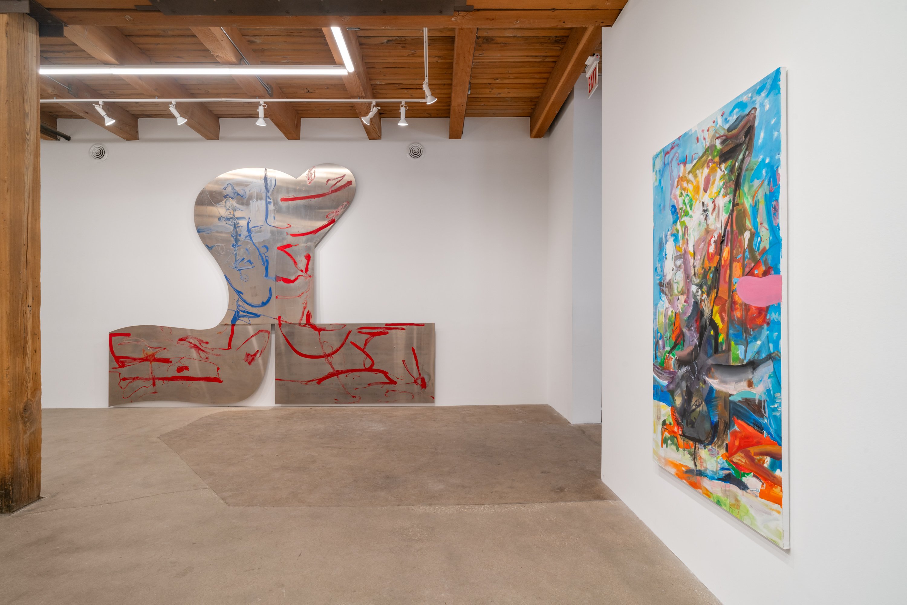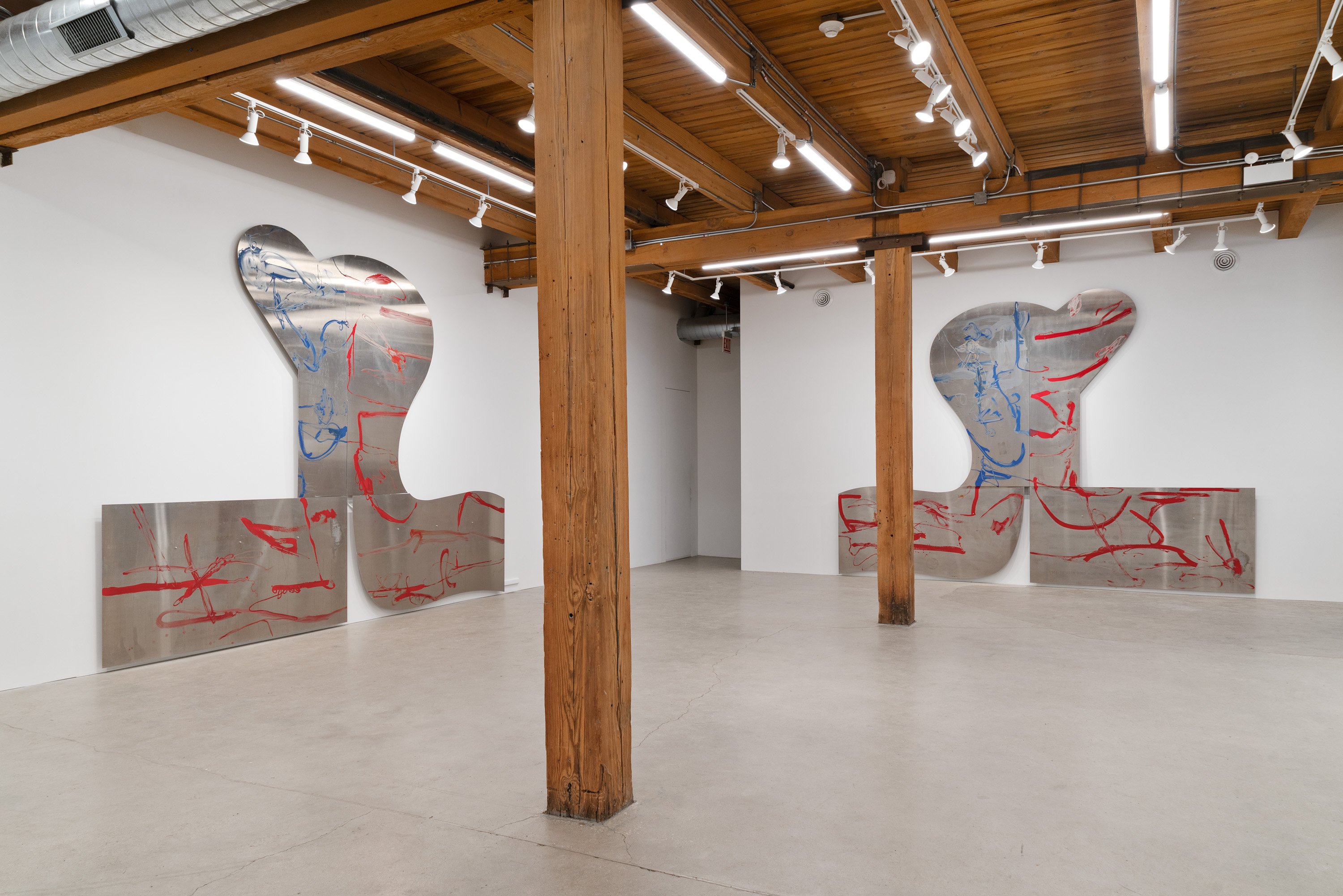 In this exhibition, German-born artist Albert Oehlen presents three monumental pieces on shaped aluminum. With enamel paint marks applied directly to the raw substates, which are cut into “omega” shapes similar to those of some newer Oehlen works, these 12-foot-tall, 15-foot-wide metal paintings come equipped with sonic transducers on each of their four adjacent panels. When amplified, the paintings act as de facto speakers and project sound vibrations into the room. Oehlen invited Kim Gordon to make soundtracks for the works. She developed these sound recordings in direct material relationship with the paintings, using the transduced metal plates as amplifiers for her electric guitar. Rather than simply making these sounds for the paintings, she made the sounds on them. Gordon’s bracing improvisations, lasting around 8-minutes each, explore a wide range of colors, from chords, drone, and feedback to electrical noises made with the unplugged guitar cord. The works play intermittently, erupting energetically, then relaxing into silence, their metal forms and the gestural lines inscribed on them supercharged by Gordon’s music. In addition to these three works made collaboratively by the two artists, the exhibition presents a new canvas by Oehlen and a group of small, vibrant paintings by Gordon.