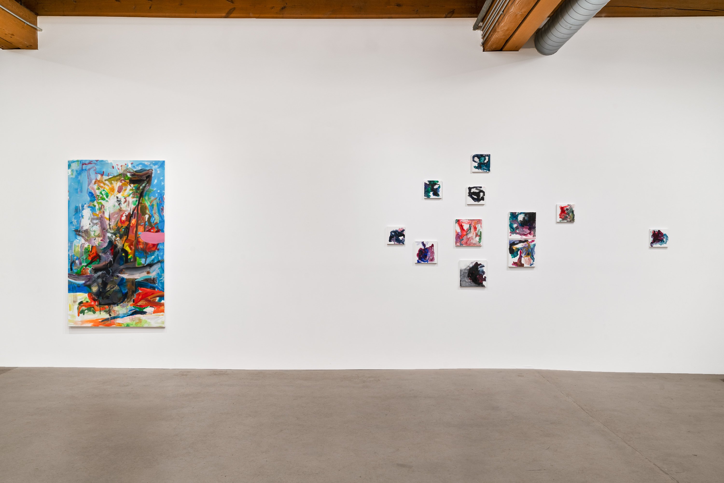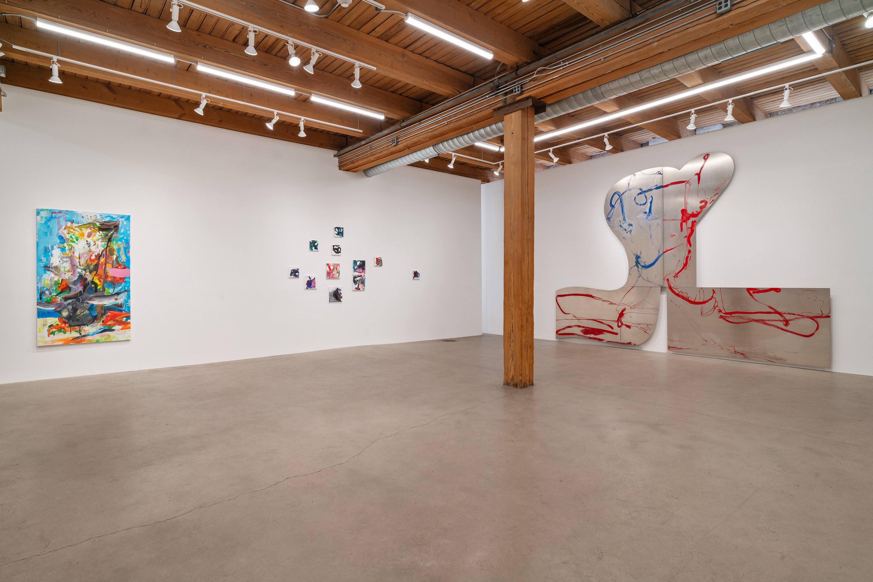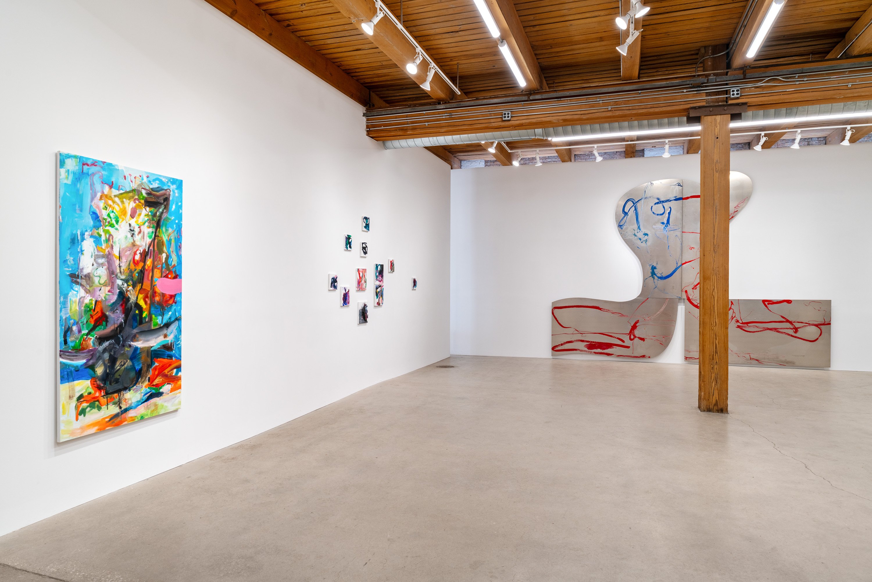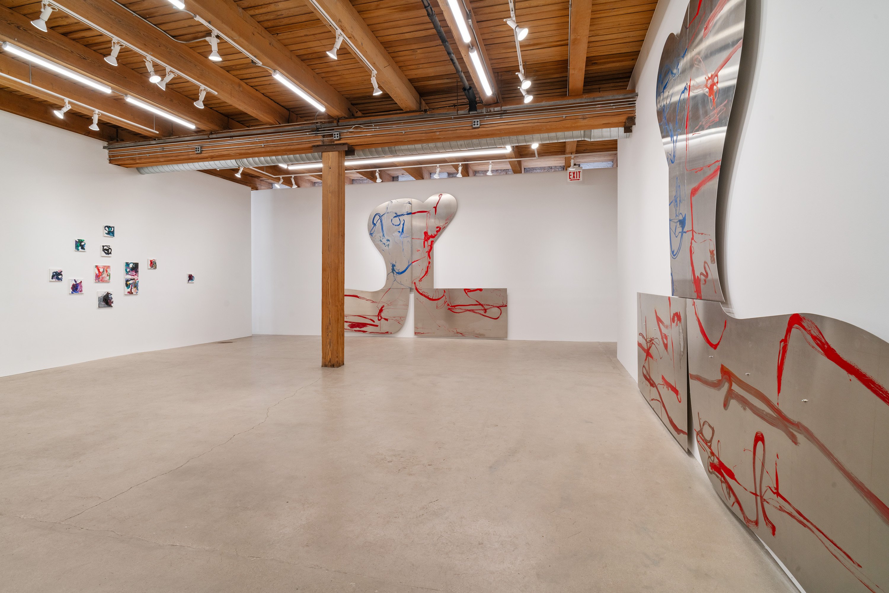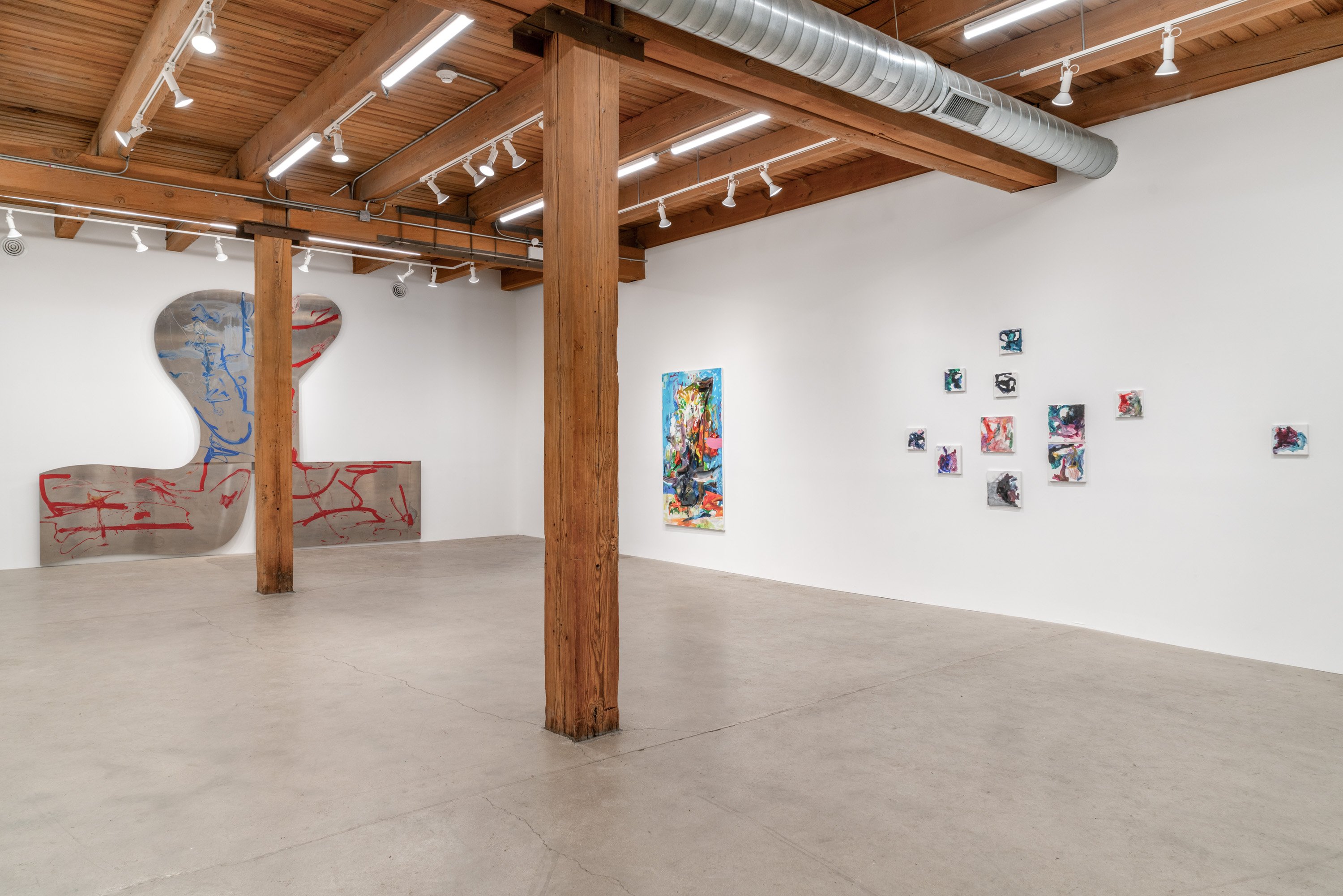 In this exhibition, German-born artist Albert Oehlen presents three monumental pieces on shaped aluminum. With enamel paint marks applied directly to the raw substates, which are cut into “omega” shapes similar to those of some newer Oehlen works, these 12-foot-tall, 15-foot-wide metal paintings come equipped with sonic transducers on each of their four adjacent panels. When amplified, the paintings act as de facto speakers and project sound vibrations into the room. Oehlen invited Kim Gordon to make soundtracks for the works. She developed these sound recordings in direct material relationship with the paintings, using the transduced metal plates as amplifiers for her electric guitar. Rather than simply making these sounds for the paintings, she made the sounds on them. Gordon’s bracing improvisations, lasting around 8-minutes each, explore a wide range of colors, from chords, drone, and feedback to electrical noises made with the unplugged guitar cord. The works play intermittently, erupting energetically, then relaxing into silence, their metal forms and the gestural lines inscribed on them supercharged by Gordon’s music. In addition to these three works made collaboratively by the two artists, the exhibition presents a new canvas by Oehlen and a group of small, vibrant paintings by Gordon.