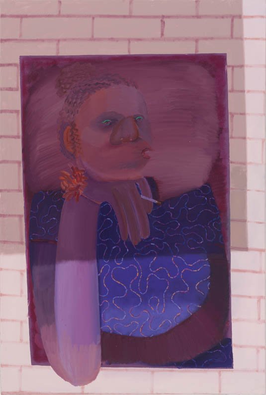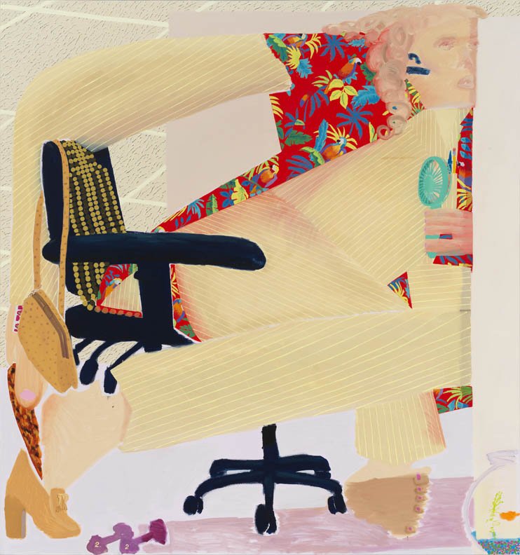 Celeste Rapone’s paintings share Odom’s commitment to the everyday, but where Odom’s work always insinuates an absent human, Rapone hides her figures in complex, often labyrinthine compositions. Narrative, situational paintings, they are portraits of singular women (and a few men), or pairs of figures, in some thematically specific context drawn from a job or activity, unfamiliar to Rapone, that she might do if she fails as a painter. Arms and legs are convoluted into impossible shapes, hints of flesh showing where the body is but clothes and objects obscuring the integrity of the being. In “Everlast,” a boxer’s gloves arch up from the bottom of the canvas, a checkered ring swallowing the torso; “Girl Friday” features an office worker depicted from a low perspective made more claustrophobic by a drop ceiling. In “Working,” a red-faced woman in work boots strains over her Thighmaster, a ruler slyly assessing progress at painting’s bottom. These elements are all executed with sensitivity to facture, surfaces exuding painterly life, patterns pushing hard against organic forms. The large “Big Reach” finds two rock climbers working a wall; their physiques are shaped by their task to the point that they are turned in on themselves, even as one of them holds aloft a cell phone for a selfie. Playful and at times darkly sociological, these paintings are spectacular concatenations of light and limb, bittersweet caricatures of ambition and defeat, and most of all intricate constructions of pigment and form.