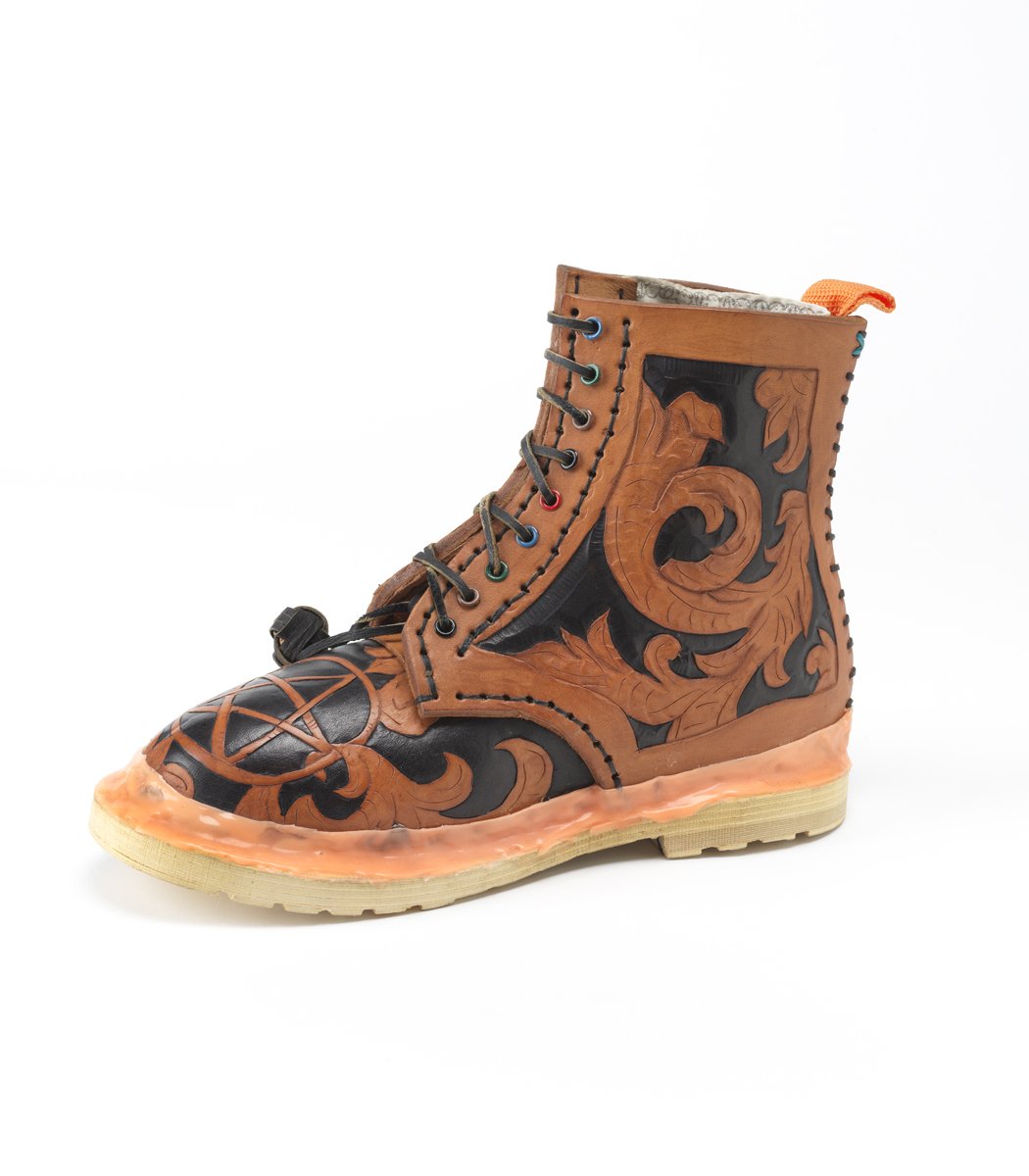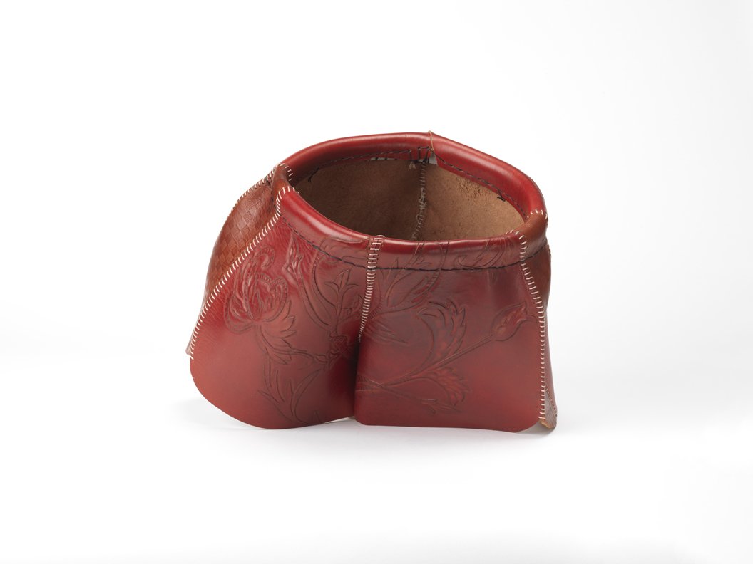 culptor Betsy Odom works in common materials – leather, in particular, but also fabric, cork, plywood, strapping, grommets, foam, and underwear elastic. A magician of the quotid- ian, she fabricates articles of clothing, often sports-related gear, gently but persuasively undoing their overdetermined cultural associations and rebuilding them from square one. A pair of gym shorts, “Gym Shorts,” for instance, stands on its own, rigid, caught in motion, perhaps conjuring athletic clothing that’s been left in the locker too long, but also offering a host of beautiful mahogany bumps and curves, its perfectly tooled surface as sensuous as it is uncanny. The catcher’s mitt of “Bulldog 10” carries a lesbian-centric visual pun, while the exquisite detailing on a black dog glove, lined with shearling wool, on “Schutzhund Glove,” has a latent intimation of BDSM. Odom’s objects are humorous, but rigorous. Like H.C. Westermann, her meticulousness of craftsmanship is always at the service of the artistic idea, be it conceptual or aesthetic. Two immaculate, eye-fooling articles of footwear, “Birken- stock” and “Doc” (a bedazzling Doc Marten) show the range, from patchouli to punk