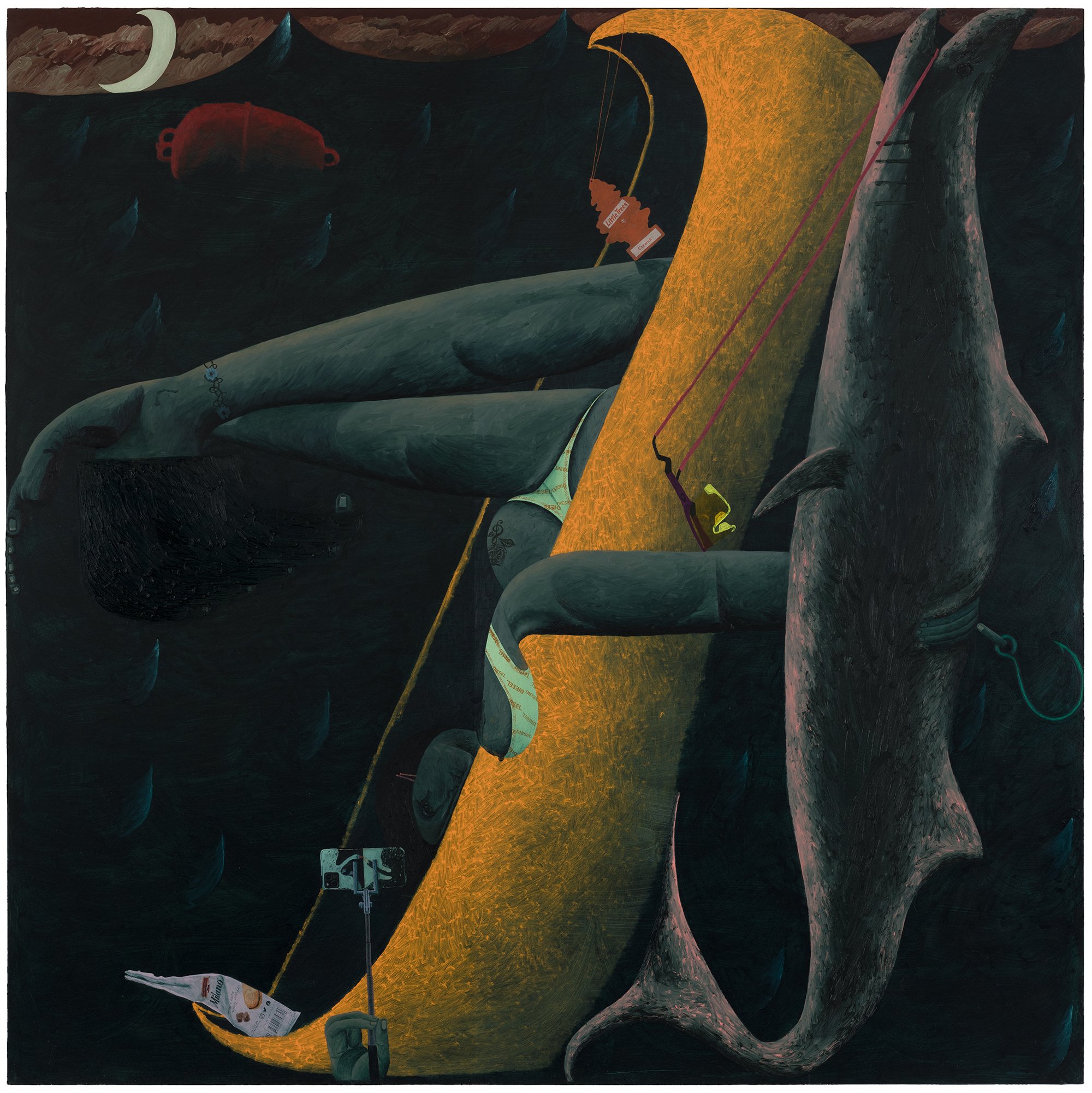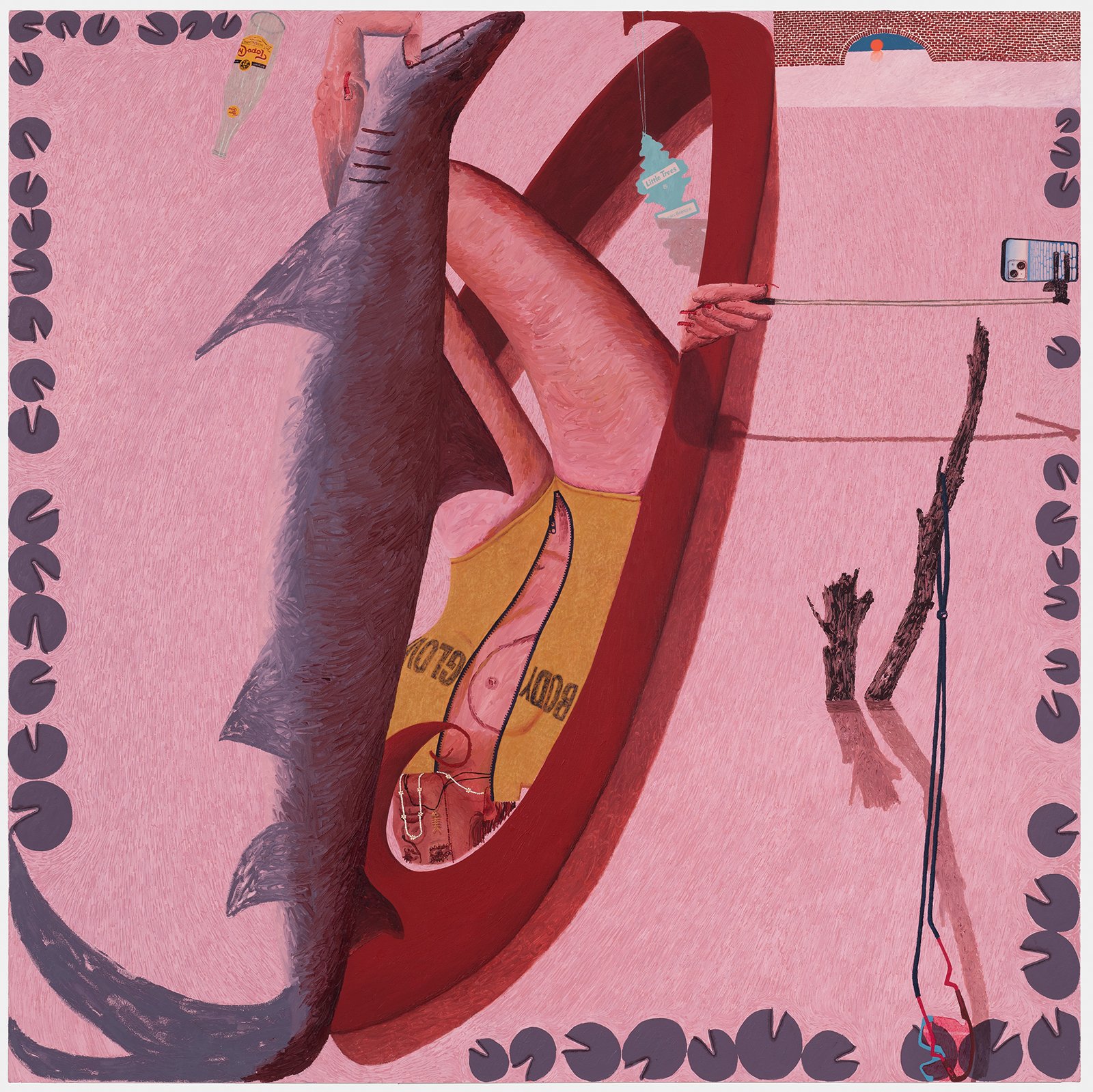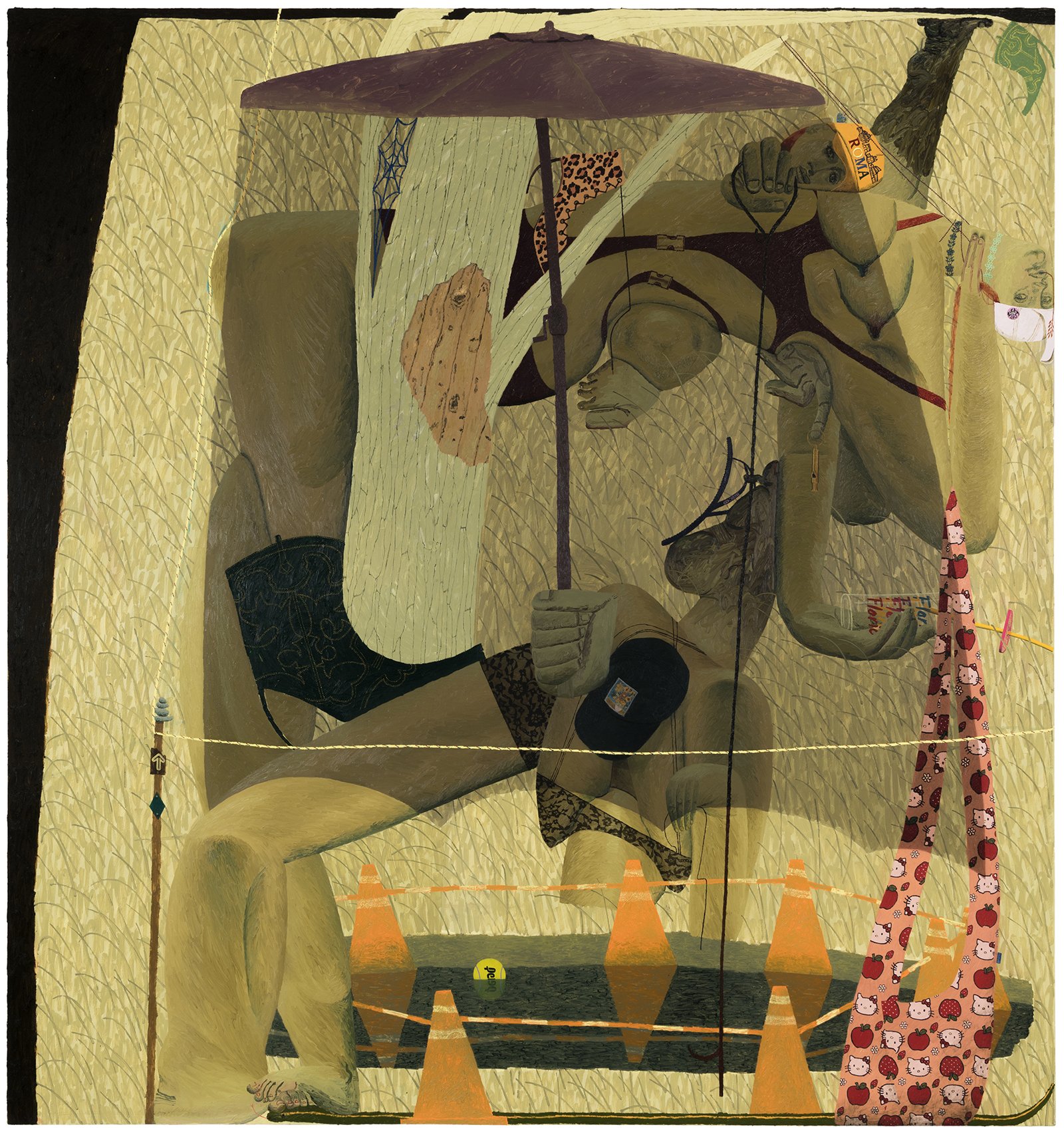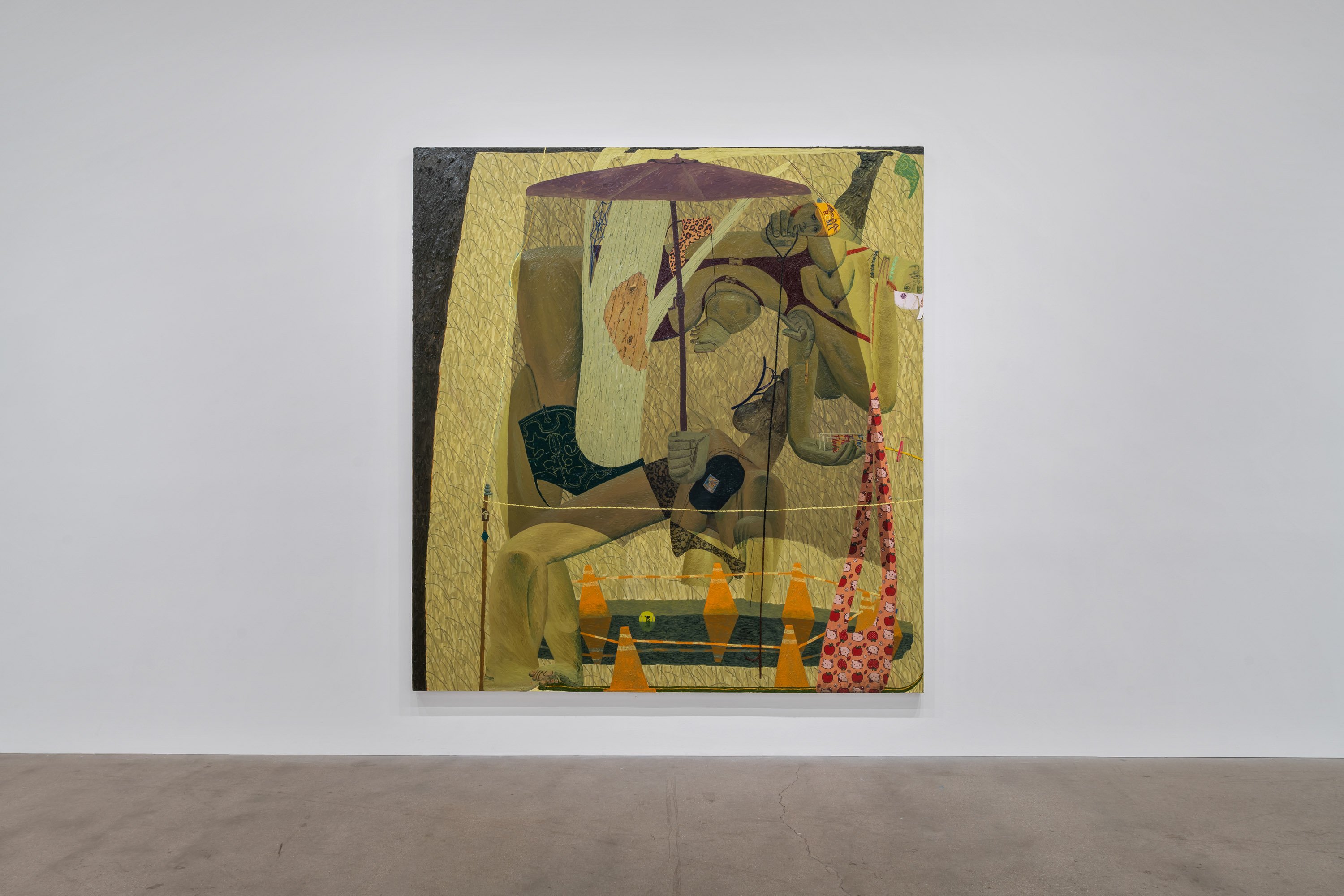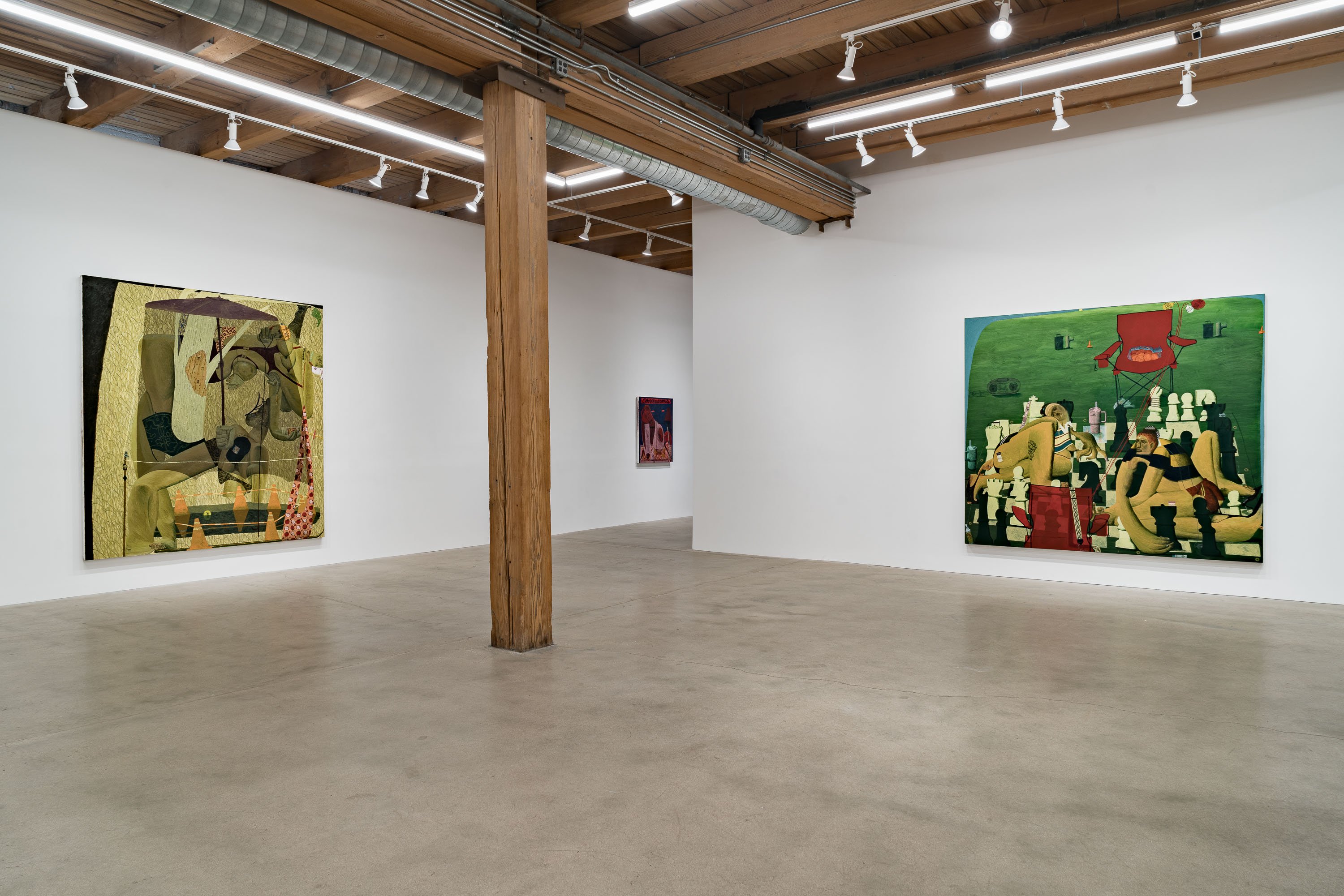 As always, Rapone's compositions are spatially complex and require time to unpack – details (often hilarious references to popular or mass cultural objects and their attendant packaging) jostle with general forms (bodies, landscape, architecture) in ways that surprise and delight the careful viewer. Rapone paints alla prima, applying her materials directly, with no preparatory sketches, so the metaphor of over-preparedness that permeates these scenes is, for her, in an inverse relationship to her method of image-making, which is highly improvisatory and intuitive, starting with very basic color or shape ideas and building from that. She's thinking about painting strategies, history painting, the big picture in all senses. "What I was interested in with a comparison to chess is how in painting you make a series of choices and can't be sure how they'll unfold or respond to one another," says Rapone. "You keep going and try to enter from different angles until something opens up. And many times you lose. But then you get to try over and over and over again." Virtuosically painted, deploying a dizzying array of techniques in each composition, the scenarios of Big Chess chart a line between pathos and the pathetic, between aspiration and cringiness, all by means of a perspicacious visual imagination and uproarious sense of humor.