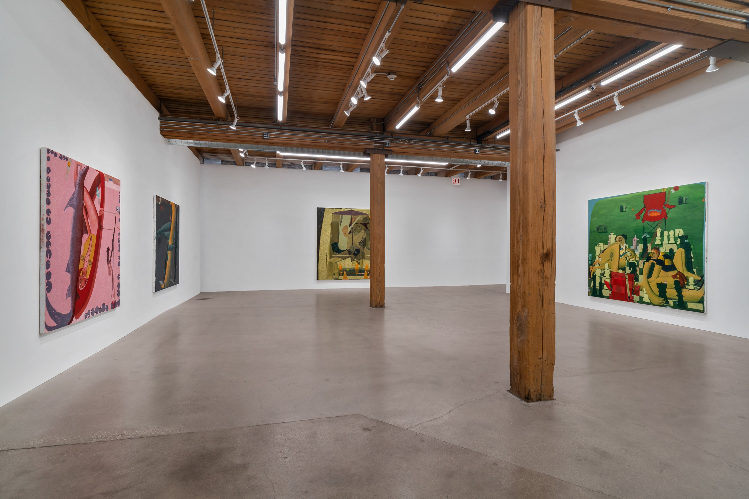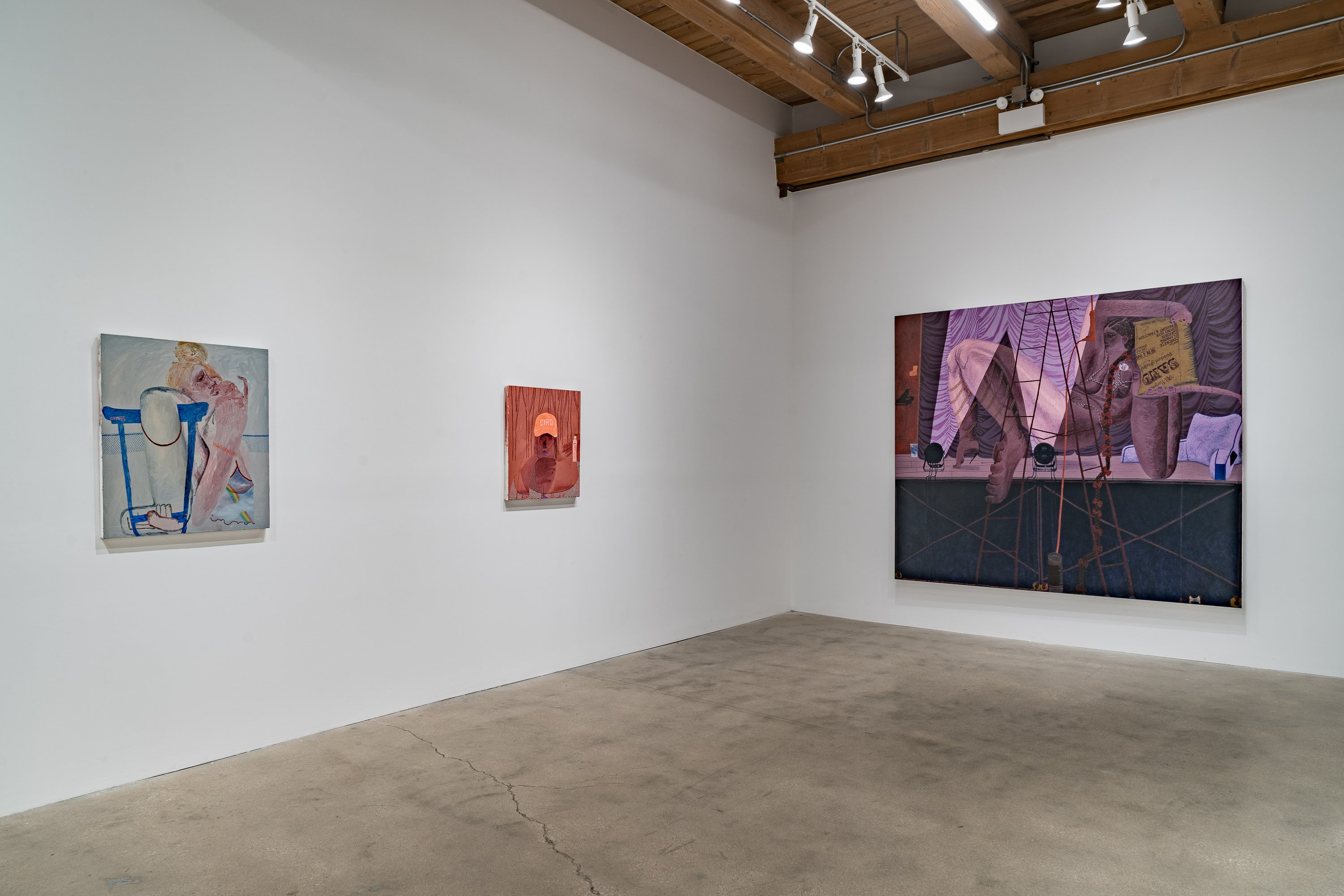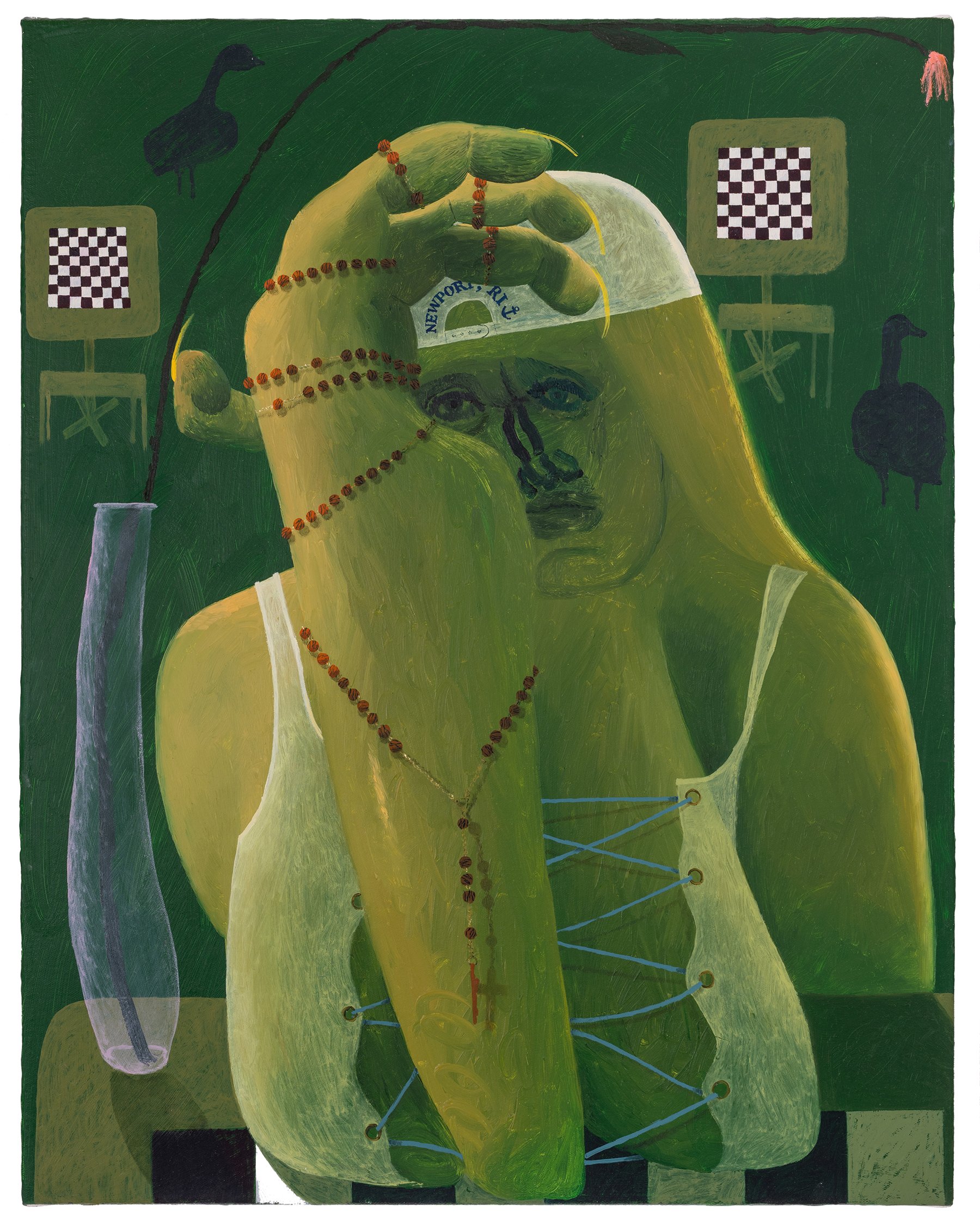 In her most recent group of paintings, Celeste Rapone addresses a certain feeling of embarrassment around the public expression of ambition, especially for women. Something like the hollow conceit of public competitiveness. Rapone divides these eleven canvases into "spectacles" – her large-scale works, which are among the biggest she has yet made (a kind of artistic ambition, certainly an intentional self-reference) – and "spectators" – her small-scale portraits, all of which are dealing with an expression of resignation or regret. In the spectacles, she creates images of women over-performing, reaching extravagantly for the golden ring, with ambivalent or awkward results. Rather than lampoon these figures, they are approached with a kind of oblique empathy, hoisted by their own petards. These works are composed as stage-like tableaus, with women playing oversized chess in the park, hiking up a public trail, spotlit on a proscenium, or shark fishing from a canoe. Their smaller counterparts might be their viewers, women with heads hanging, one selling concessions but also having conceded.