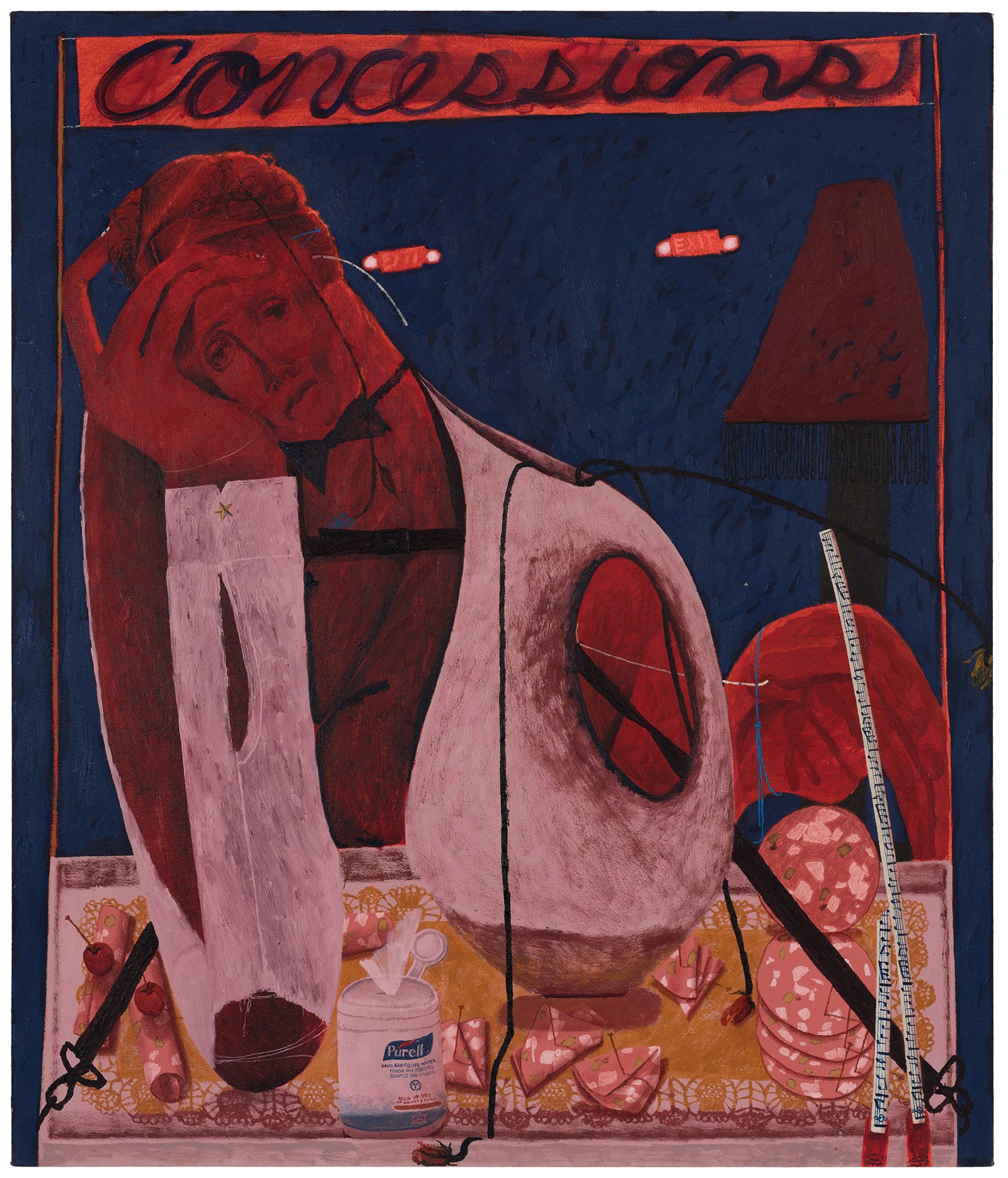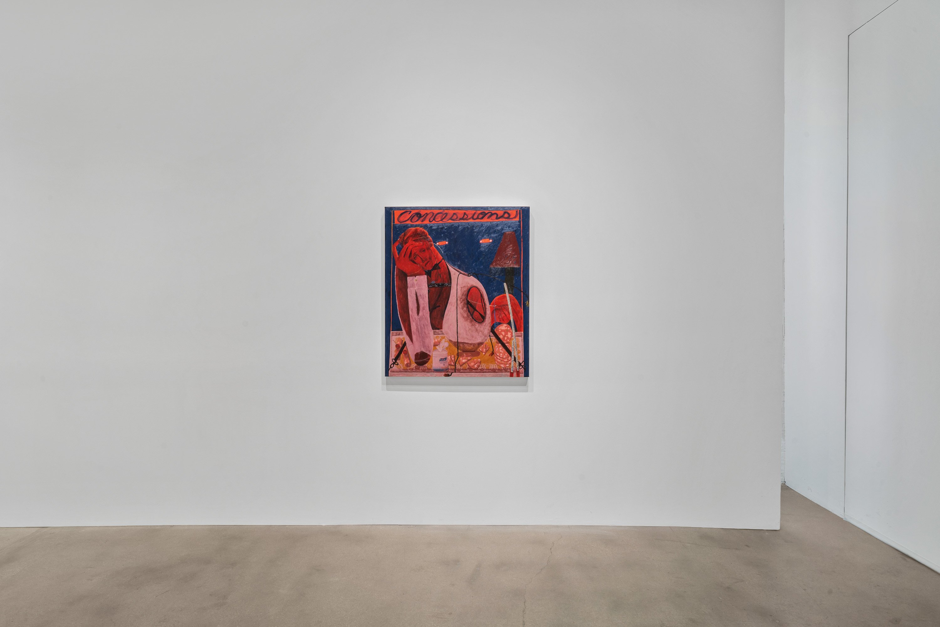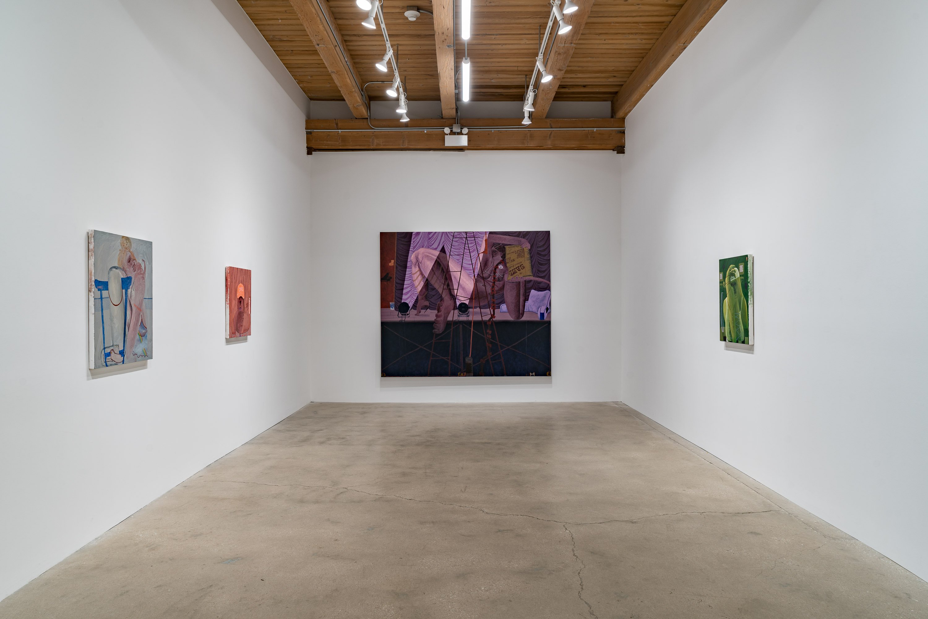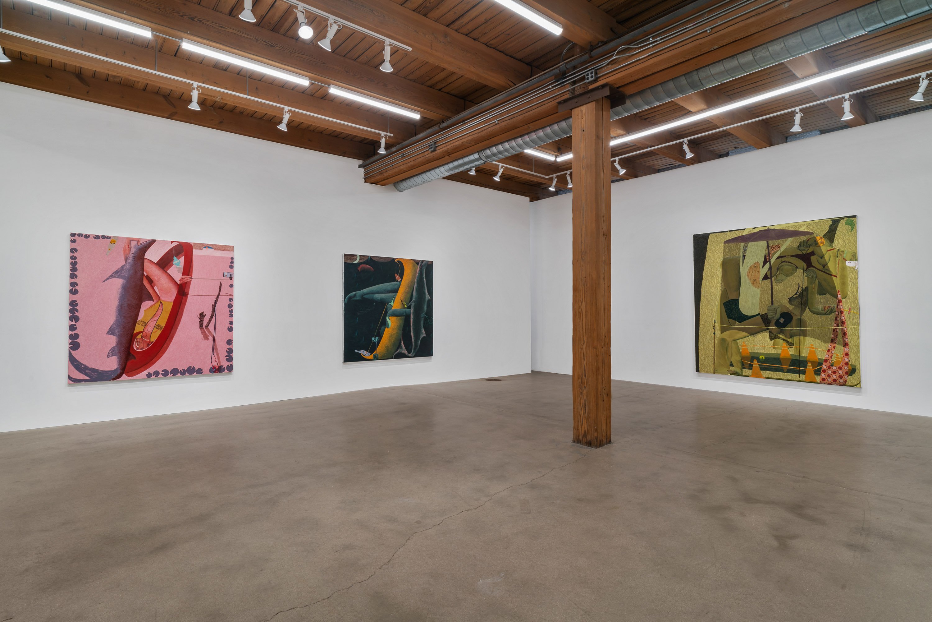 In her most recent group of paintings, Celeste Rapone addresses a certain feeling of embarrassment around the public expression of ambition, especially for women. Something like the hollow conceit of public competitiveness. Rapone divides these eleven canvases into "spectacles" – her large-scale works, which are among the biggest she has yet made (a kind of artistic ambition, certainly an intentional self-reference) – and "spectators" – her small-scale portraits, all of which are dealing with an expression of resignation or regret. In the spectacles, she creates images of women over-performing, reaching extravagantly for the golden ring, with ambivalent or awkward results. Rather than lampoon these figures, they are approached with a kind of oblique empathy, hoisted by their own petards. These works are composed as stage-like tableaus, with women playing oversized chess in the park, hiking up a public trail, spotlit on a proscenium, or shark fishing from a canoe. Their smaller counterparts might be their viewers, women with heads hanging, one selling concessions but also having conceded.