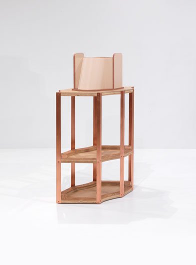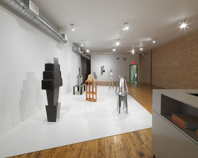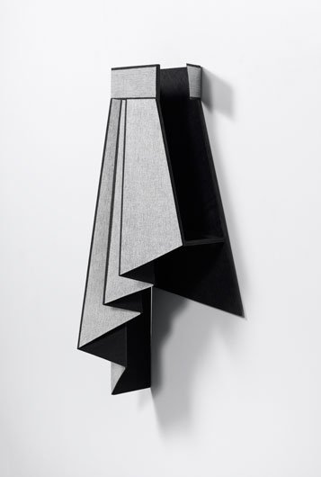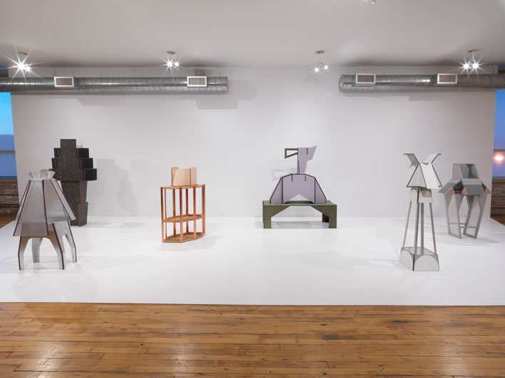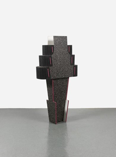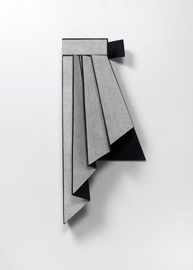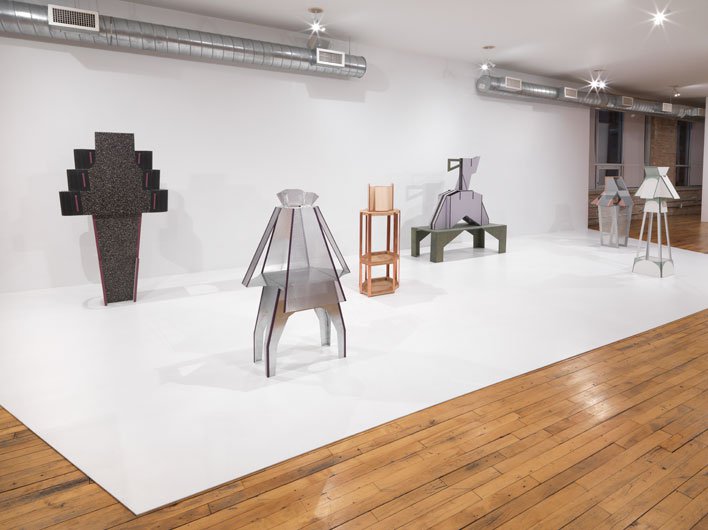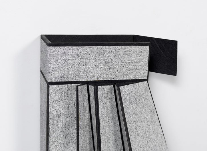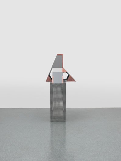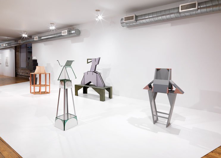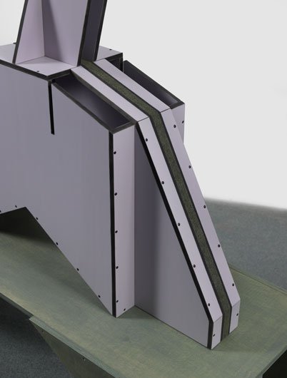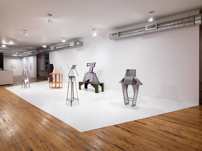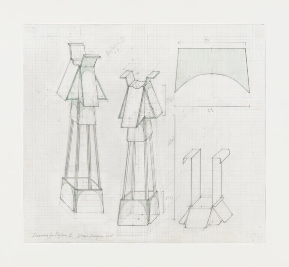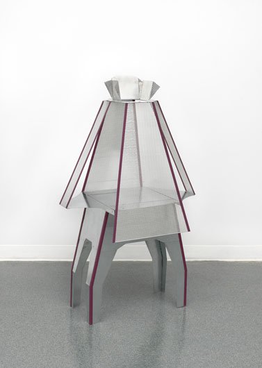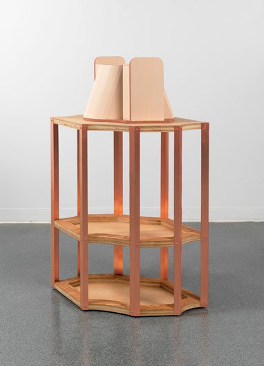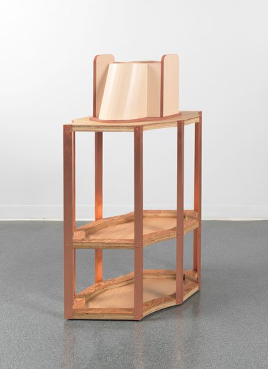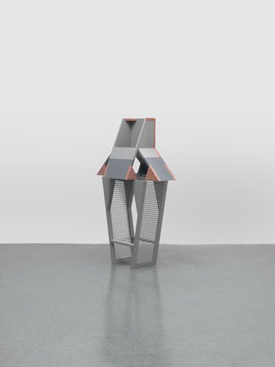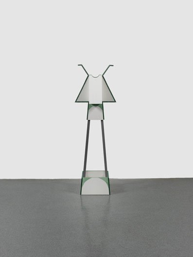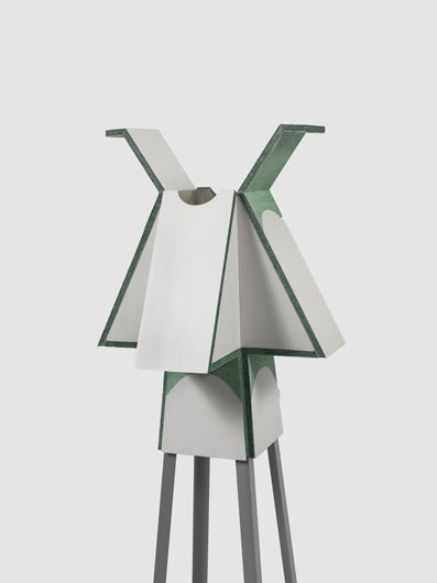 Continuing a line of inquiry that she’s been diligently and exhaustively following since the 1970s, Simpson constructs artworks that examine relationships between clothing and architecture, between design and affect, and between drawing and sculpture. In seven newly unveiled works – six floor-standing and one wall-hanging – she delves primarily into one form: the peplum. As Benjamin Chaffee explains in his catalog essay: “The etymology of the word relates to the Greek word, ‘peplos,’ a long tunic-like garment worn by women in ancient Greece…Today a peplum is a short overskirt designed to be worn over another garment adding a decorative element, a literal flair.” These are human-scale vertical constructions, most of them featuring disparate materials, many industrial in nature, including aluminum, galvanized steel, LDF and MDF (light and medium density fiberboard), linoleum, spunbond polyester, and foamboard, sometimes accenting or patinating them with crayon, enamel, acrylic, or marker. Simpson is always acutely aware of angles, plying complexes of nested shapes as she superimposes one upon another, forcing geometry to yield a sort of grace. The resulting works call into play the constructed quality of human presentation, recalling Hugo Ball’s dada costumes, constructivist painting, and modernist design, but looking like nothing but Diane Simpson. In the last five years, Simpson has been steadily rising in international visibility, with a stunning survey at the ICA, Boston (2015-16) and a beautiful exhibition at the MCA, Chicago (2016), as well as solo shows in London (Herald St.) and New York (JTT), and group shows in Berlin, New York, Los Angeles, Glasgow, Portland (OR), and Washington DC. In addition to her new sculptures, Simpson will show several related drawings. The exhibition is accompanied by a full-color 56-page catalog with essays by Chaffee and Tessa Paneth-Pollak.