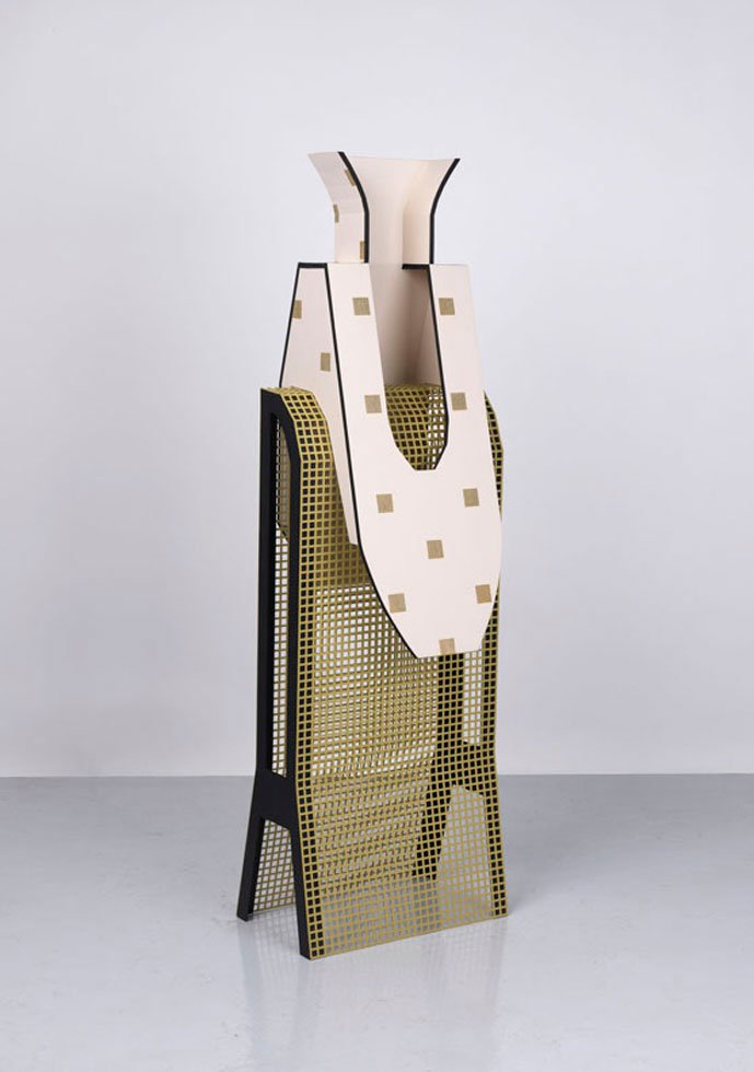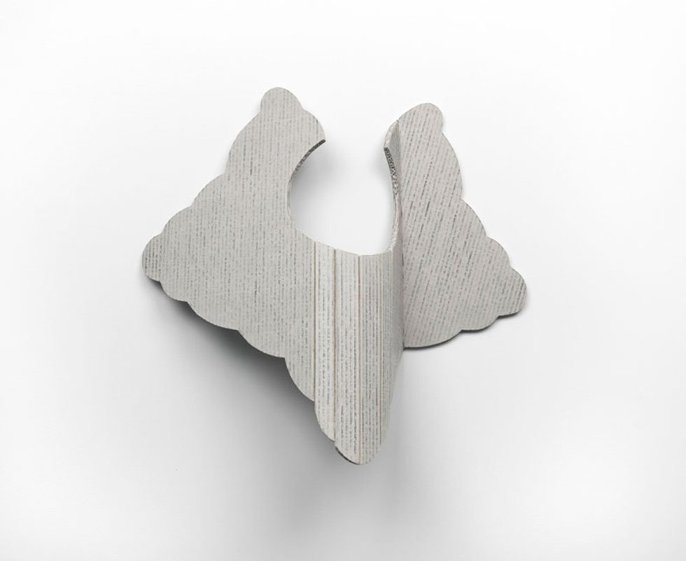Exploring a liminal zone between abstraction and figuration, her sculpture starts with intensive studies in fashion, extracting the human (left as an insinuation) and focusing on the architecture of the attire, its inherent tensions and relaxations, out of which Simpson extrapolates entirely original forms. A collar, a cuff, a hem – each part of a piece of clothing is fodder for formal play, deconstruction and reconstruction. An intense and detail-fixated craftswoman, firmly in the same Windy City tradition as H.C. Westermann, she has worked in diverse materials, including cardboard, MDF, wood, fabric, paper, aluminum, and vintage linoleum, all with a meticulous finish and an aggressive sense of design.