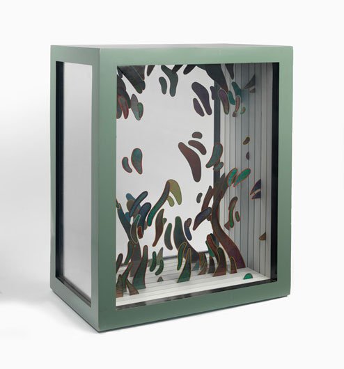 In the late 1960s, Flood (1944-1985) was associated with the Chicago Imagists. He showed at the Hyde Park Art Center with the Non-Plussed Some, the same exhibition group that debuted Ed Paschke and Sarah Canright. By the early 1970s, Flood and Canright (who were married) moved to New York, where Flood’s concept began to shift. This exhibition spotlights the new and very different work he made between 1973 and 1979, marking changes in aesthetic, materials and medium. The earliest of these works continue Flood’s Imagist mode, featuring box constructions with multiple layers of Plexiglas, on which squiggling aquatic forms are back-painted, dispersed in the space like floating paramecia. In 1975, Flood began to think of the room of exhibition as the box, and he moved the shapes gradually out into the space, in the process making them into sculptures.
