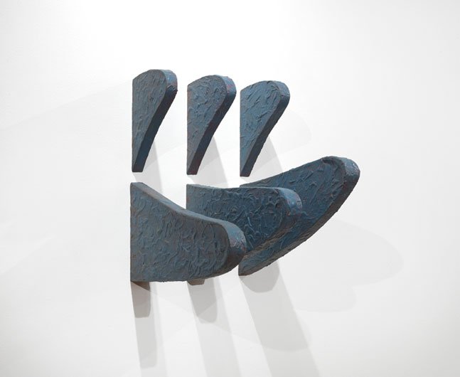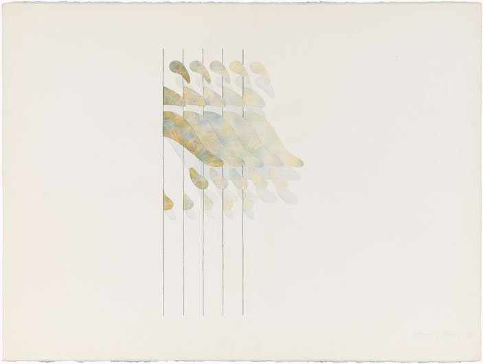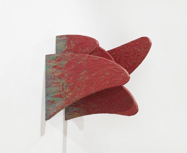 The exhibition will feature a group of small models from ’76, shelf scale, that show how he’s reconsidering the way these interlaced fin-like shapes negotiate the relationship between floor and wall. By decade’s end, Flood was constructing wall-hanging fins, arranged in clusters, thickly painted, sometimes in bright colors. In aggregate, like schools of fish, these works suggest tandem motion. In the same period, Flood painted a series of related watercolors on handmade paper. The show surveys this extraordinary and lesser-known period in Flood’s tragically short career, with superb examples of each genre, including the boxes, the models, the fins and the watercolors.