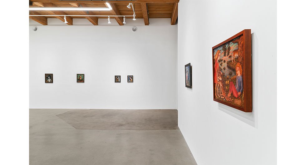 Gina Litherland has been exploring a personal approach to image-making for over four decades, interweaving strands drawn from mythology, literature, film, folklore, and natural history, in a visual style that connects her with Northern Renaissance portraiture and Magic Realists such as Remedios Varo and Leonora Carrington. However Litherland describes this most recent body of paintings as “the most personal work I’ve ever done, drawing on experience and inner wanderings, exploring a visual language more than literal language.” Some of the scenes in her narrative or allegorical paintings are drawn from a library of ideas and images she absorbed “by osmosis” while working at the Occult Bookstore in Chicago, before she settled outside Milwaukee, where she has lived and worked for the last thirty years. For instance, the painting “Pistis Sophia” takes its title from an obscure Gnostic text, the title meaning something like “faith and wisdom.” In Litherland’s case the allusion is to a kind of female emanation of wisdom, the picture’s story drawing on the artist’s remembrance of releasing pet tadpoles in a swamp when she was a little girl. All the works are executed in oil on panel, some adding India ink, and each one is meticulously painted, resplendent in its extraordinary attention to detail and representation of texture, intensities of radiance, chromaticism, shadow, and reflectivity. One of the works in the show that relates directly to an artistic precedent is “The Gods,” a vivid opera house interior image of a crowd as seen from just behind a stage full of actors, which refers to the WWII-era film Children of Paradise by Marcel Carné. “In the film, the Gods are the people in the cheap seats, the true audience, as well as the actors themselves,” says Litherland. “The film bounces back and forth, revealing the deep hidden relationship between the artist and the audience.” In the painting, just who are the Gods, the players or the viewers, remains ambiguous but brilliantly illuminated. Most of the paintings mix fragments of the animal and human worlds, often in harmony (“Tigers and Wolves are Kind,” “Full Moon on Dog Island”), sometimes, as in an image of a self-admiring mermaid (“The Siren”) and the self-described “Beautiful Wolf Woman,” in a state of full-blown hybridity. All the characters in Litherland’s luminous paintings inhabit liminal spaces, whether they’re lodged inside a tree trunk, on a penumbral coastline, or mysteriously hovering a few feet above the ground. Hers are ecologically-minded images, but they’re rooted in a unique vision of our shared planetary and symbolic atmospheres.