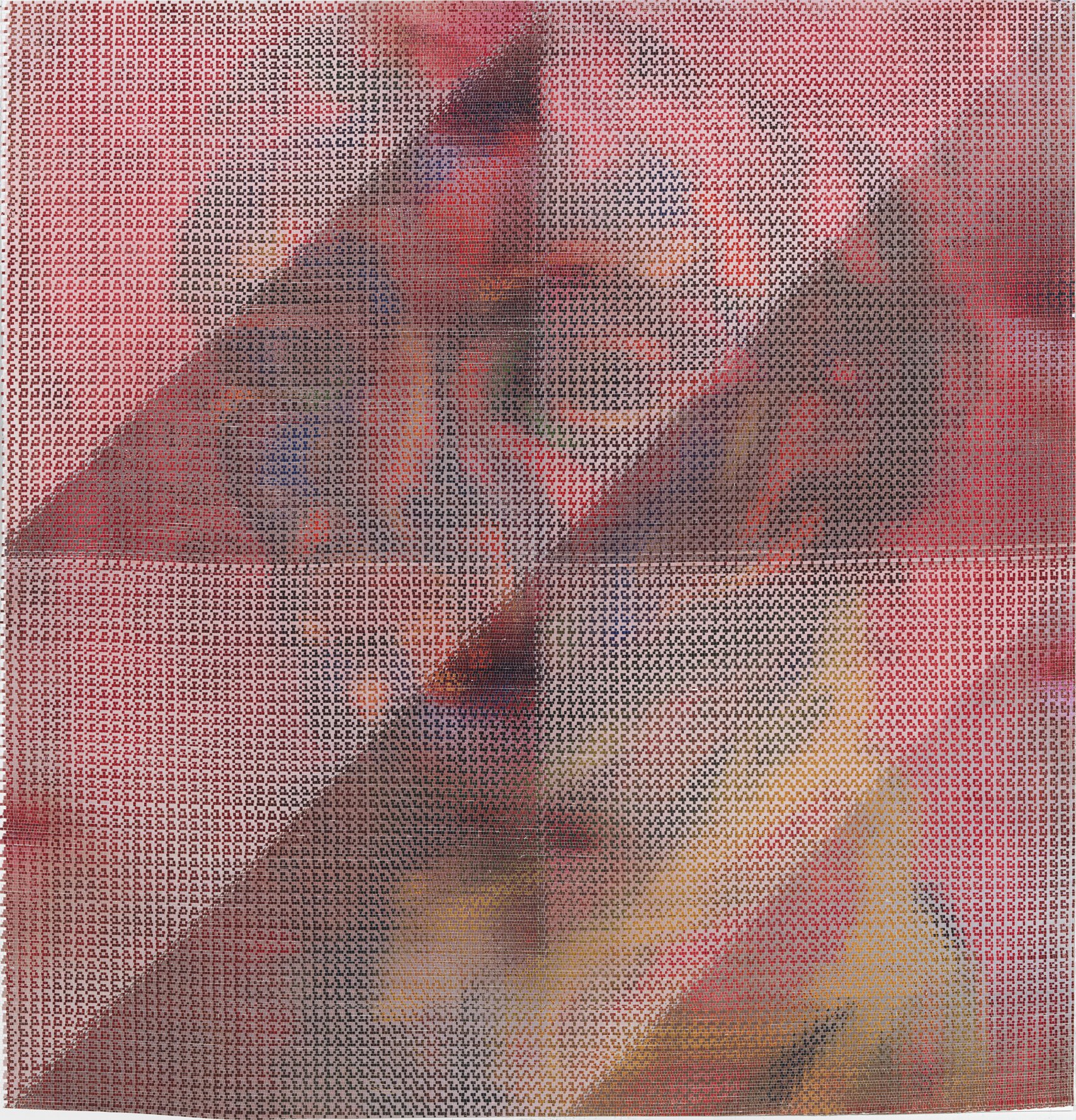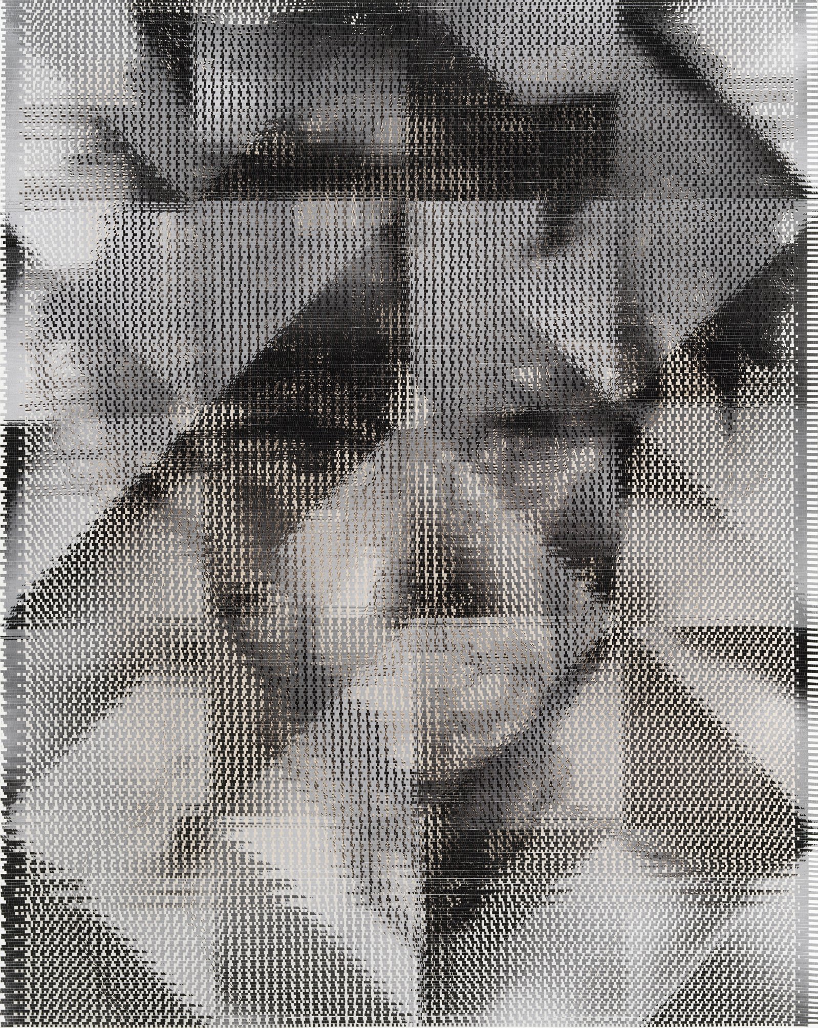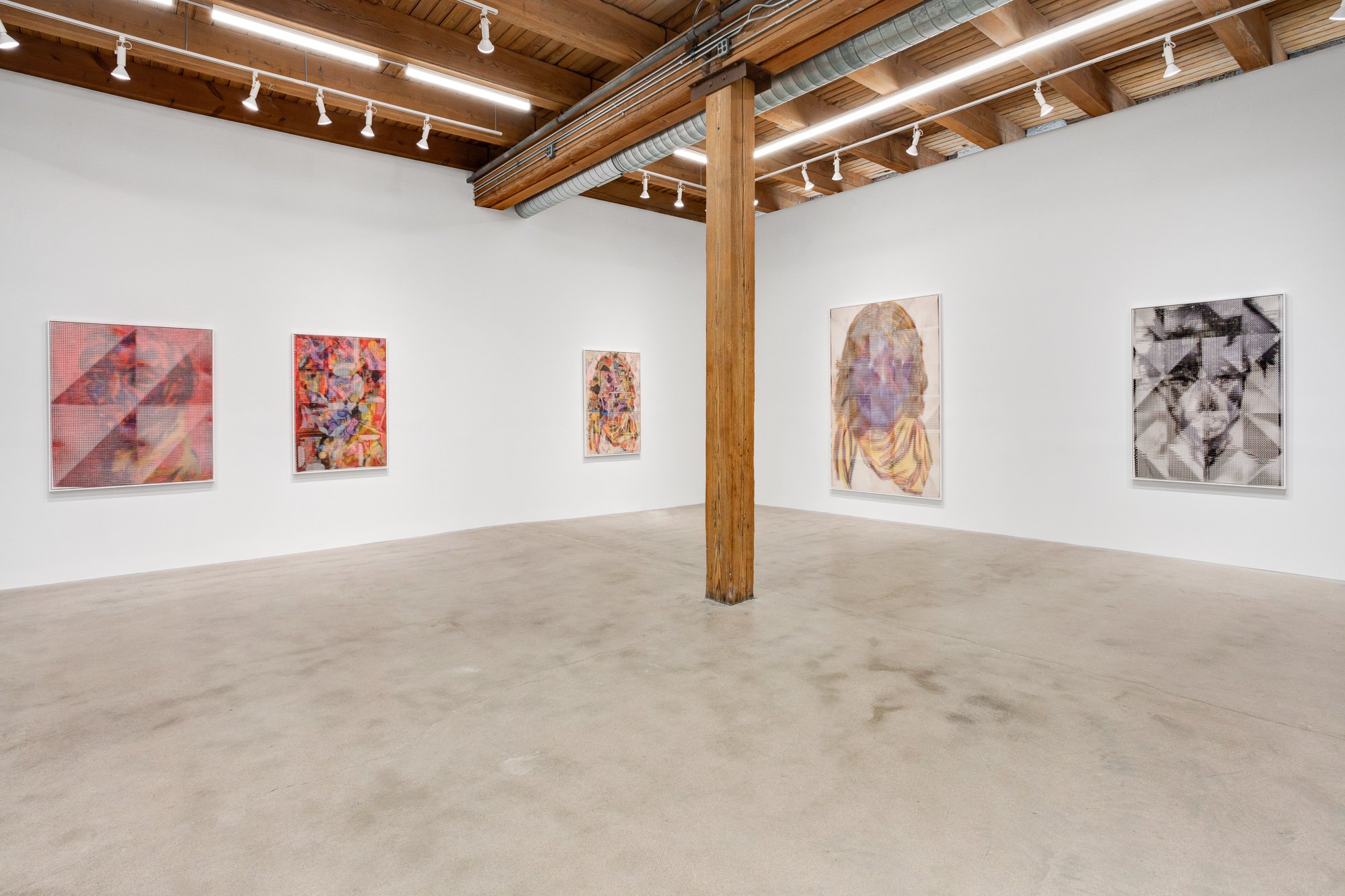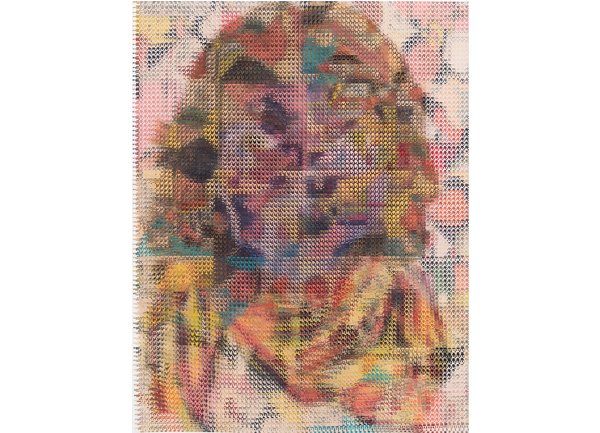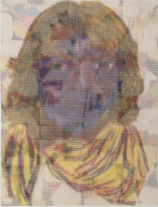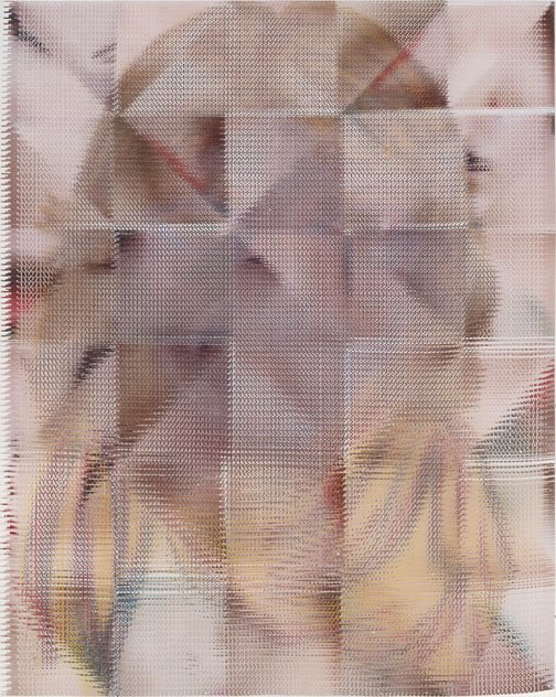 In the South Gallery, Corbett vs. Dempsey is proud to present Shatter, an exhibition of new work by John Sparagana. This is Sparagana’s fourth solo show with the gallery. Over the course of the last fifteen years, John Sparagana has developed a unique process for the investigation and transformation of images. Using a straight razor, he has cut and remixed iconic pages from news magazines, interpolating equally iconic modernist artworks into them or redacting parts of them so that they read more poetically, less didactically. He’s explored the nether regions of the American imaginary by means of deconstructed versions of comics – Dick Tracy and Nancy, to be specific – which he cut and mixed, then remixed again, until they were rendered as whorls of energy and color, stuttering text broken at its core, pixelated images that seem at once digital and handmade. Like a snake eating its tail, Sparagana’s focus has grown increasingly recursive, with one body of work revisiting some aspect – formal, tonal, conceptual, thematic – of its predecessors. Already complex and multidimensional, this web of references began to look deeply inward, turning in on itself, as a sort of material-psychological map, the pathways the work has taken, and other possible avenues of approach. In his latest works, collectively titled “Self Portrait in Dub,” Sparagana turned to a group of four images of himself, self-portraits he composed when he was in his late teens, just before he’d started his life as an artist. These drawings were made when Sparagana spent time with his older sister, and they were rediscovered upon her untimely death. Intense and rough-hewn, the images themselves have a raw power – direct address, affected scarf, seventies hair – that reflects the earnestness of youth. Sparagana unflinchingly dissects and reassembles these images, cutting and intermixing them with one another or with other recent images from his oeuvre. The effect is different in each piece, sometimes brutal and mocking, sometimes gentle and affectionate, sometimes abstracted into a kind of faceless oblivion – self-portraiture as self-destruction. Or self-construction. Colors carry over from the comics. Shapes carry over from a recent group of paintings. The persistent diagonal magnifies the intensity of young John’s visage, creating a sort of psychic vanishing point. In conjunction with Shatter, CvsD has published John Sparagana, a deluxe, 112-page hardbound catalog. Along with the complete “Self Portrait in Dub” series, it reproduces the four overlapping bodies of work that led up to it, from “Breather,” 2016’s paintings, through “Nancy Variations,” “Bodybuilder,” and “Industry White in Dub.” Writer, musician, and composer David Grubbs contributes an essay tying together all these strands, offering a meditation on the effect of Sparagana’s process, and concluding that the newest works constitute “self-portrait as crescendo.” In an interview with the artist, curators Fredi Fischli and Niels Olsen invite Sparagana to contextualize his work in relation to the readymade and modernist collage – both in terms of similarities and differences – suggesting that his works “cure” images, appropriating and ameliorating them.