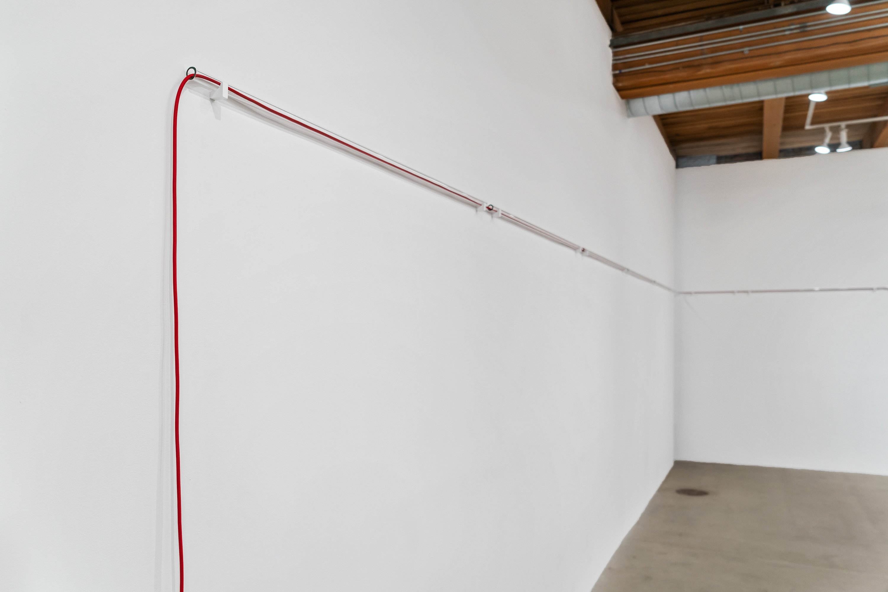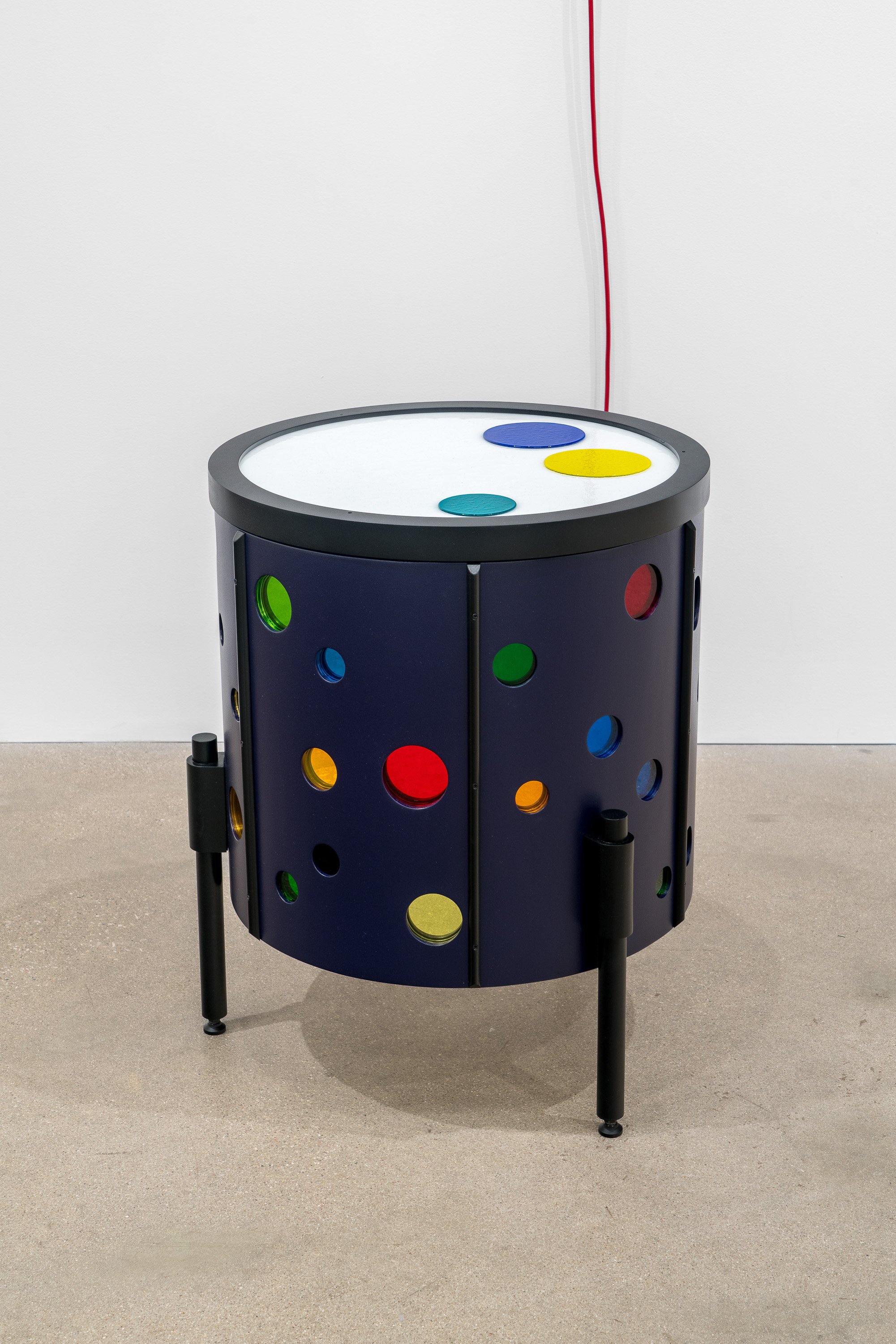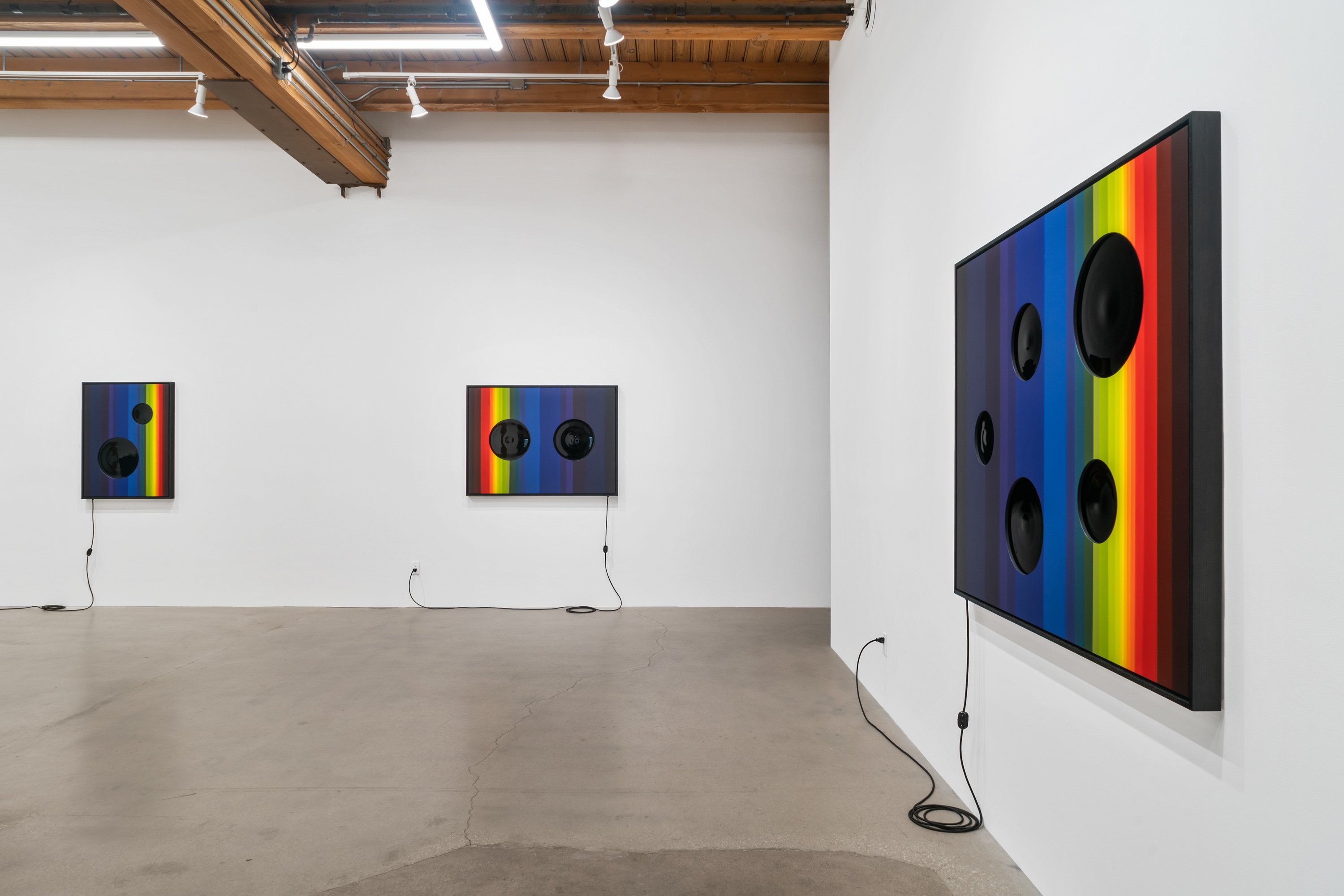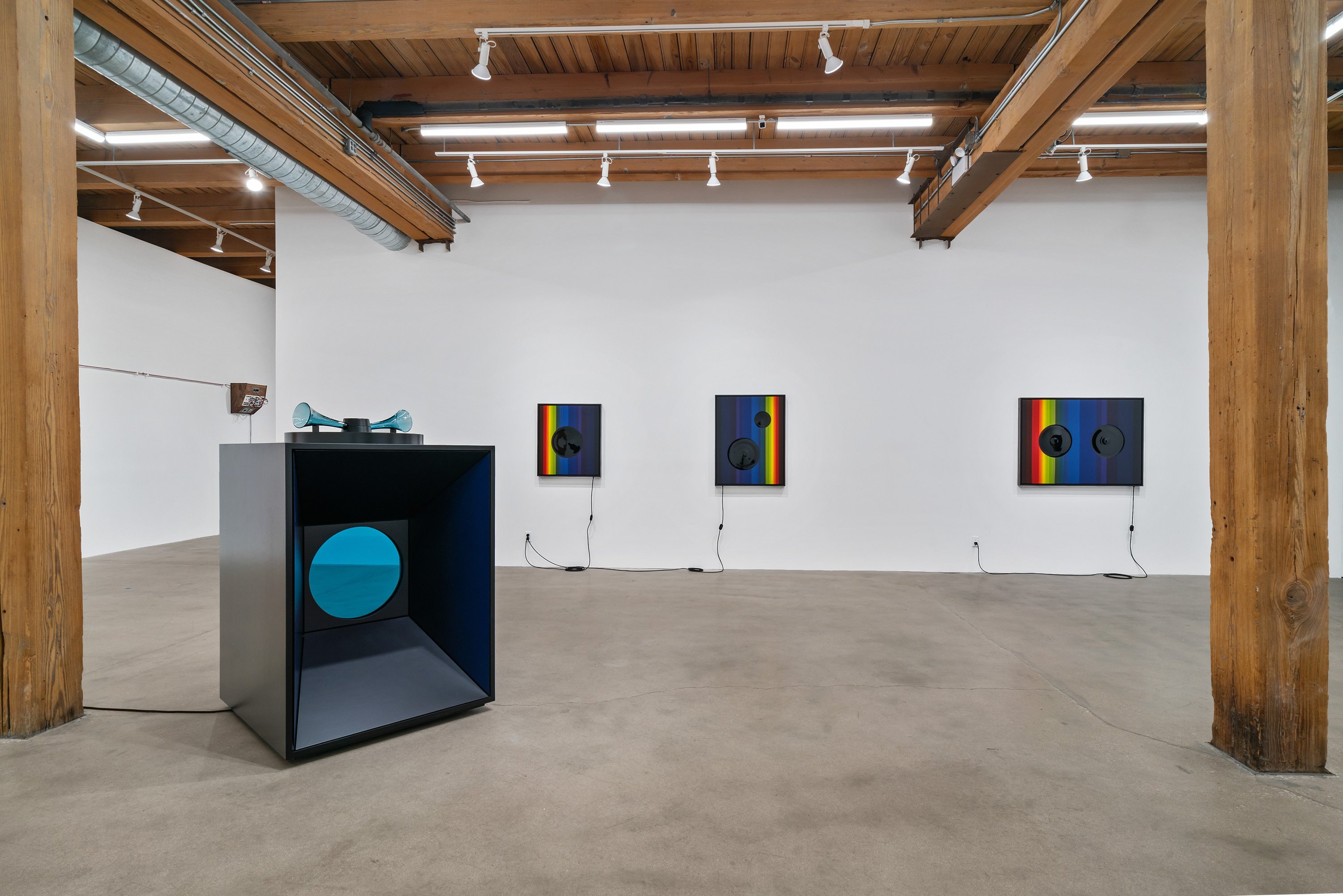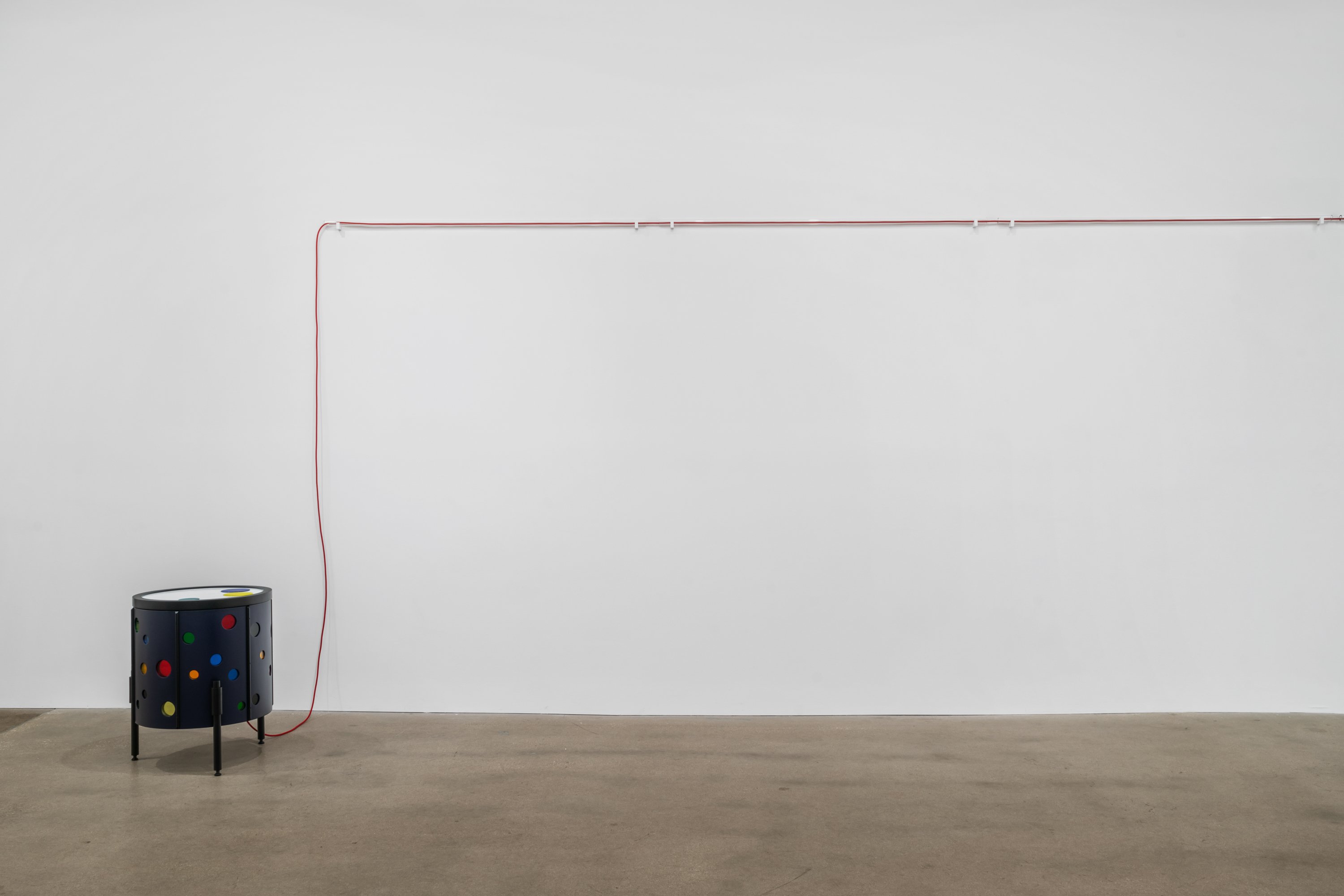 In From Red Black to Black, from Blue Black to Black, McElheny offers six extraordinary meditations on these questions. Four wall-hanging works incorporate embedded hand-blown vibrating glass discs that transduce and resonate sound signals. These “singing paintings” amplify musical works by David Grubbs that were especially commissioned for these pieces, as were all the sounds in the show. A combination floor-and wall-based sculptural installation stretches a red-sheathed cable around the interior of the space, transporting a heartbeat-like, non-repeating, non-metronomic signal from a Serge synthesizer (the “People’s Synthesizer,” designed in 1972) to a drum-like cylindrical shell embedded with colored glass discs – vintage optical filters in a dazzling array of hues – the top of which transduces the sound by way of a white glass “drum head.” A major floor sculpture at the center of the exhibition is based on the Leslie speaker system best known from soul jazz organ groups; across intervals of silence the melody from a Baroque chorale alternates with the musical trainwrecks of progressively slowed-down harmony parts. Along with the sculpture’s spinning, doppler-effect inducing horn element, like the paintings its surface is marked with painted color spectra.