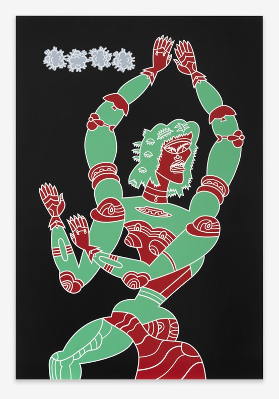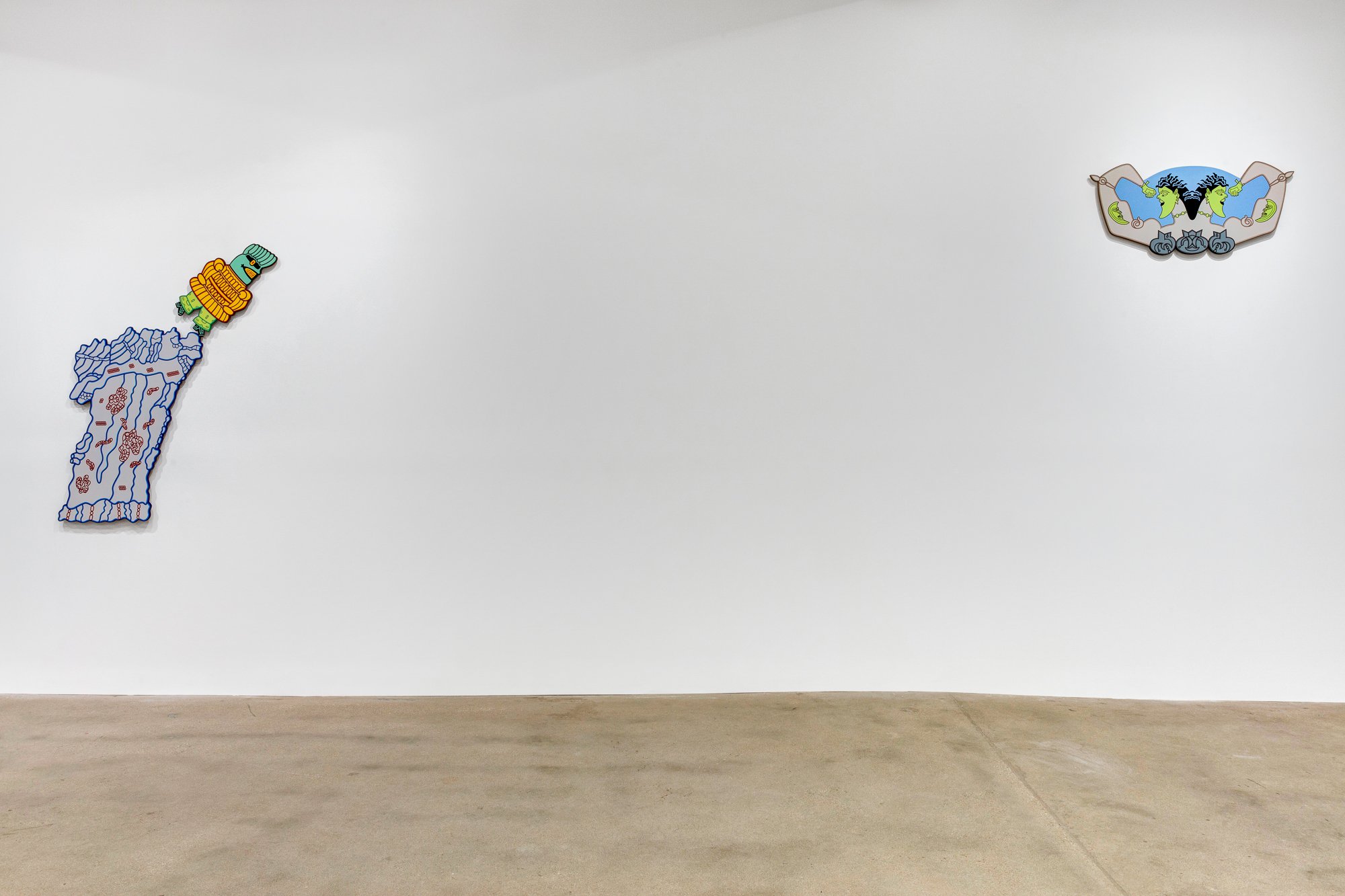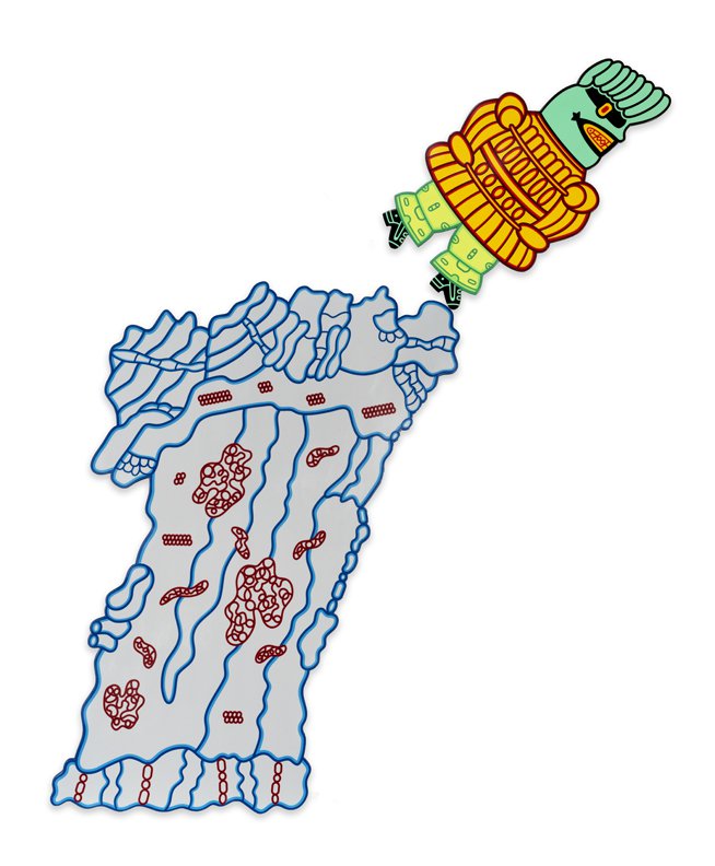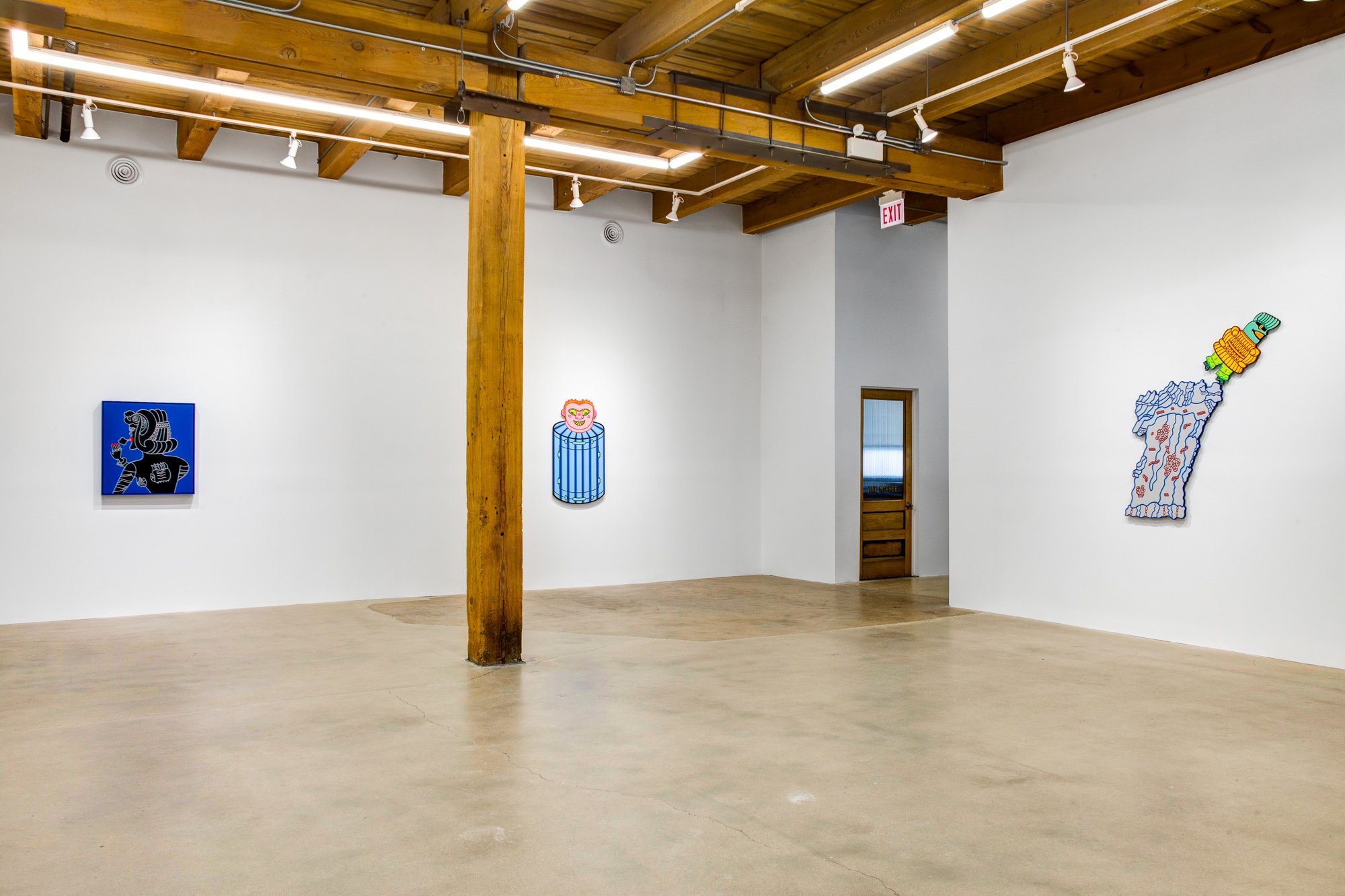 Karl Wirsum is a legendary figure in Chicago art. As an inspiring teacher and colleague, and especially as one of the most ferociously individual inventor of images the city has known, he has continuously forged a singular path since emerging as an original member of the Hairy Who in the mid-sixties. His approach to line, character, stylization, transformation, series, and medium has been beyond intrepid, and this exhibition makes clear both how consistent and how personal Wirsum World really is. Wirsum has been making use of unconventionally formed canvases and surfaces since at least the early seventies, when he began making articulated cardboard images of figures. Featured among the new paintings are four on shaped substrates. These are executed on wood panel, and two of them consist of multiple parts, each with a main figure in counterpoint with another object – a rocky landscape, in one case, and a hot spring, in the other. Wirsum long ago opted for an un-expressionistic surface, and these are smooth, even slick, some of them hand-painted, others unique works that are printed onto wood. As always, the excitement is in their eye-popping color, their impossible formal ingenuity, their raucous humor, and their sly, underlying intelligence. In “Steam Cabinet of Dr. Caligari,” an overheated male figure is encased in a metallic steambox, where “Armageddon” features a bilaterally symmetrical figure with bursting biceps. Four more works are traditionally rectangular, but by no means less explosive. The cyclopic figure of “Sigh Clip Pity Clops” sports a question mark on his t-shirt, above which hovers a head so monstrous and funny it could only have come from the mind of Dr. Wirsum. This is the first exhibition of Wirsum’s new work in six years. CvsD has been eagerly anticipating the completion of these paintings, and their magnificence makes the show that much sweeter.