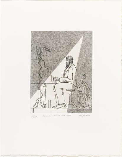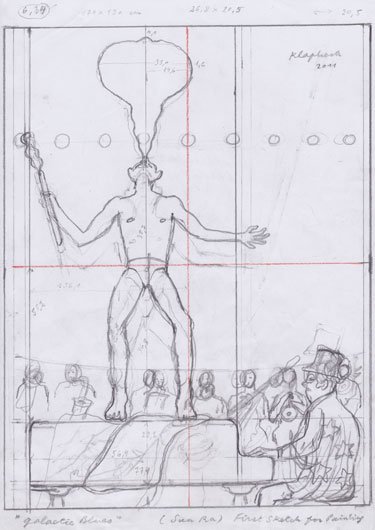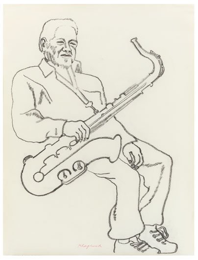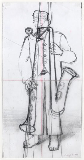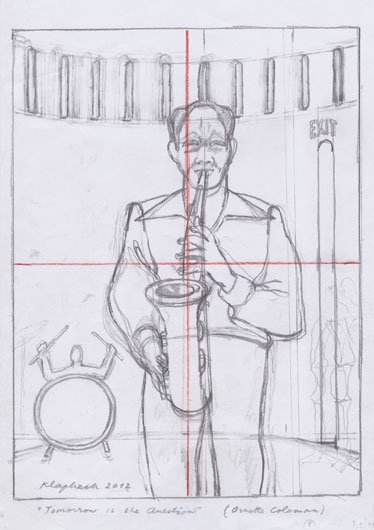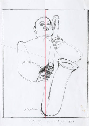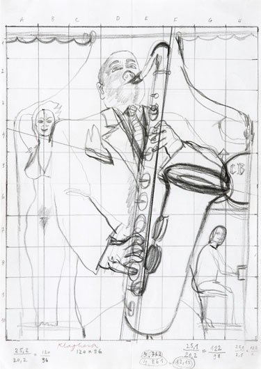 Since he emerged in the mid 1950s, Konrad Klapheck has been one of the legendary figures of European painting. His early signature works were canvases of machines – sewing machines, watches, adding machines, motorcycyles, and most importantly typewriters. Under Klapheck’s brush, a typewriter carried a great variety of connotations and associations. Using his own patented perspectival system, he endowed them with personality, gender, a sense of menace or seductiveness. In the ’60s and ’70s, these machines grew more complex and fantastic, but they retained their inherent objectness, their fetishistic quality as still images of metallic beasts. Klapheck began to introduce figures into his work in the 1990s, and these, too, were unlike anything else in contemporary painting. Narrative tableaux, often explicitly erotic and even disturbing, they made clear a side of the work that had always been latent in the anthropomorphic machines. At the same time, the figurative works allowed Klapheck to return to two earlier loves: boxing and jazz. In the early ’50s, he had worked as a jazz journalist in Düsseldorf, and the new works included portraits of Charlie Parker, Billie Holiday, and Coleman Hawkins, as well as avant garde jazz figures including Archie Shepp, Anthony Braxton, and Ornette Coleman.