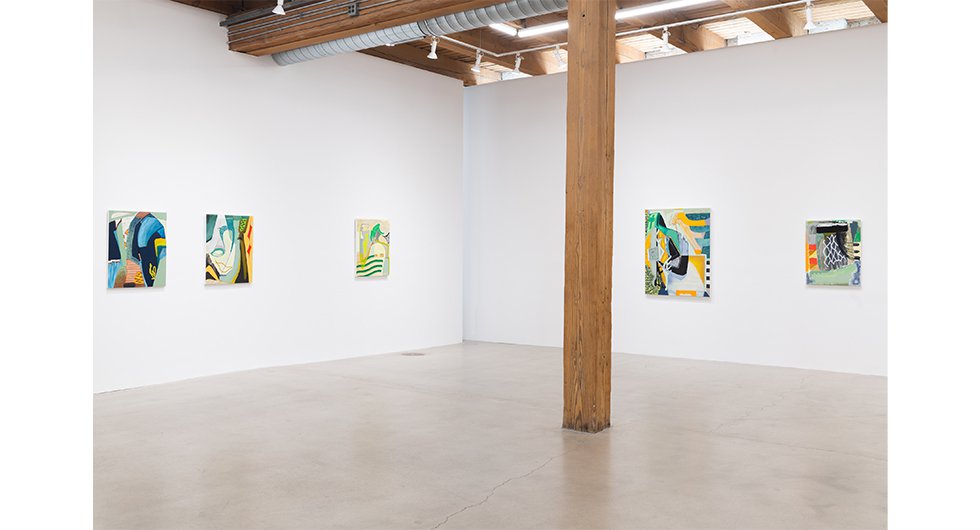 Born in Montréal, Canada, now based in Marfa, Texas, Guérin has continued to prod and push her highly personal approach to abstract painting. The latest body of work offers a remarkable new vision of the torqued forms and multiplicitous surfaces of her recent paintings, executed at a larger scale ranging up to 3 x 4 feet. At this size, additional area functions as a vehicle for opening up and exploring space, for spatial play – her adventures in foreground/background relationships, figure-ground issues, and closed/open composition are as ever daring, but here are even more so, complexity and stillness vs. implied motion being consistent features. Guérin is a master of recurrent shapes, rotating or flipping forms to render them afresh and unrecognizable, the same way a serial composer might use retrograde inversion to revitalize a tone row. She repeats and deconstructs with glee, turning self-restriction into a cornucopia of new discoveries. The most obvious development in hard green has to do with Guérin's paint application, which is looser and more painterly than in the past. This gives the canvases a different resolution in terms specifically of their overall vibration. Their architecture jostles up against the manner of their execution, creating a halo of static electricity. "It feels like a structure that just got shaken up," says Guérin. Indeed, this group of new paintings, as well as a small selection of related drawings in the front office, has a palpable frisson, a restless inventiveness that seems to undo its laces even as it ties them up.