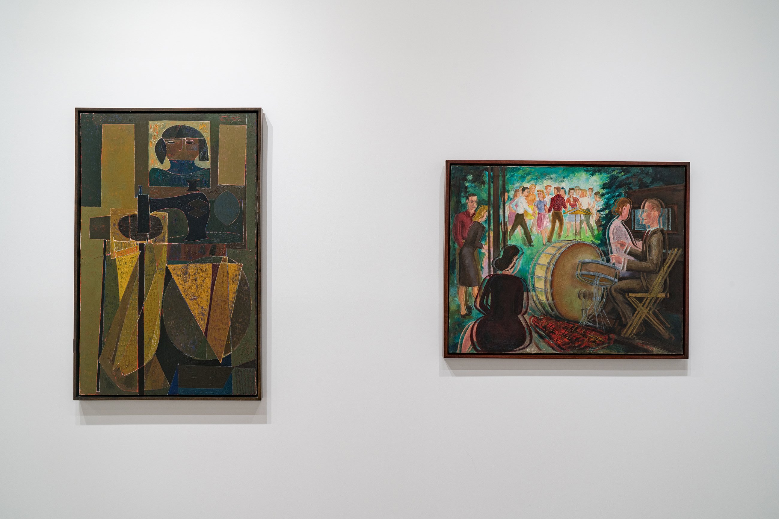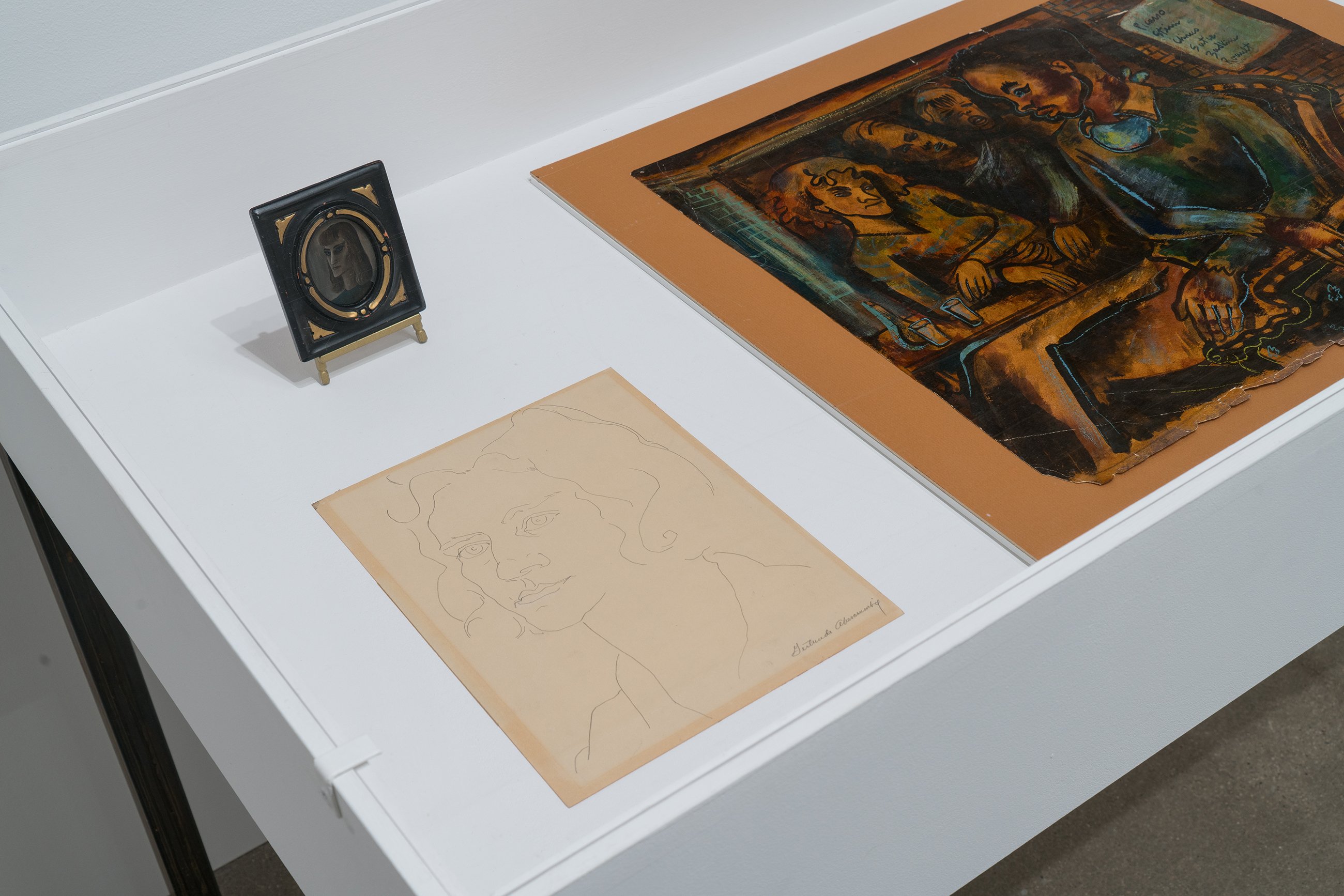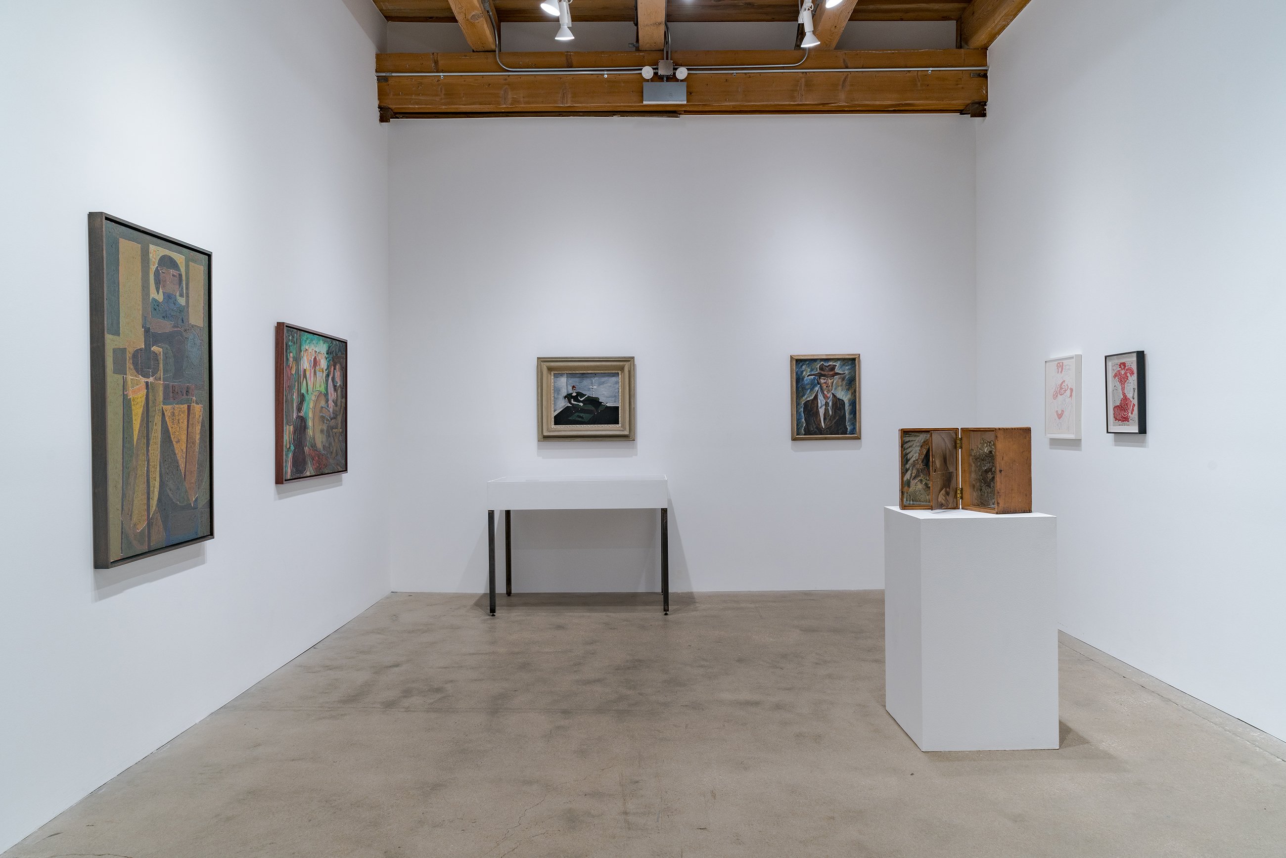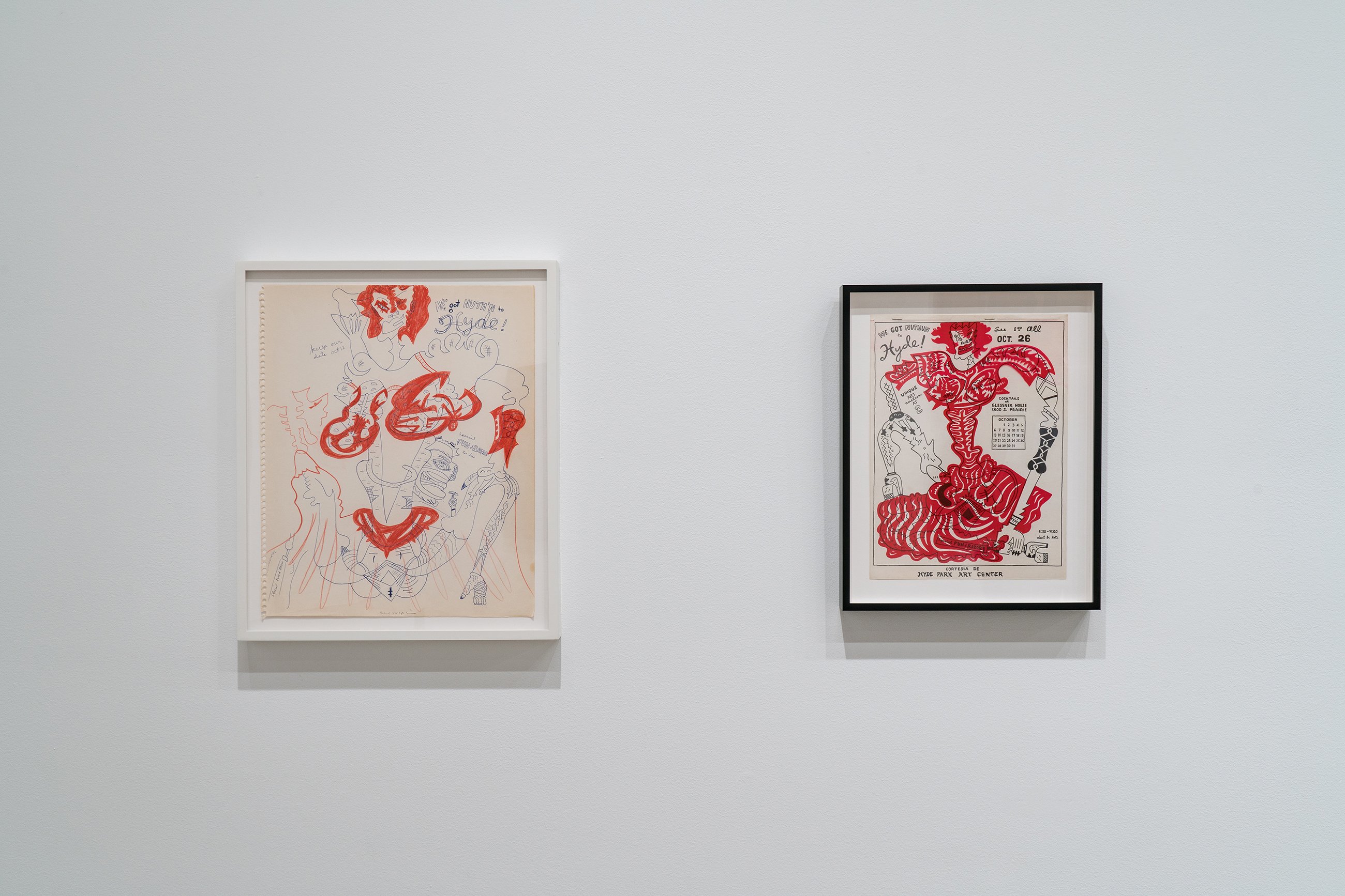 Although its placement in the annals of art history has been linked to exhibitions there in the latter half of the 1960s, the Chicago neighborhood of Hyde Park had been an enclave for artistic activity starting decades earlier. This focused group show gently decenters the Hyde Park mythology, configuring the Imagist shows at the Hyde Park Art Center as a continuation of the neighborhood’s longstanding bohemianism and experimentation. At the center of the exhibition sits painter Gertrude Abercrombie, whose recent “discovery” and meteoric ascent in the contemporary art world, fifty years after her death, has come as a surprise to her many admirers in Chicago. Spotlighting an important canvas first unveiled in 1945 at the Renaissance Society (also located in Hyde Park) and a tiny self-portrait in a thrift store frame, the show presents never-seen portraits of Abercrombie by Karl Priebe and Ceil Rosenberg. The exhibition features work by Eleanor Coen and Max Kahn, whose printmaking activities were based in the south side neighborhood in the 1930s and ’40s, as well as fellow Hyde Parker Miyoko Ito, represented by an early canvas, and a “binocular” painting by Harold Haydon, an artist and critic closely associated with the University of Chicago. One of the most beloved and colorful artists of Hyde Park, Cosmo Campoli is present with his signal 1950s bronze “Birth of Death.” Don Baum, like Campoli, was associated early on with the Monster Roster; as director of the Hyde Park Art Center, Baum went on to help facilitate the Hairy Who, False Image, and Non-Plussed Some Imagist shows, and is included in “Nuth’n to Hyde” with two pieces from the 1960s, one of which is an assemblage portrait of collector and Hyde Park social maven Ruth Horwich. From the Imagist camp, the show presents works by Karl Wirsum (the elaborate flyer from which comes the show’s title, together with its original sketch), a piece by Jim Falconer shown in the third Hairy Who exhibition, replete with its original price tag, and a sensational Jim Nutt painting from the mid 1970s.
