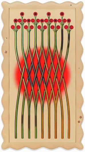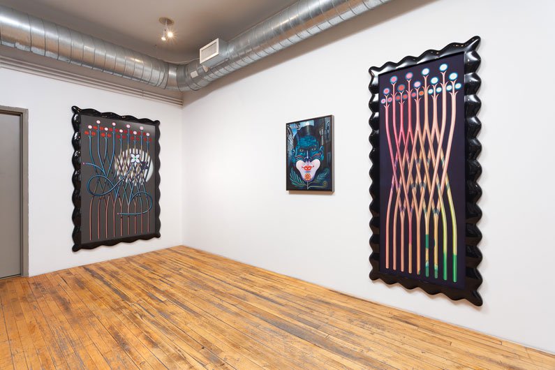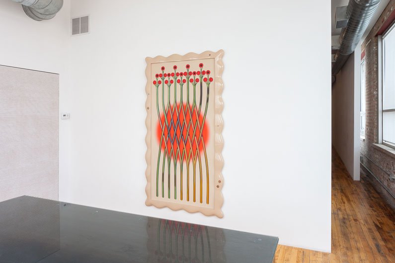 In both the East and West Wings, CvsD is tickled to present the first solo show in Chicago of painter Orion Martin. A rising artist based in L.A., Martin’s approach to surface and image is part of the heritage of Chicago Imagism as well as painters like Konrad Klapheck, but it is thoroughly contemporary and every bit Martin’s own. His paintings in the Whitney’s 2016 exhibition Flatlands posed penetrating questions about the nature of representation and illusion, taking each viewer on a wild ride from faux to real and all points between. In this exhibition, three large canvases feature elaborate metal fences, the intersections of their elements creating patterned openings through which objects or atmospheres are visible. Vividly dimensional in their flatness, with over-the-top handmade undulating wooden frames, these bright, playful paintings are a fitting riposte to the sculpture show and its objectness. A single smaller jester-like self-portrait introduces a human element to Martin’s virtuosic contribution.
