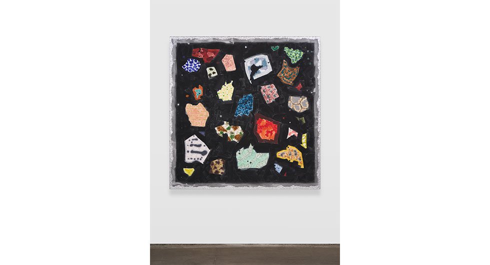 The devil is in the details in Morris works, which always richly repay attentive viewing. The eight large-scale paintings and one smaller canvas included in #29 move into new terrain from past series of paintings in the myriad ways they grapple with transitions. Harder borders now contain ambiguities they might previously have abjured, while in other places the transitional features are bold but grapple with increasingly complex implications of space. Passage from one area into another is a magical formulation in these paintings – for instance the way the irregular bright silver edge on Untitled (#08-21) sits atop another darker interior silver border, creating a mysterious two-step transition into the thinly-brushed black matrix at the composition’s center, within which vivid fragmentary parts float like a conglomerate puddingstone. In places that one might anticipate a sharp transition, like between the puzzled-together parts of Untitled (#02-21), Morris thwarts the obvious by using a soft edge, generating lots of lustrous painterly energy where the tectonic plates meet.