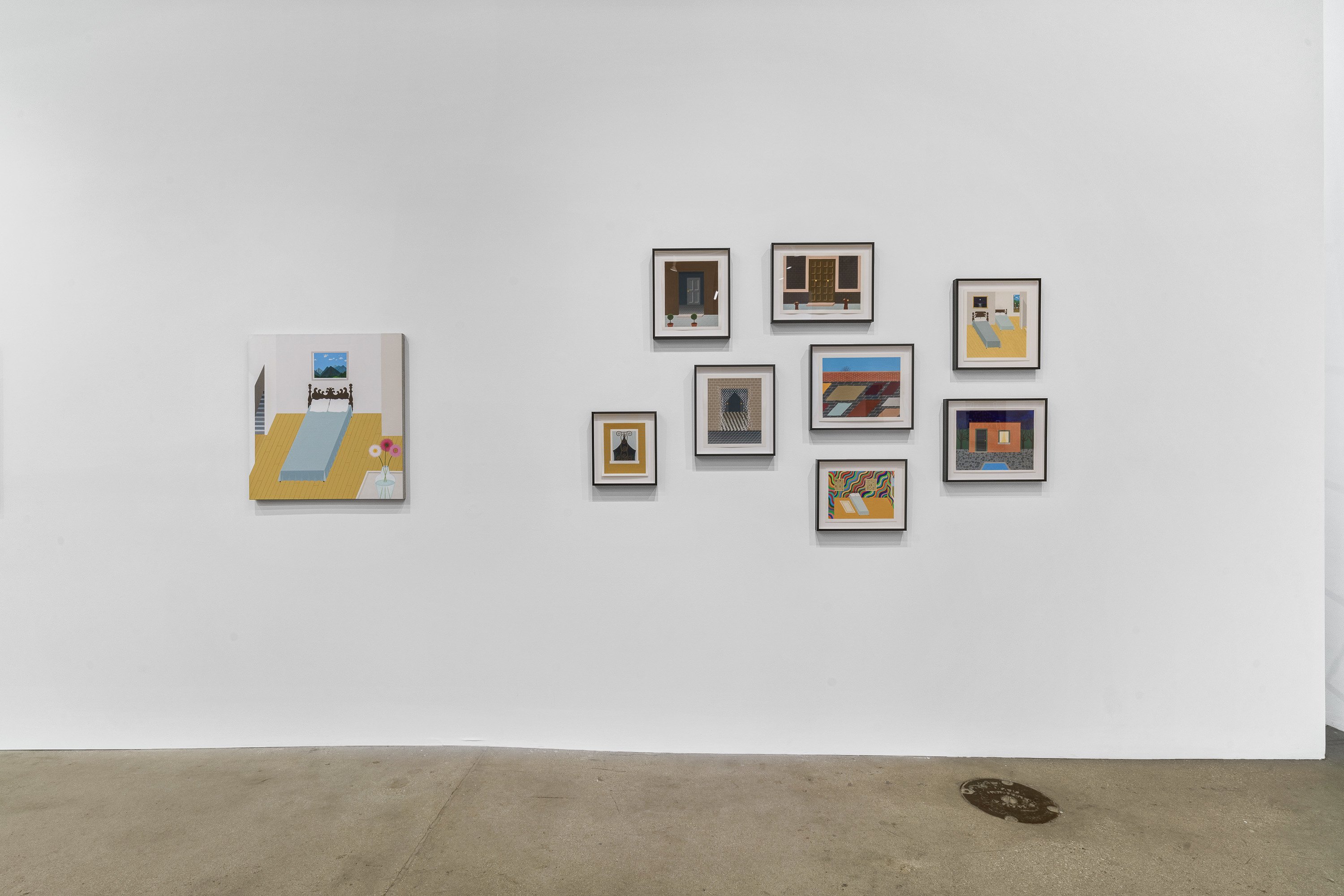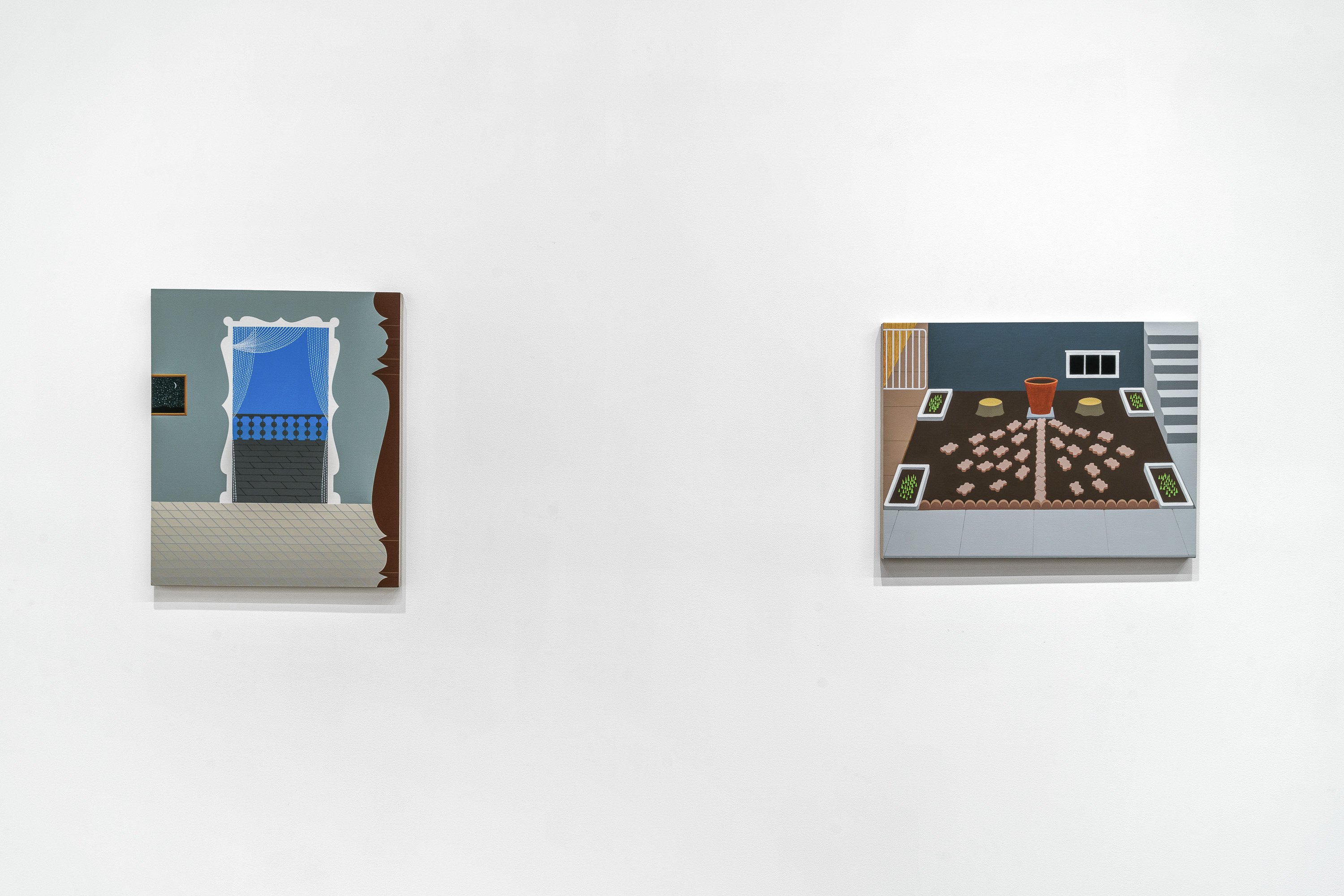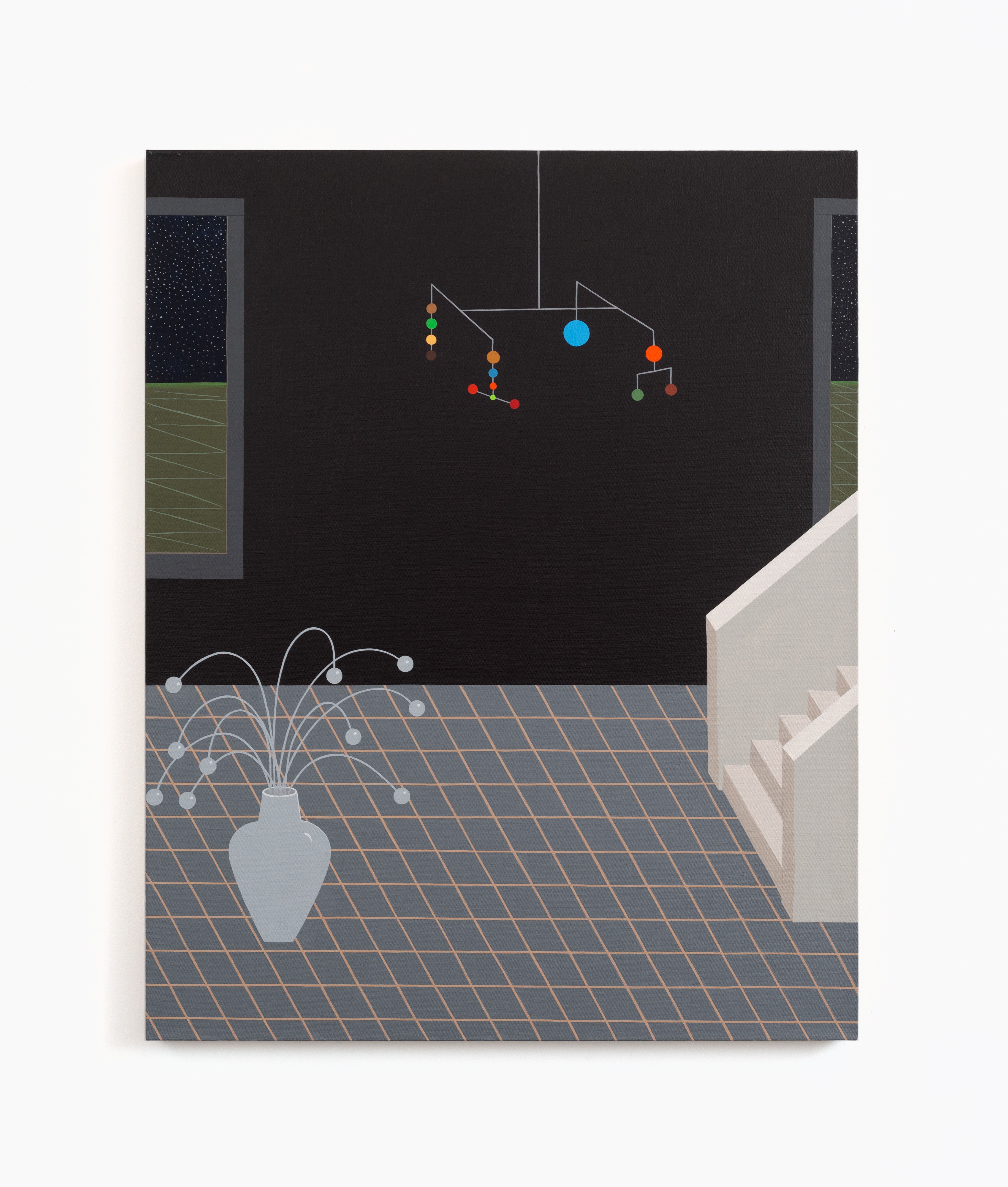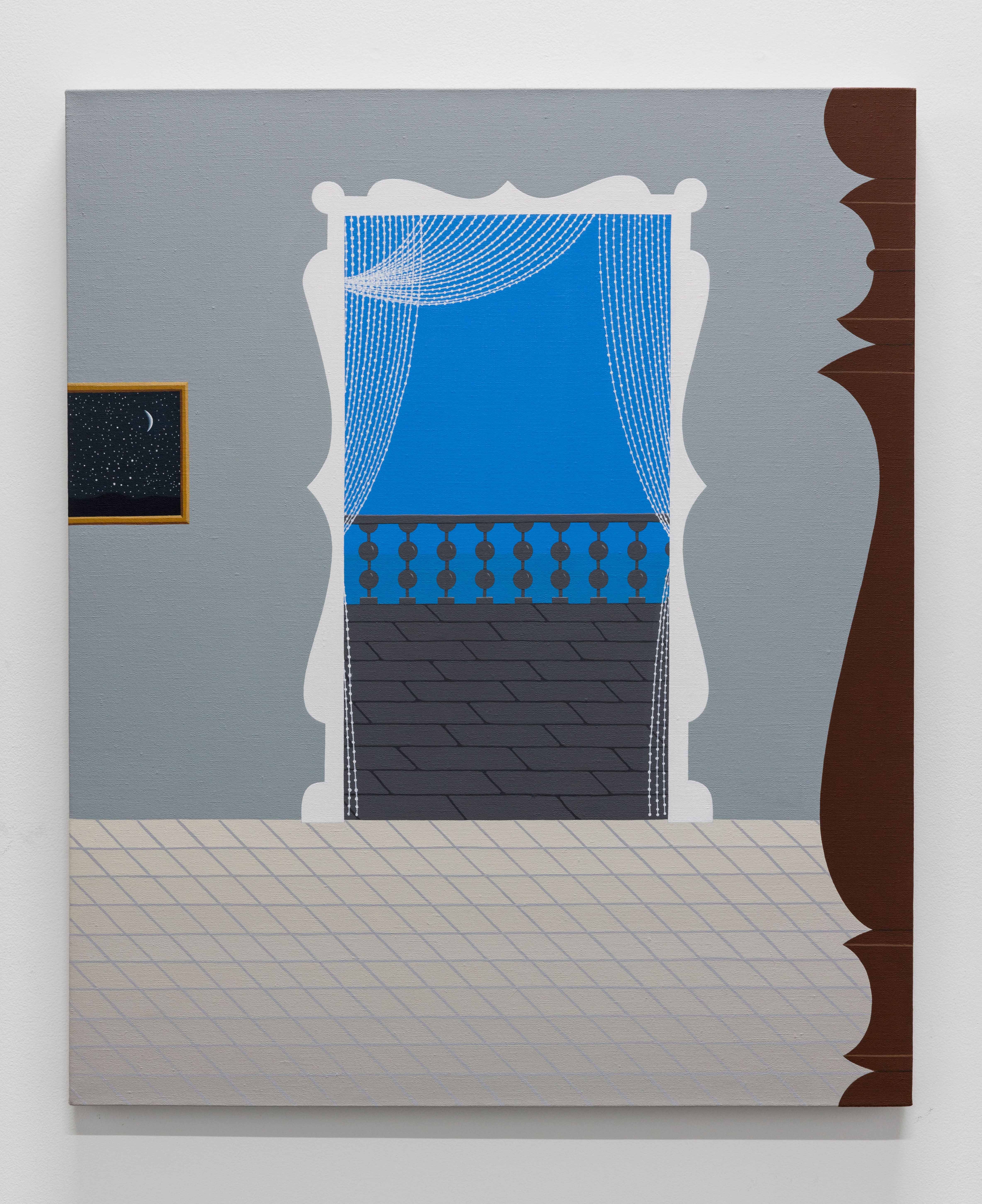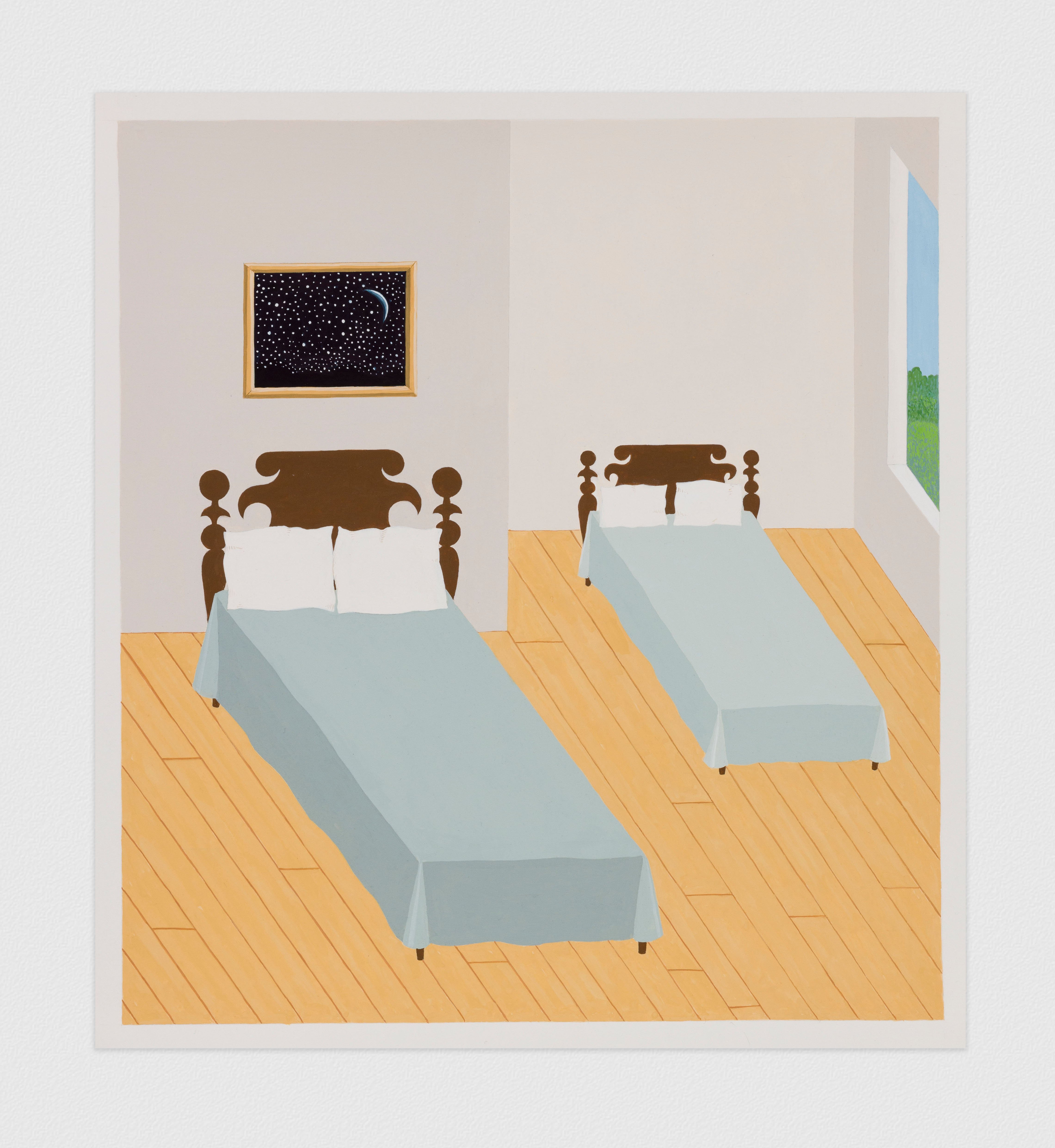 In her latest body of work, Rebecca Shore meditates on a shifting set of spaces – interiors and exteriors, mostly domestic sites including bedrooms, porches, gardens, verandas, mezzanines, dining rooms, courtyards, doorways, and windows. Indeed, the status of the portal in these paintings, executed in acrylic on linen or in gouache on paper, is a central point. The viewer is consistently looking at something through something else, their vision moving between different atmospheres, varieties of light, qualities of enclosure or landscape. Building on her relatively recent pivot from abstraction to representation, Shore has retained her immaculate technical approach, a consistent feature of her work across her oeuvre, back to the paintings she was making in the early 1980s and the quilts she made alongside her friend Christina Ramberg later in the decade. There are no figures in these new works, only spaces. Often containing sly visual games or lurking spatial paradoxes, Shore's paintings create an imagined territory into which the viewer can project themself, a stage set carefully prepared for cognitive immersion. Two beds with paintings hung above them, one a daytime scene, one a night sky, the pairing creating a subtle tension in the room. Layers of oblique intertexts hovering in the paintings – Giovanni di Paolo's window-glimpsed landscapes and stylized rock formations, the vibrating curved lines of Karl Wirsum "awning" canvases. There are multiple patterns associated with different elements of these scenarios – a wall, a floor, stairs, a woven curtain, an iron gate, a hanging mobile – each combination culminating in a complex rhythmic assemblage, an extraordinary visual polyrhythm.