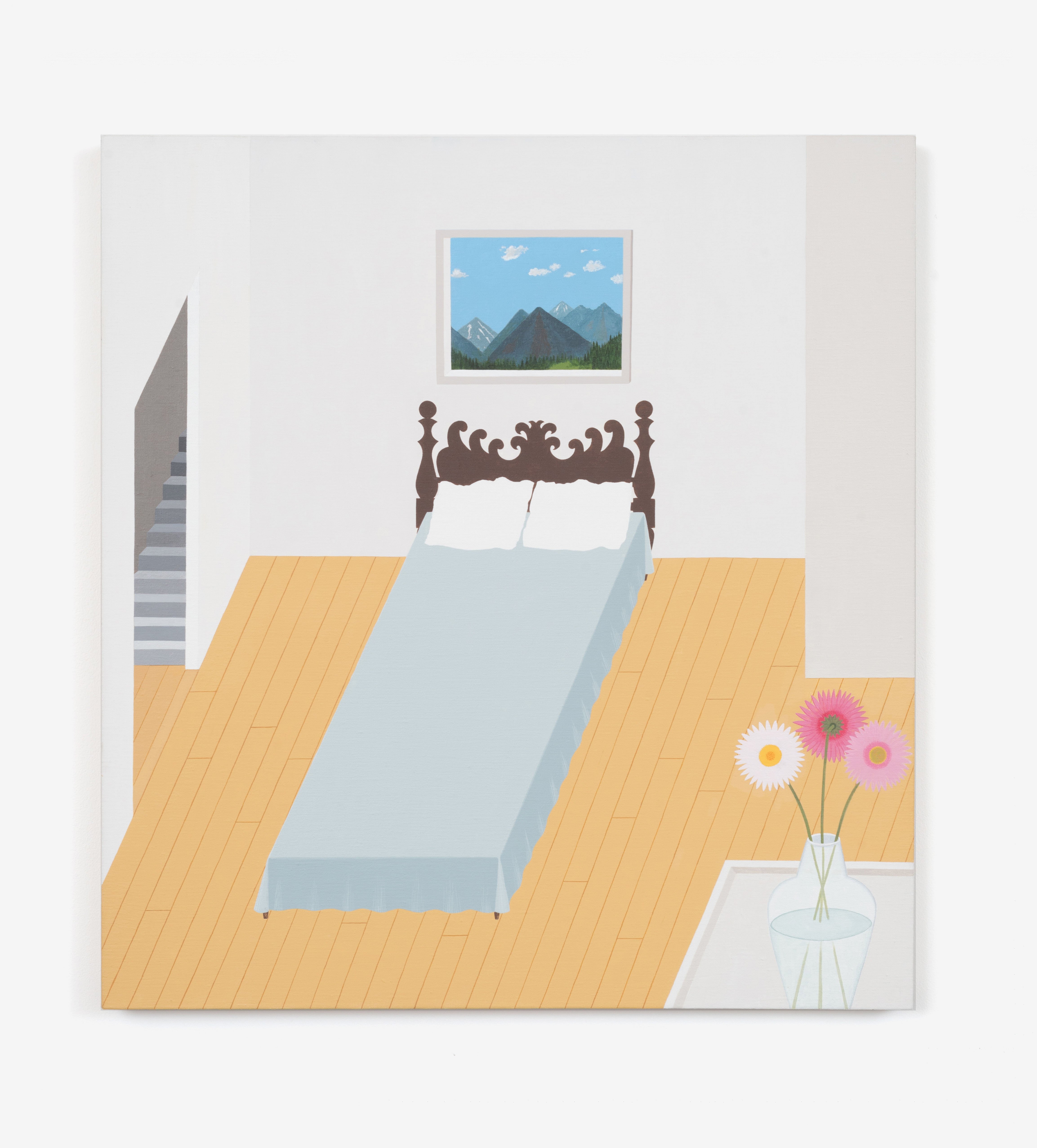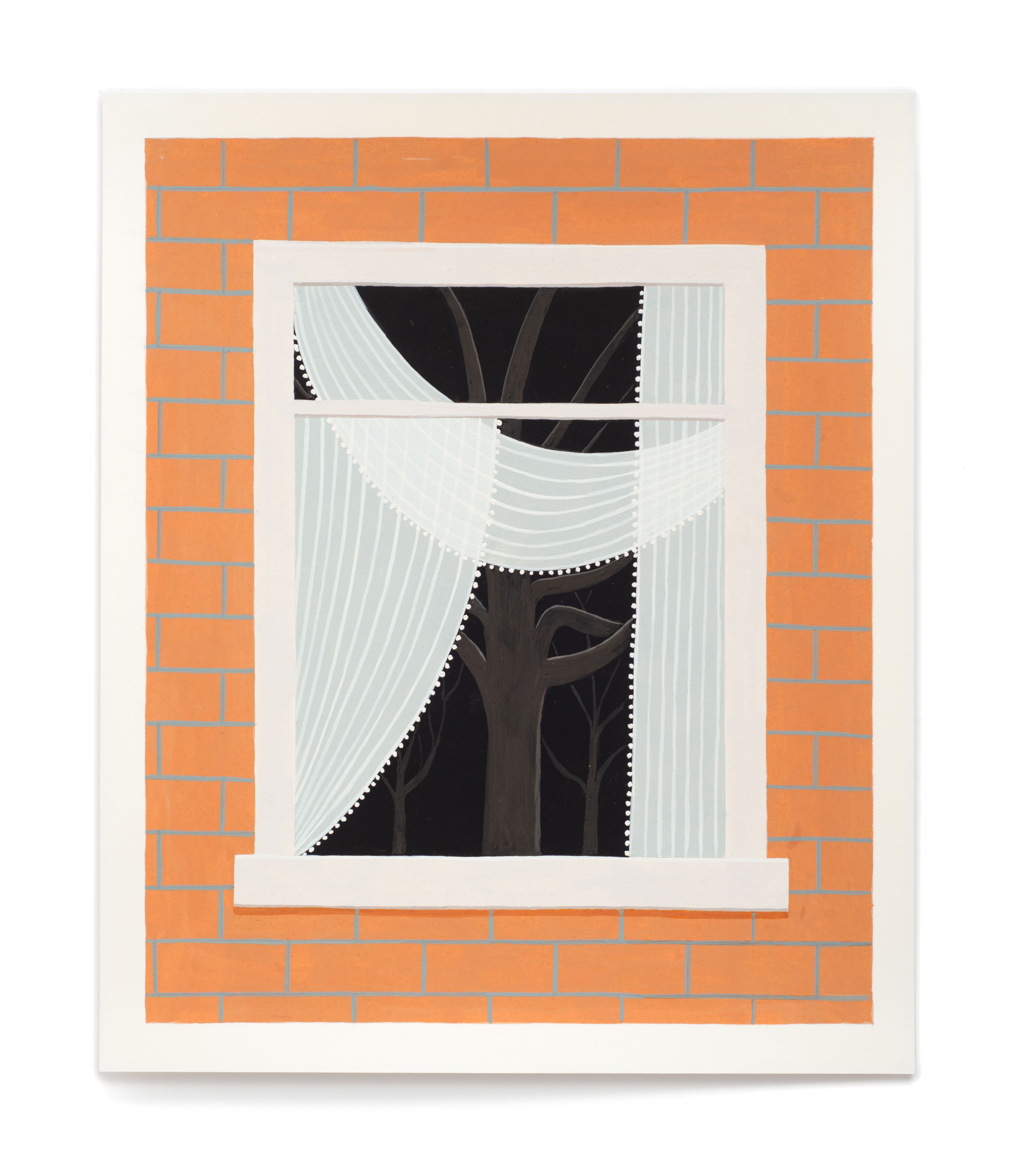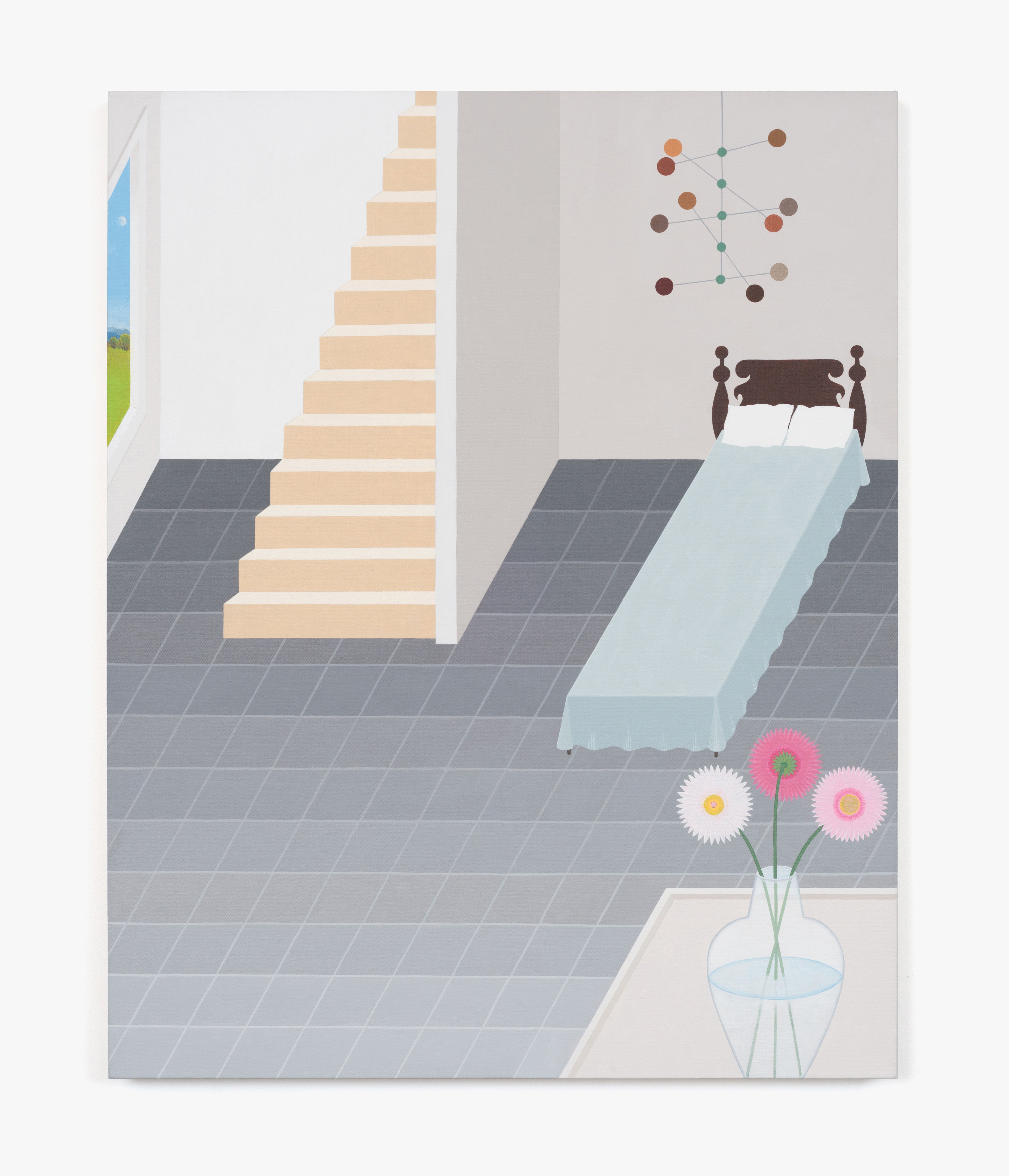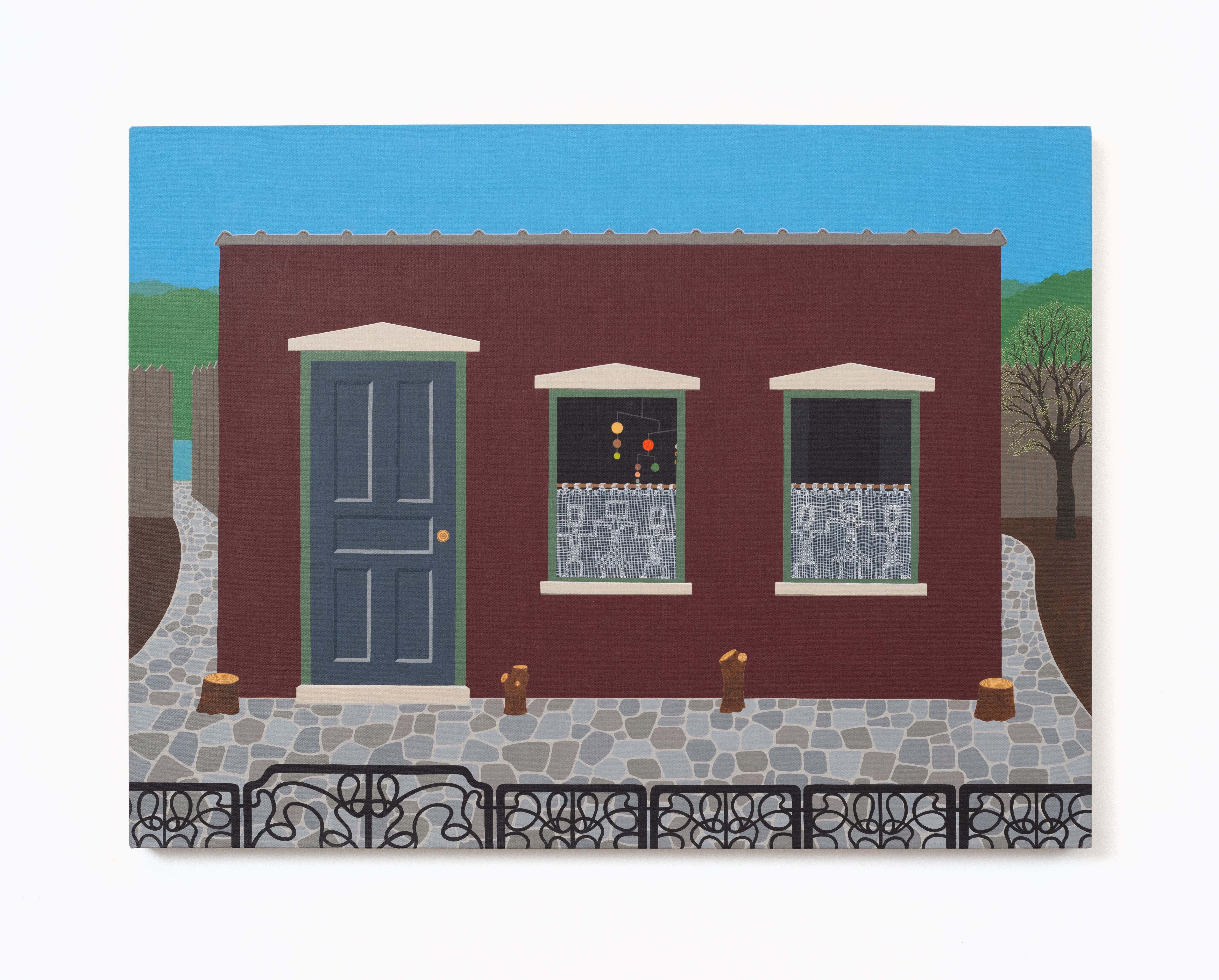 In her latest body of work, Rebecca Shore meditates on a shifting set of spaces – interiors and exteriors, mostly domestic sites including bedrooms, porches, gardens, verandas, mezzanines, dining rooms, courtyards, doorways, and windows. Indeed, the status of the portal in these paintings, executed in acrylic on linen or in gouache on paper, is a central point. The viewer is consistently looking at something through something else, their vision moving between different atmospheres, varieties of light, qualities of enclosure or landscape. Building on her relatively recent pivot from abstraction to representation, Shore has retained her immaculate technical approach, a consistent feature of her work across her oeuvre, back to the paintings she was making in the early 1980s and the quilts she made alongside her friend Christina Ramberg later in the decade. There are no figures in these new works, only spaces. Often containing sly visual games or lurking spatial paradoxes, Shore's paintings create an imagined territory into which the viewer can project themself, a stage set carefully prepared for cognitive immersion. Two beds with paintings hung above them, one a daytime scene, one a night sky, the pairing creating a subtle tension in the room. Layers of oblique intertexts hovering in the paintings – Giovanni di Paolo's window-glimpsed landscapes and stylized rock formations, the vibrating curved lines of Karl Wirsum "awning" canvases. There are multiple patterns associated with different elements of these scenarios – a wall, a floor, stairs, a woven curtain, an iron gate, a hanging mobile – each combination culminating in a complex rhythmic assemblage, an extraordinary visual polyrhythm.