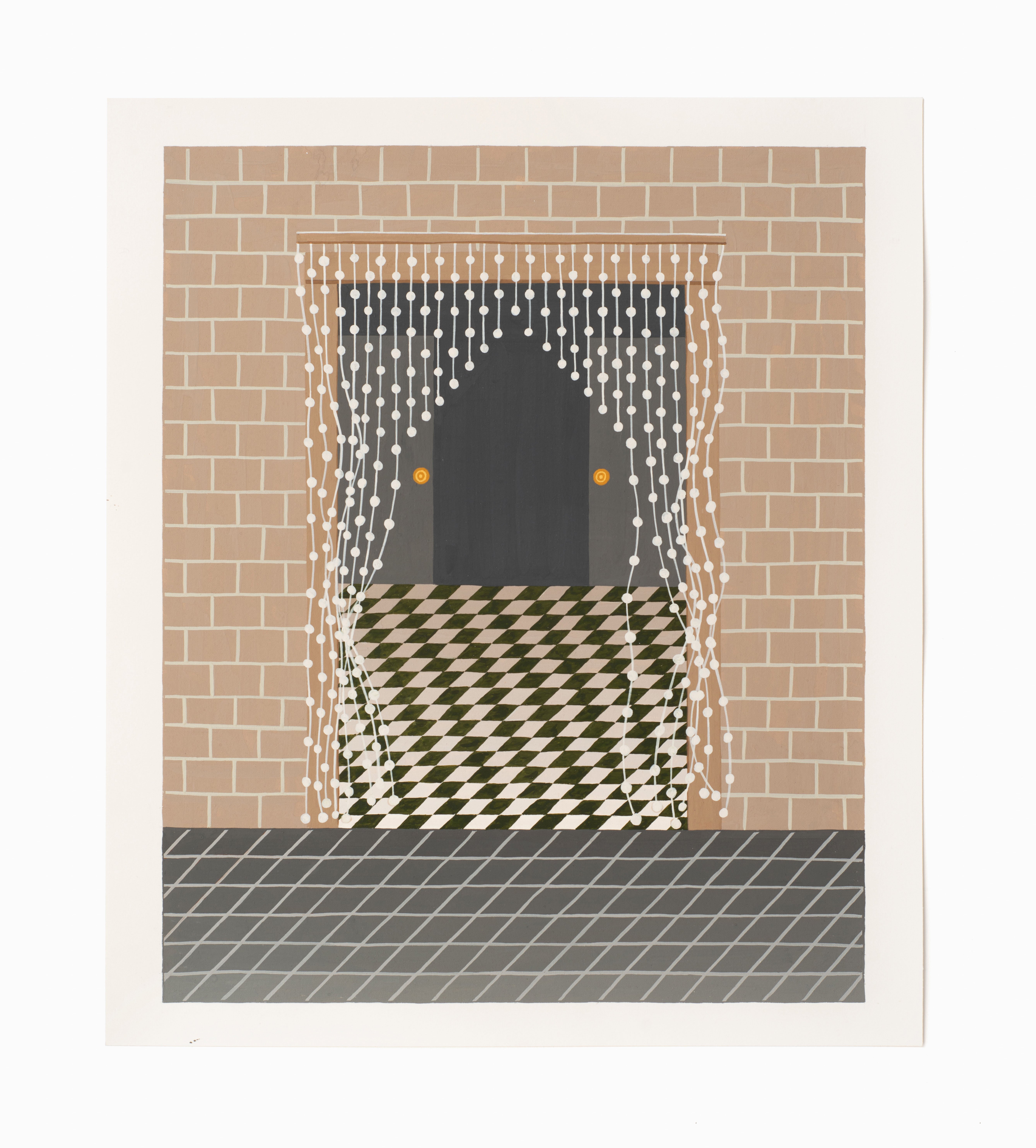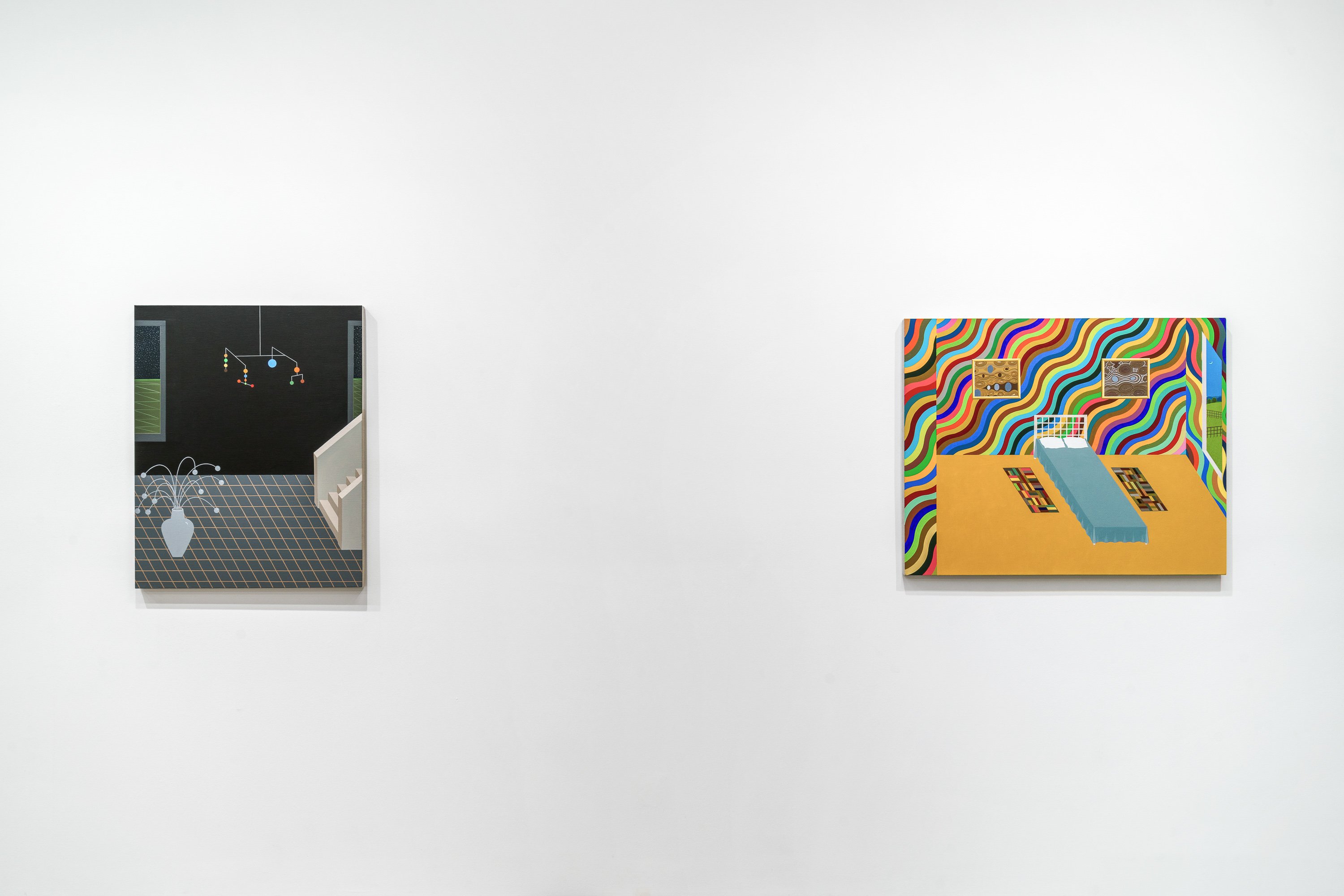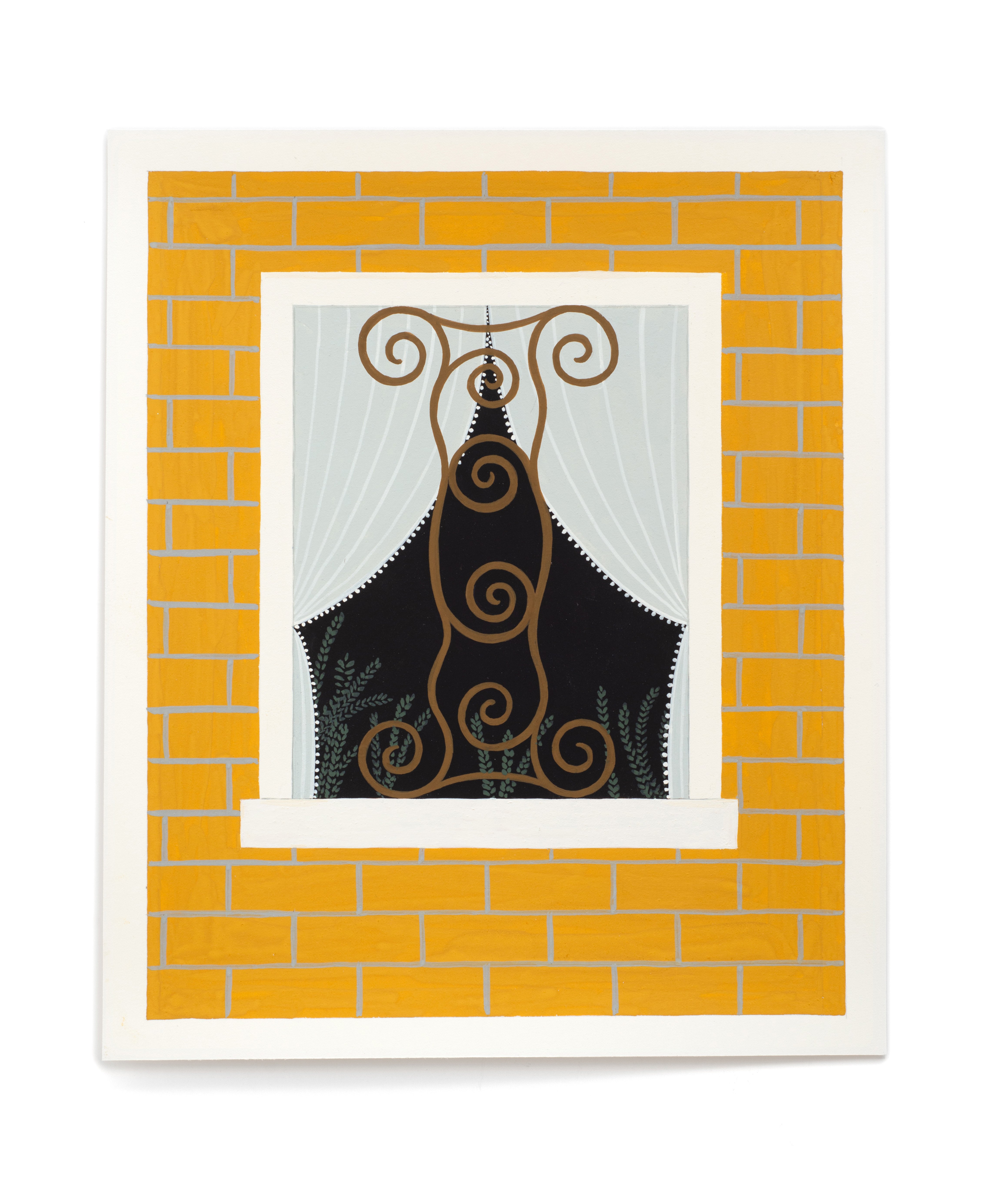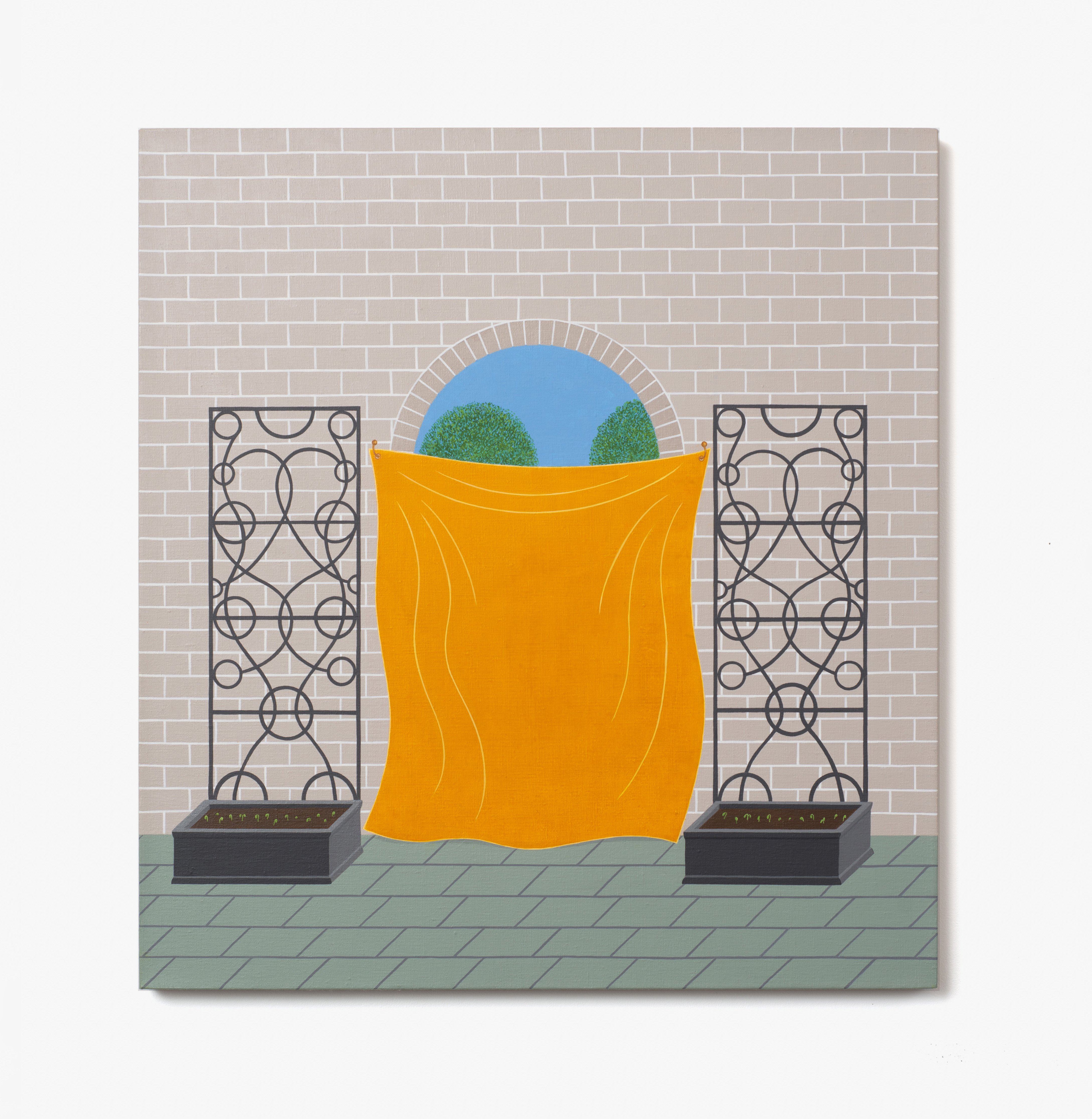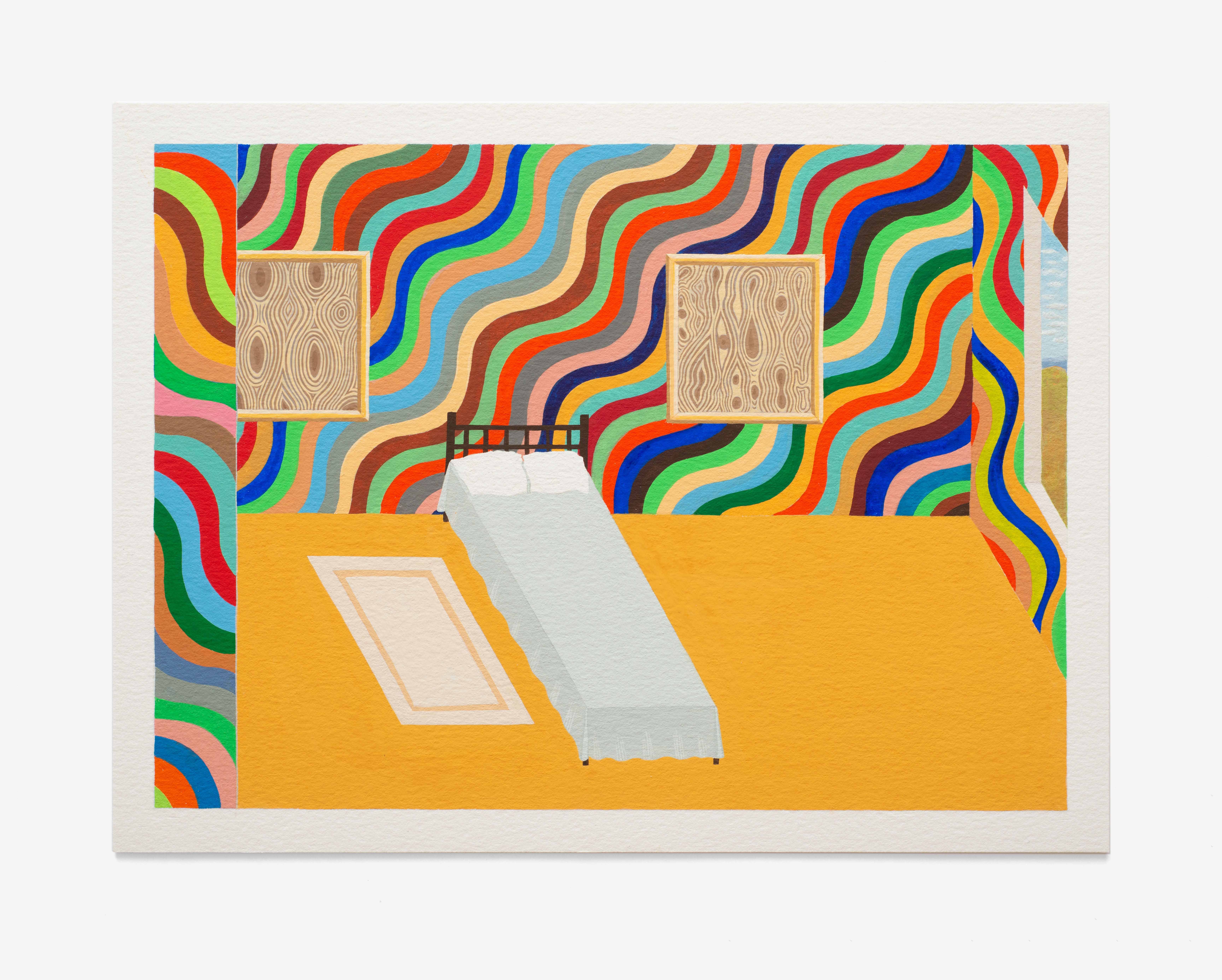 In her latest body of work, Rebecca Shore meditates on a shifting set of spaces – interiors and exteriors, mostly domestic sites including bedrooms, porches, gardens, verandas, mezzanines, dining rooms, courtyards, doorways, and windows. Indeed, the status of the portal in these paintings, executed in acrylic on linen or in gouache on paper, is a central point. The viewer is consistently looking at something through something else, their vision moving between different atmospheres, varieties of light, qualities of enclosure or landscape. Building on her relatively recent pivot from abstraction to representation, Shore has retained her immaculate technical approach, a consistent feature of her work across her oeuvre, back to the paintings she was making in the early 1980s and the quilts she made alongside her friend Christina Ramberg later in the decade. There are no figures in these new works, only spaces. Often containing sly visual games or lurking spatial paradoxes, Shore's paintings create an imagined territory into which the viewer can project themself, a stage set carefully prepared for cognitive immersion. Two beds with paintings hung above them, one a daytime scene, one a night sky, the pairing creating a subtle tension in the room. Layers of oblique intertexts hovering in the paintings – Giovanni di Paolo's window-glimpsed landscapes and stylized rock formations, the vibrating curved lines of Karl Wirsum "awning" canvases. There are multiple patterns associated with different elements of these scenarios – a wall, a floor, stairs, a woven curtain, an iron gate, a hanging mobile – each combination culminating in a complex rhythmic assemblage, an extraordinary visual polyrhythm.