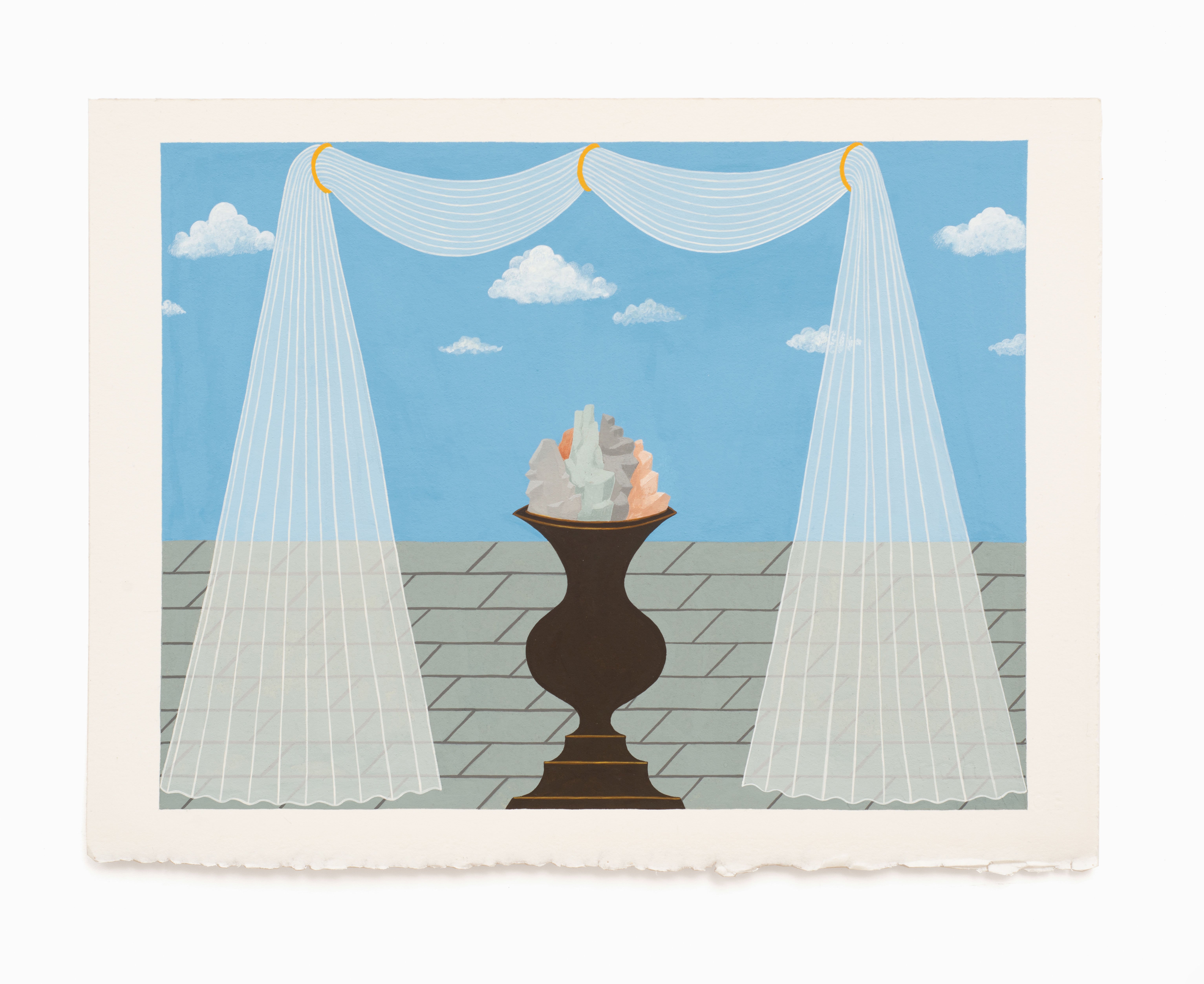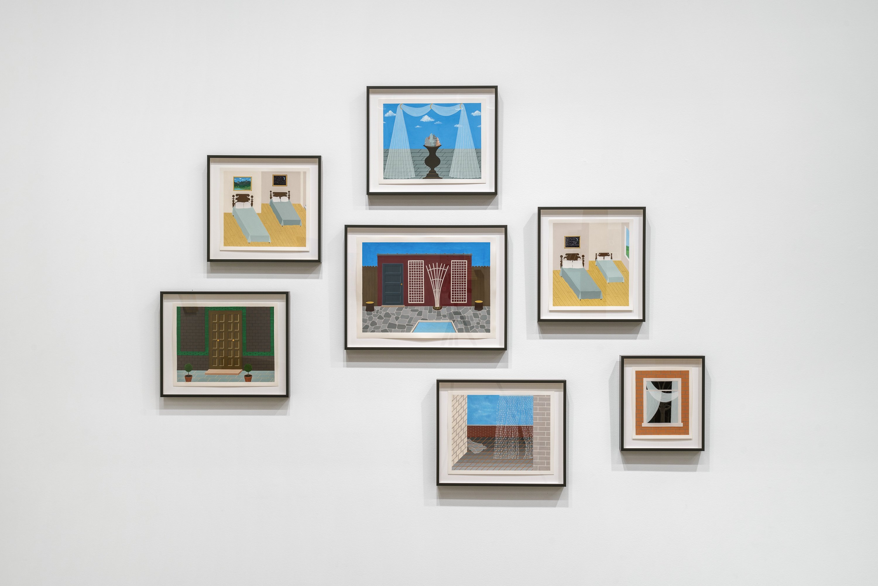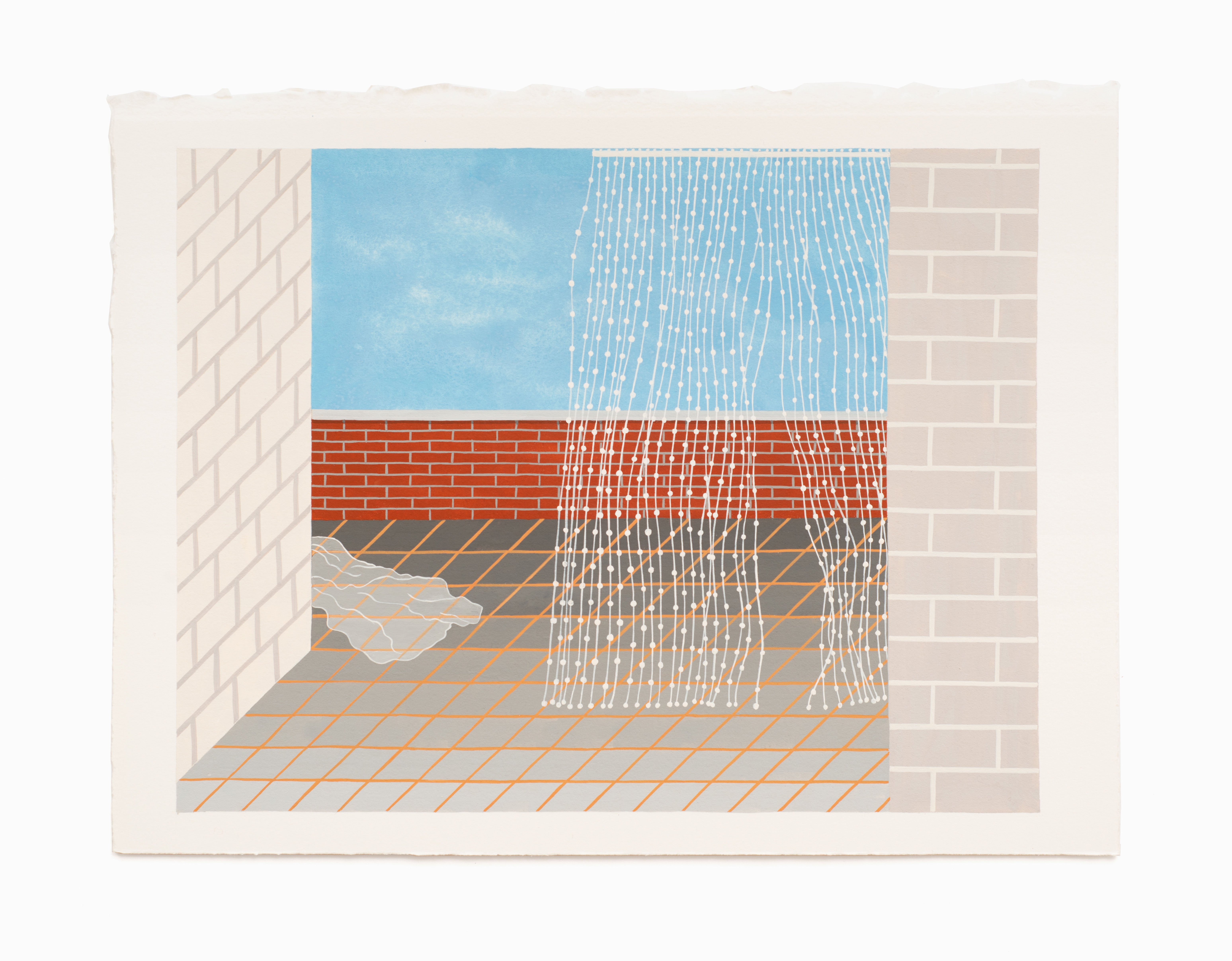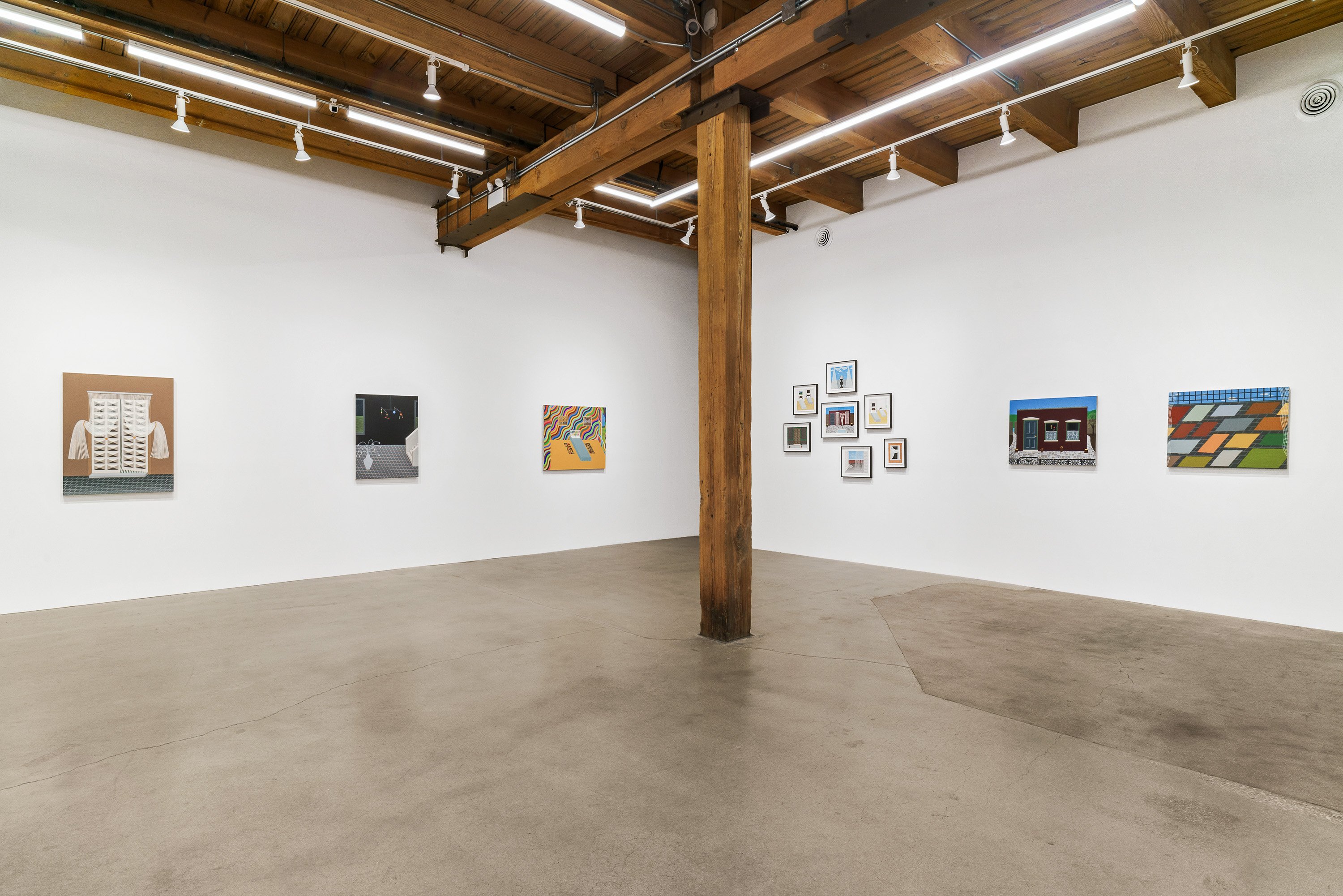In her latest body of work, Rebecca Shore meditates on a shifting set of spaces – interiors and exteriors, mostly domestic sites including bedrooms, porches, gardens, verandas, mezzanines, dining rooms, courtyards, doorways, and windows. Indeed, the status of the portal in these paintings, executed in acrylic on linen or in gouache on paper, is a central point. The viewer is consistently looking at something through something else, their vision moving between different atmospheres, varieties of light, qualities of enclosure or landscape. Building on her relatively recent pivot from abstraction to representation, Shore has retained her immaculate technical approach, a consistent feature of her work across her oeuvre, back to the paintings she was making in the early 1980s and the quilts she made alongside her friend Christina Ramberg later in the decade. There are no figures in these new works, only spaces. Often containing sly visual games or lurking spatial paradoxes, Shore's paintings create an imagined territory into which the viewer can project themself, a stage set carefully prepared for cognitive immersion. Two beds with paintings hung above them, one a daytime scene, one a night sky, the pairing creating a subtle tension in the room. Layers of oblique intertexts hovering in the paintings – Giovanni di Paolo's window-glimpsed landscapes and stylized rock formations, the vibrating curved lines of Karl Wirsum "awning" canvases. There are multiple patterns associated with different elements of these scenarios – a wall, a floor, stairs, a woven curtain, an iron gate, a hanging mobile – each combination culminating in a complex rhythmic assemblage, an extraordinary visual polyrhythm.