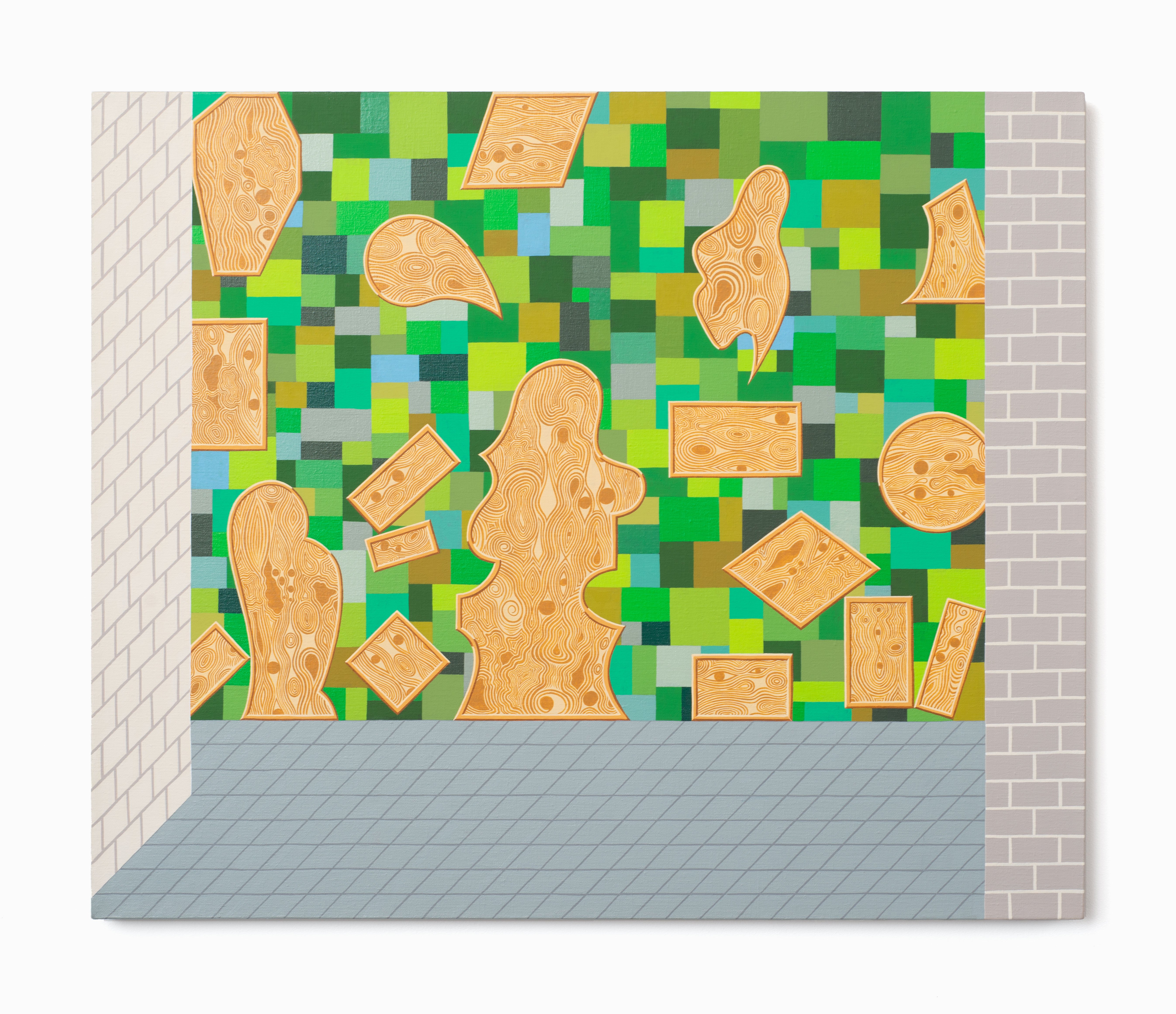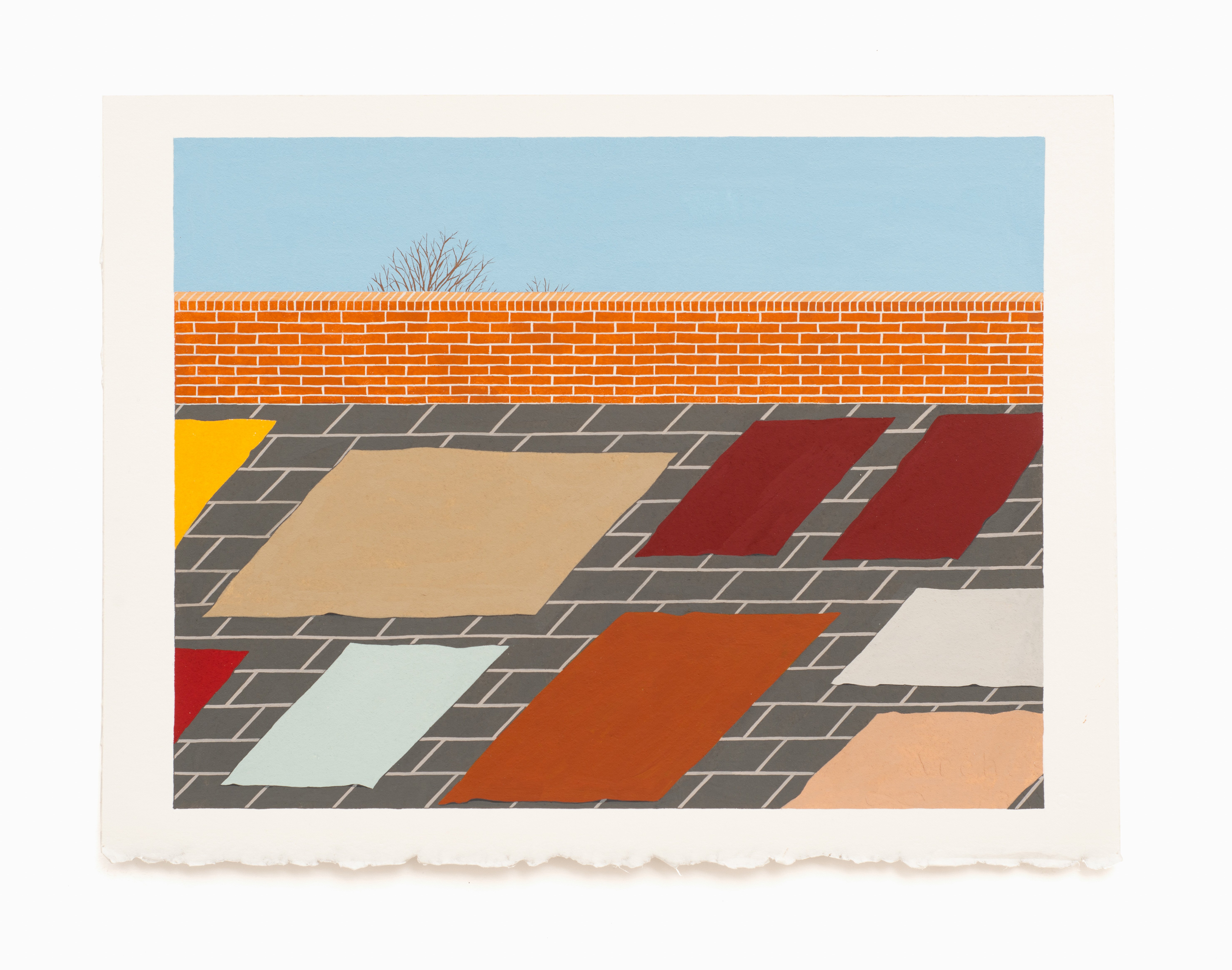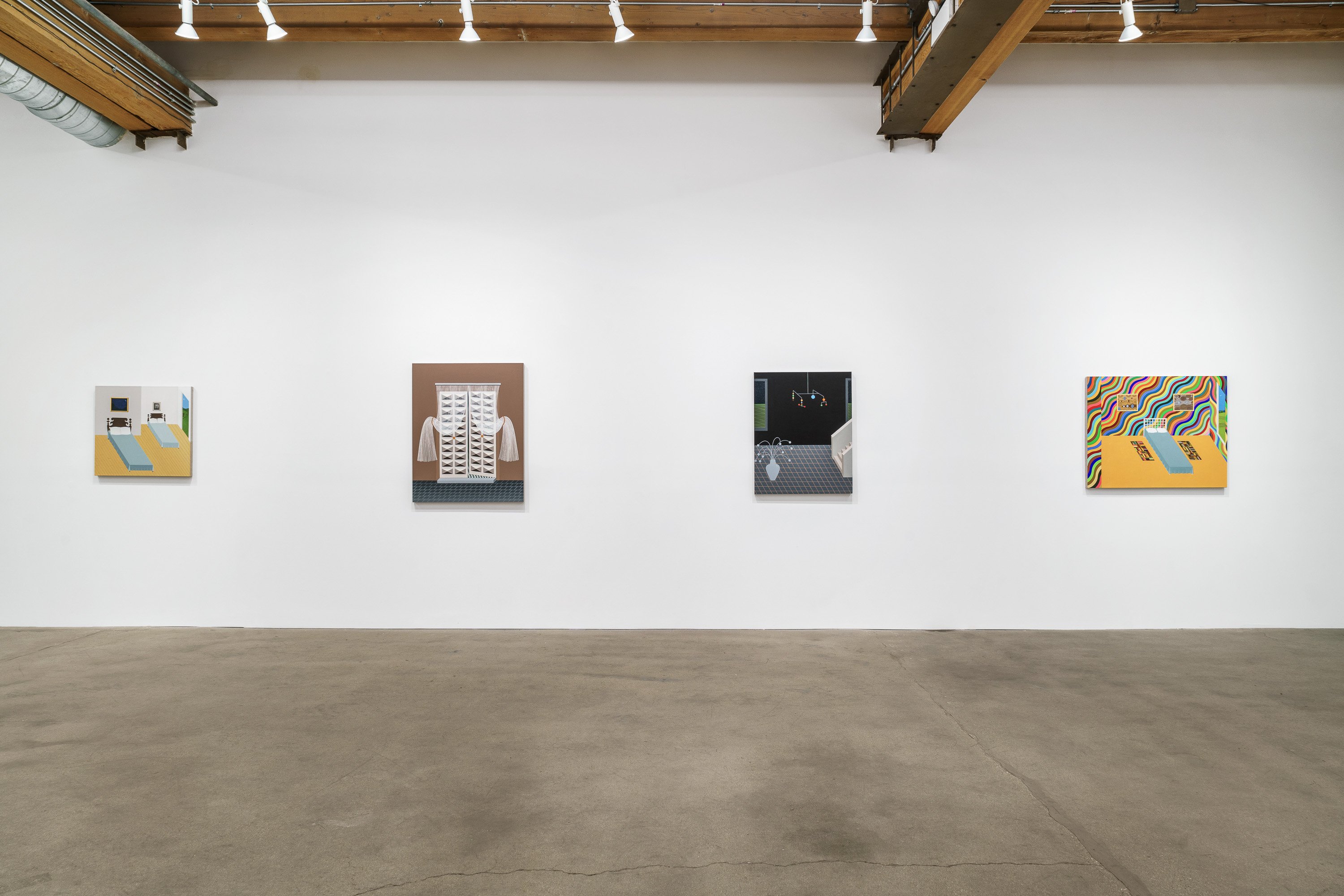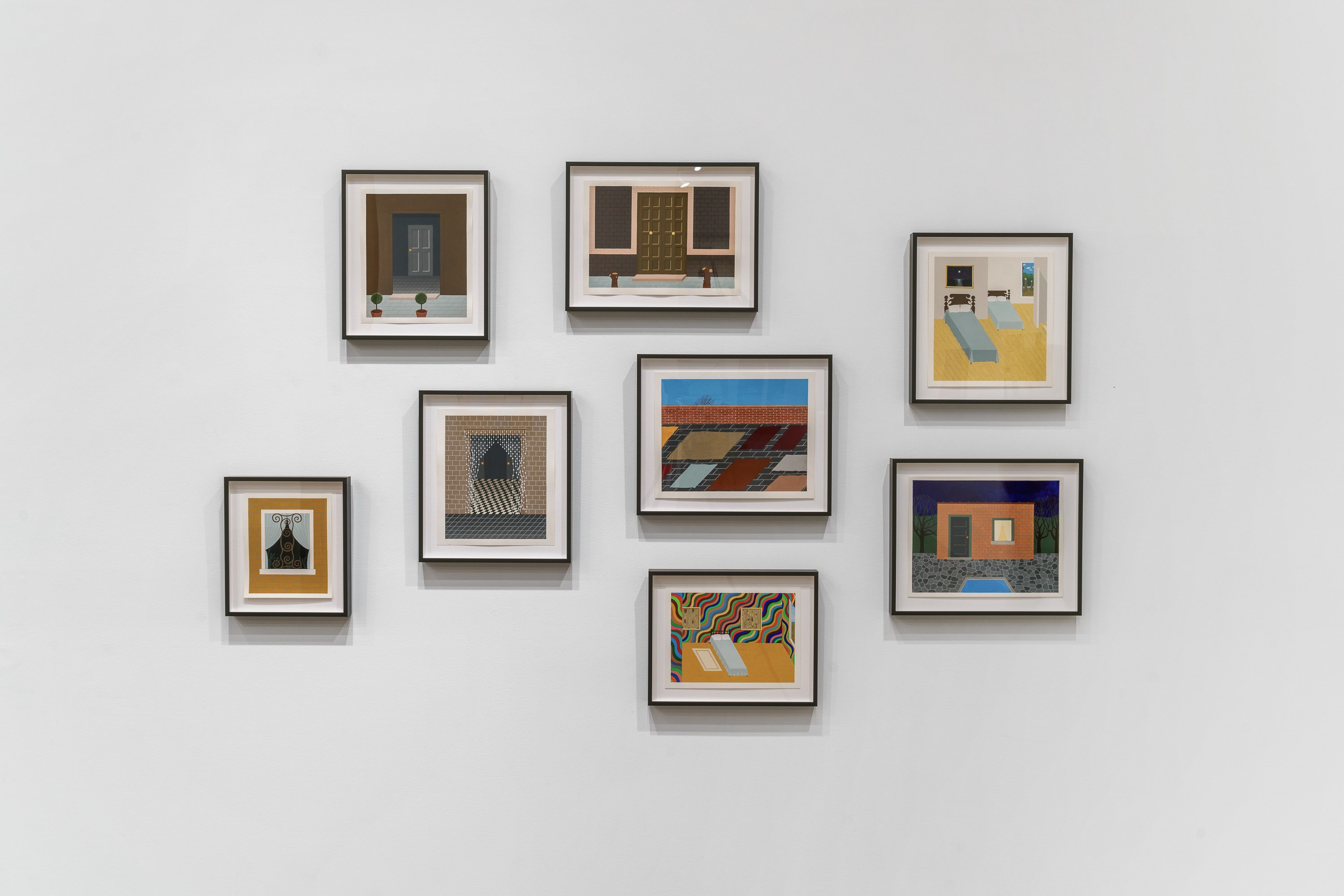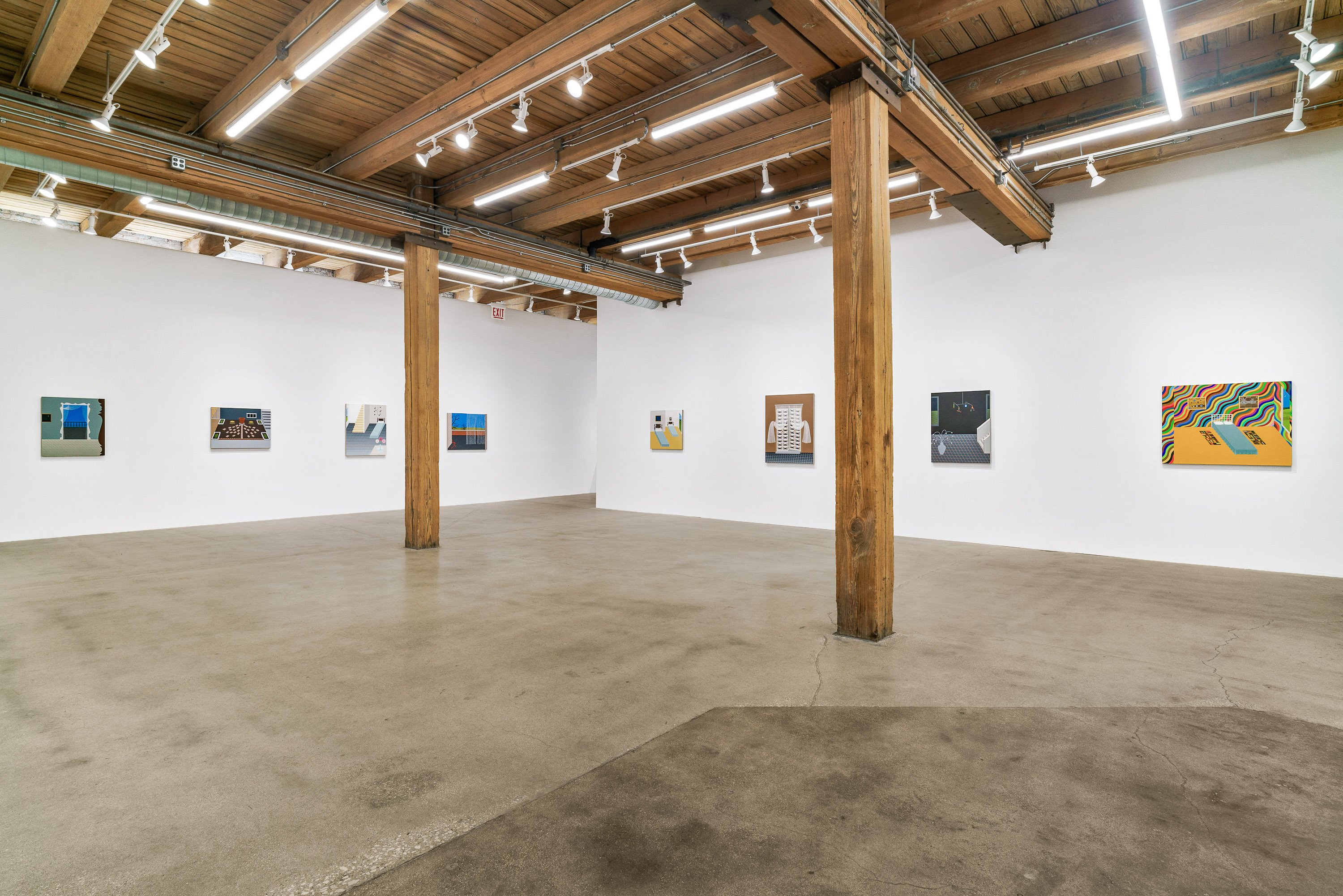 In her latest body of work, Rebecca Shore meditates on a shifting set of spaces – interiors and exteriors, mostly domestic sites including bedrooms, porches, gardens, verandas, mezzanines, dining rooms, courtyards, doorways, and windows. Indeed, the status of the portal in these paintings, executed in acrylic on linen or in gouache on paper, is a central point. The viewer is consistently looking at something through something else, their vision moving between different atmospheres, varieties of light, qualities of enclosure or landscape. Building on her relatively recent pivot from abstraction to representation, Shore has retained her immaculate technical approach, a consistent feature of her work across her oeuvre, back to the paintings she was making in the early 1980s and the quilts she made alongside her friend Christina Ramberg later in the decade. There are no figures in these new works, only spaces. Often containing sly visual games or lurking spatial paradoxes, Shore's paintings create an imagined territory into which the viewer can project themself, a stage set carefully prepared for cognitive immersion. Two beds with paintings hung above them, one a daytime scene, one a night sky, the pairing creating a subtle tension in the room. Layers of oblique intertexts hovering in the paintings – Giovanni di Paolo's window-glimpsed landscapes and stylized rock formations, the vibrating curved lines of Karl Wirsum "awning" canvases. There are multiple patterns associated with different elements of these scenarios – a wall, a floor, stairs, a woven curtain, an iron gate, a hanging mobile – each combination culminating in a complex rhythmic assemblage, an extraordinary visual polyrhythm.
