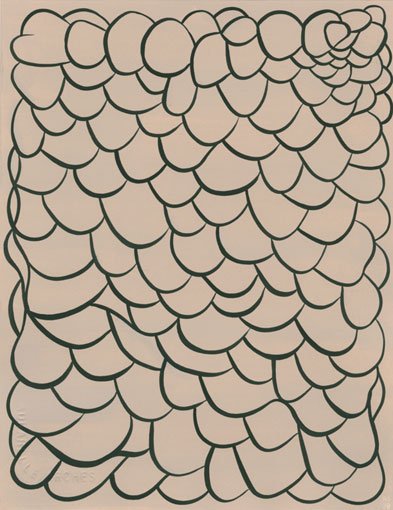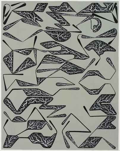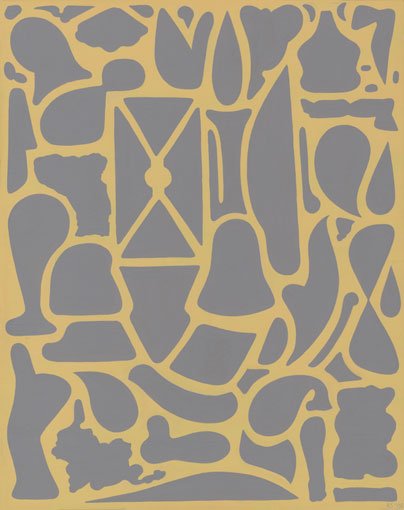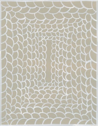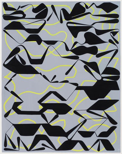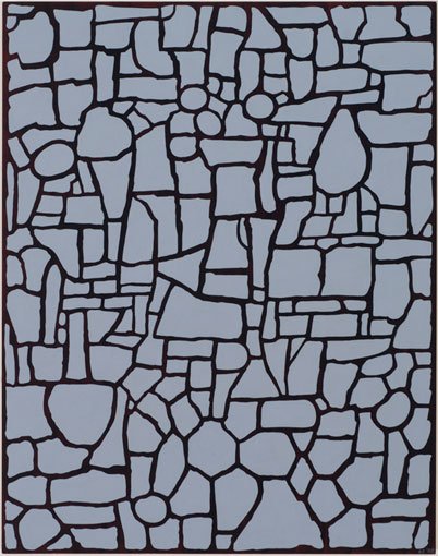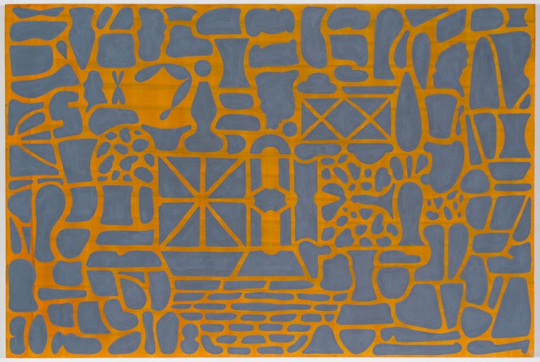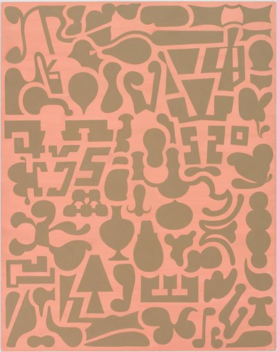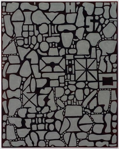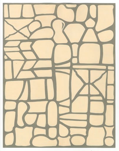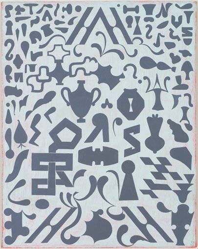 Shore nourishes her amalgamated aesthetic with an intensely concentrated studio practice and an obsessive collection of resource materials. The latter includes original photographs that she takes and studies, among them images that consider the broken pattern of a pleated skirt, the negative space created between the cartoon bodies of Homer and Marge Simpson, tangled ringlets of women’s hair, and architectural ornament. This exhibition includes a number of Shore’s recent paintings – executed in oil, casein, egg tempera, gouache and acrylic – derived from her photographs of faux rock walls. These sparklingly inventive pieces, which introduced a roughness and asymmetry into her work while retaining pattern, gradually evolved into another body of paintings in which the shapes began to congeal into a mysterious iconography, walking the edge between being completely legible and at times openly lettristic, and being wildly cryptic and subject to interpretation. Shore has created a world all her own from fragments of the world around her, microscopically examined, broken down and rebuilt.