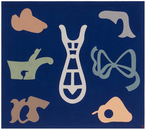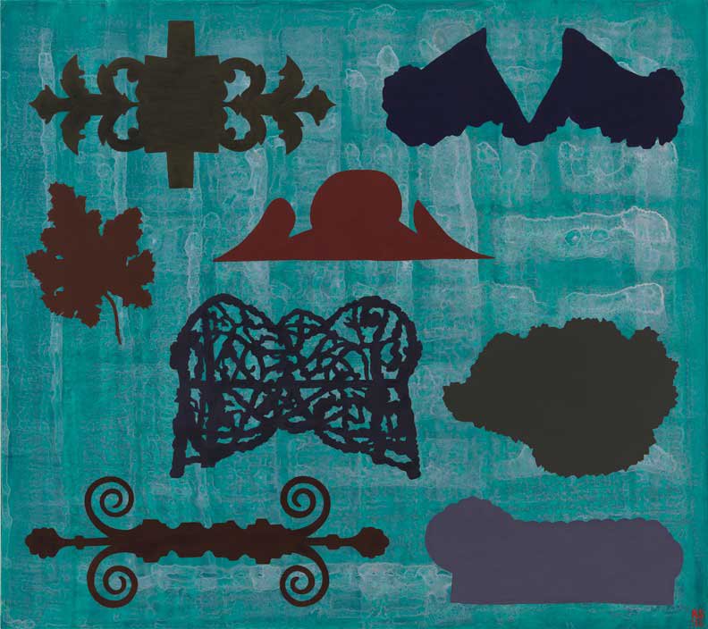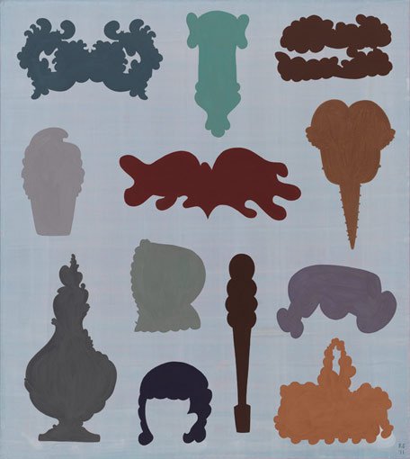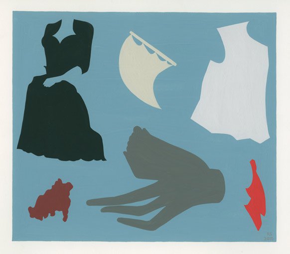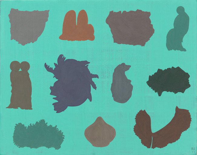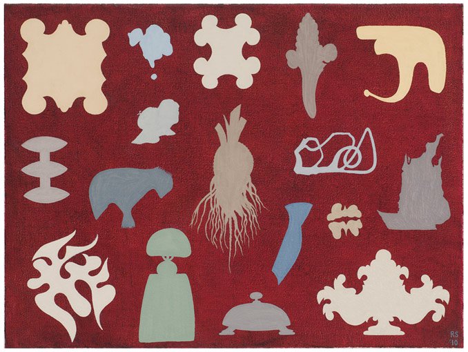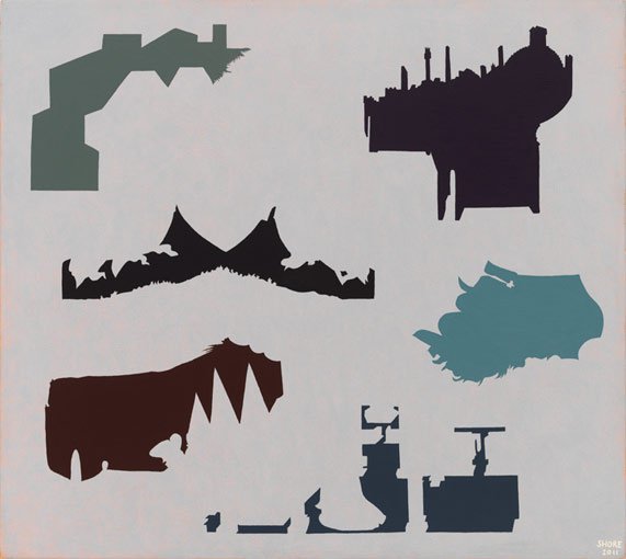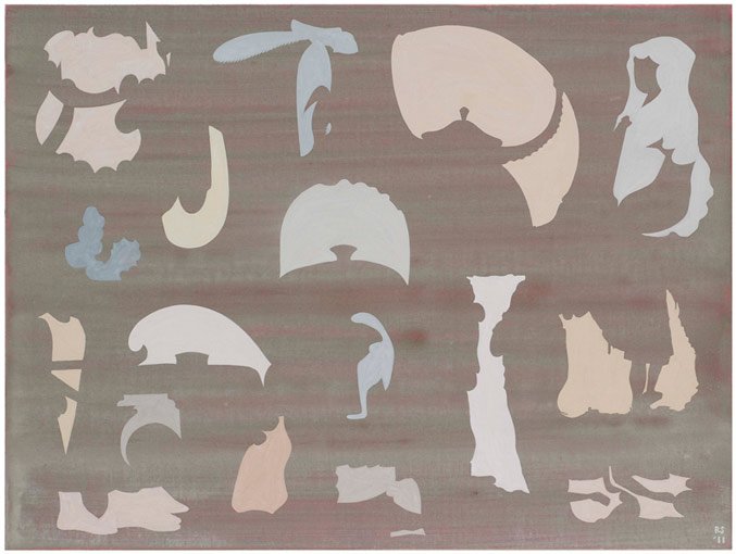 In paintings executed in oil and gouache, as well as distemper (a liquid paint using rabbit skin glue as a binding agent), she assembles and arranges specific images into small collections, each object an image drawn from Shore’s huge trove of working materials. Some of these silhouetted images are immediately recognizable – a bonnet, hair, a deer, a sofa – while others are opaque and abstract, their point of origin rendered mysterious and allusive. The play of connotations between these collected images, fastidiously painted on luminous, painterly backgrounds, invites the viewer to imagine relationships and parse identities. At once a master formalist and a semiotic wizard, Shore has pushed her practice to a brilliant and unfamiliar new place, a tremulous zone where objects and images are not always what they seem.