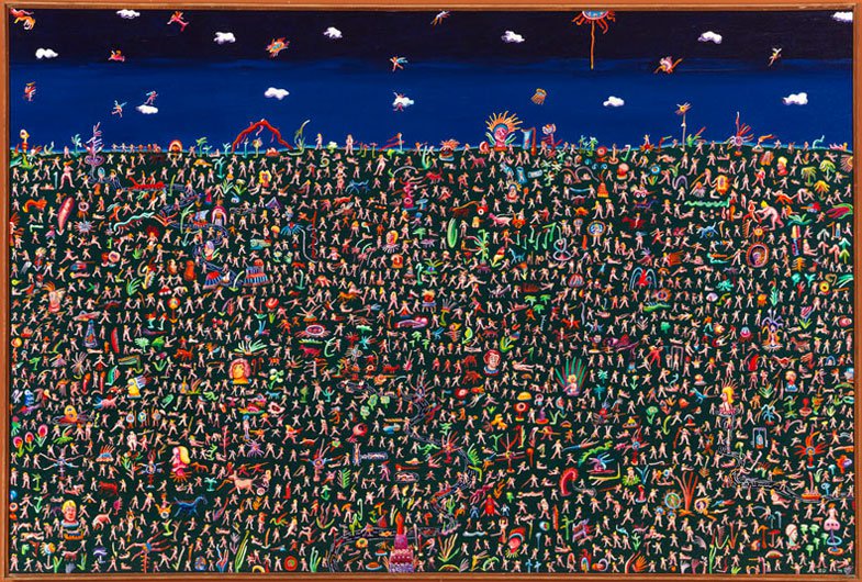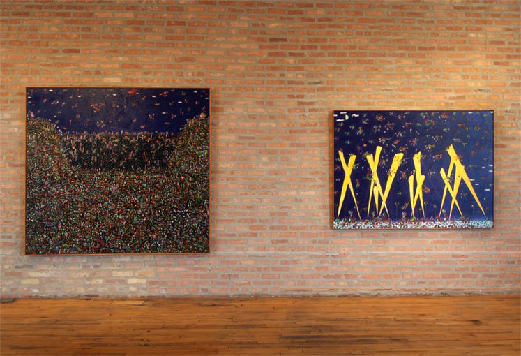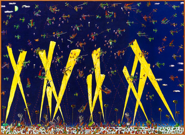 In the words of the Persuaders: it’s a thin line between love and hate. In Chicago in the early 1970s, Robert Donley created a group of drawings and paintings featuring orgiastic scenes. Highly detailed and expressionistically painted, these Bosch-like landscapes describe specific situations— Sodom and Gomorrah , Babel , Mystic Marriage of St. Catherine —that are densely populated with cavorting naked figures. Within a few years, these bacchanalian parties had morphed into equally detailed war scenes, often drawing on specific battles. Large-scale paintings such as On Target and Twin Blasted Dams are dizzying representations of WWII conflicts, with hundreds of tiny figures engaged in ground maneuvers and skies filled with fighter aircrafts and bombers.
