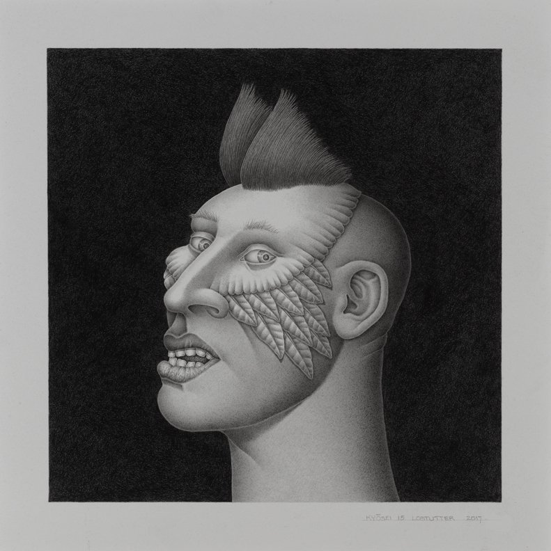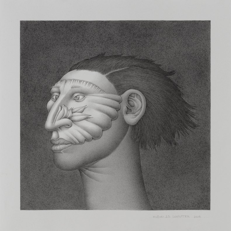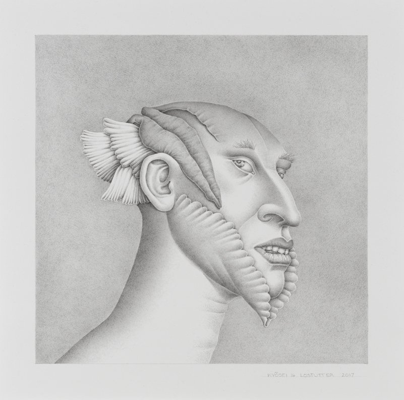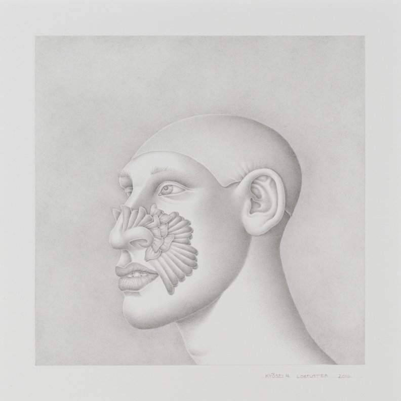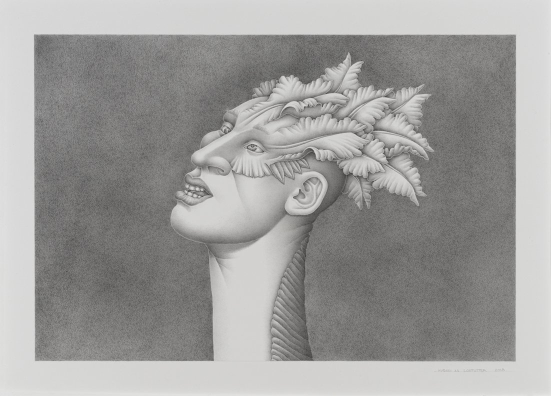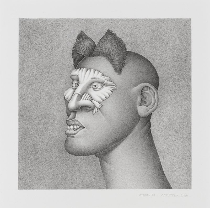 Robert Lostutter is in no way capricious. He does not move wistfully from thing to thing, but instead burrows deeply into an image or idea, excavating any available variation – a different angle, a change in gradient, an untried value – thereby demonstrating the importance of details, the high-stakes game of taking nuance seriously. Working on one of his masterful drawings, he’ll make nearly undetectable shifts by revisiting areas, adjusting lights and darks, buffing and honing the leadwork into a kind of ultimate existence. Graphite has been central to Lostutter’s practice since he began in the early 1960s, at times serving as an ideal medium for sketches, but just as often leading to terminal works on paper and even the rarely-seen format of pencil on canvas. In recent years, he’s been committed to the investigation of gray-scale portraits, including ones of increasing ambition in scale and resolution. In the works for Kyōsei , he’s explored both ends of lightness and darkness, creating several portraits that nearly evaporate into their ground and several with a rich, shadowy gunpowder tone that’s as velveteen and sumptuous as it is difficult to execute. The imagery is a continuation of Lostutter’s invented tribe of fantastic, harlequinade men – part human, part bird, part flower. Like John Graham’s mystical cross-eyed women, Lostutter’s bare-chested flock of floral fellows are psychologically loaded, projecting a complex interior thought space, a luminous penumbral membrane between day and night, persona and atmosphere. “Morning begins to brush the sky,” writes Lostutter in the poem that gives the show its title. “The day wolf chases the jackrabbit down/Sunset slope/Tender night/Suddenly I find the sweetest hours/ Midnight light/ Midnight floor/This is the ghost that I leave behind.”