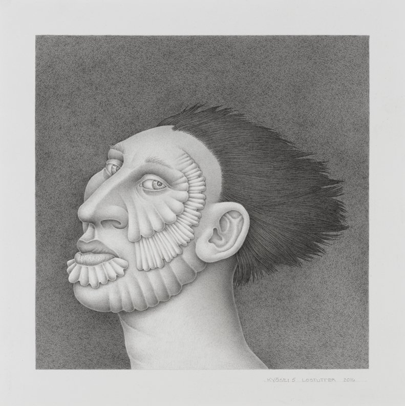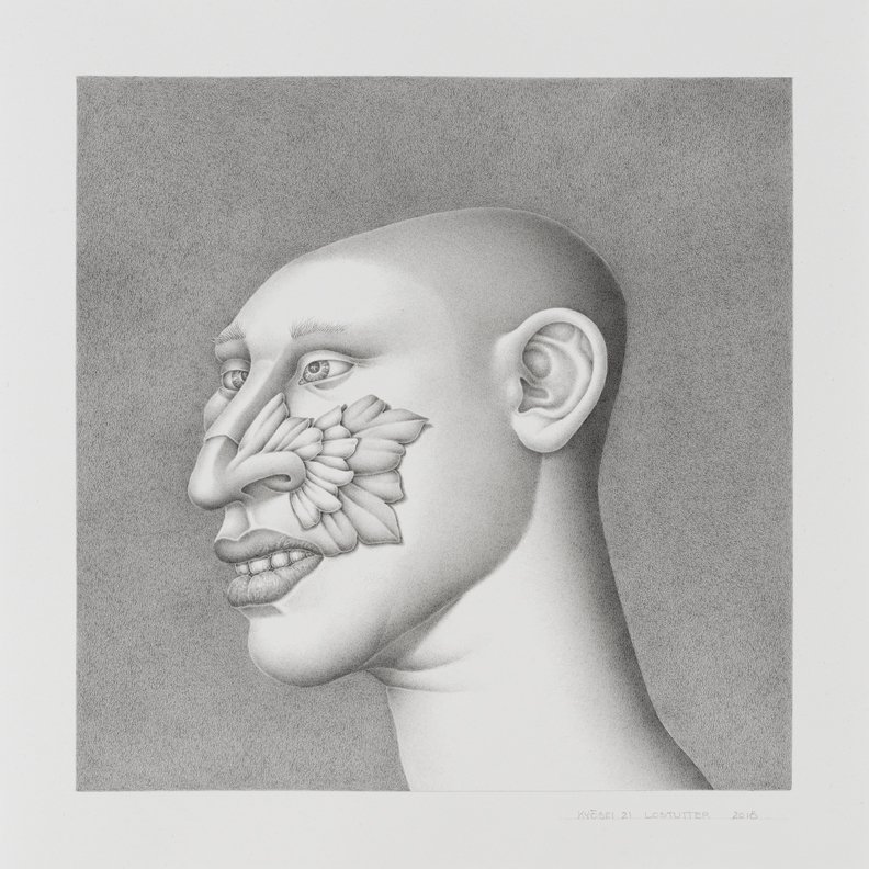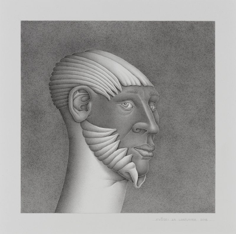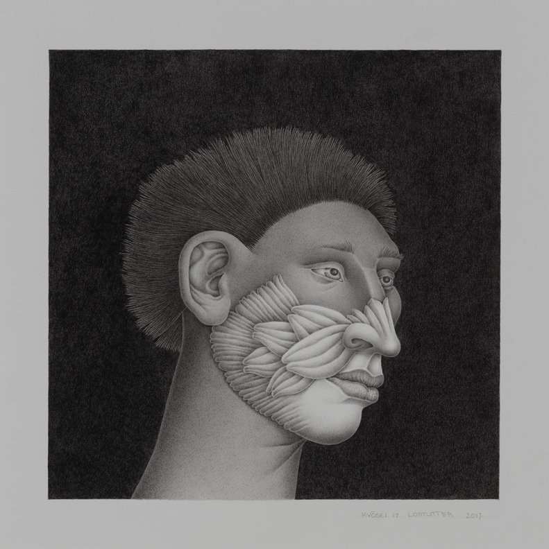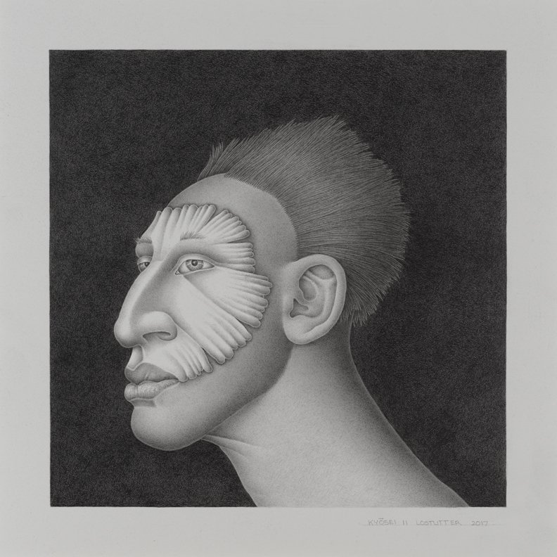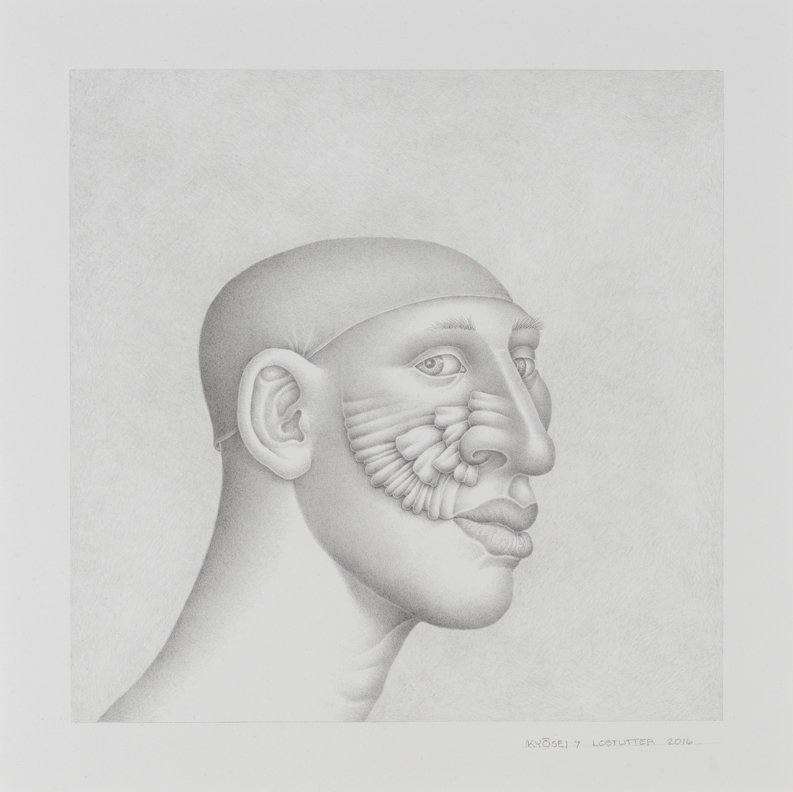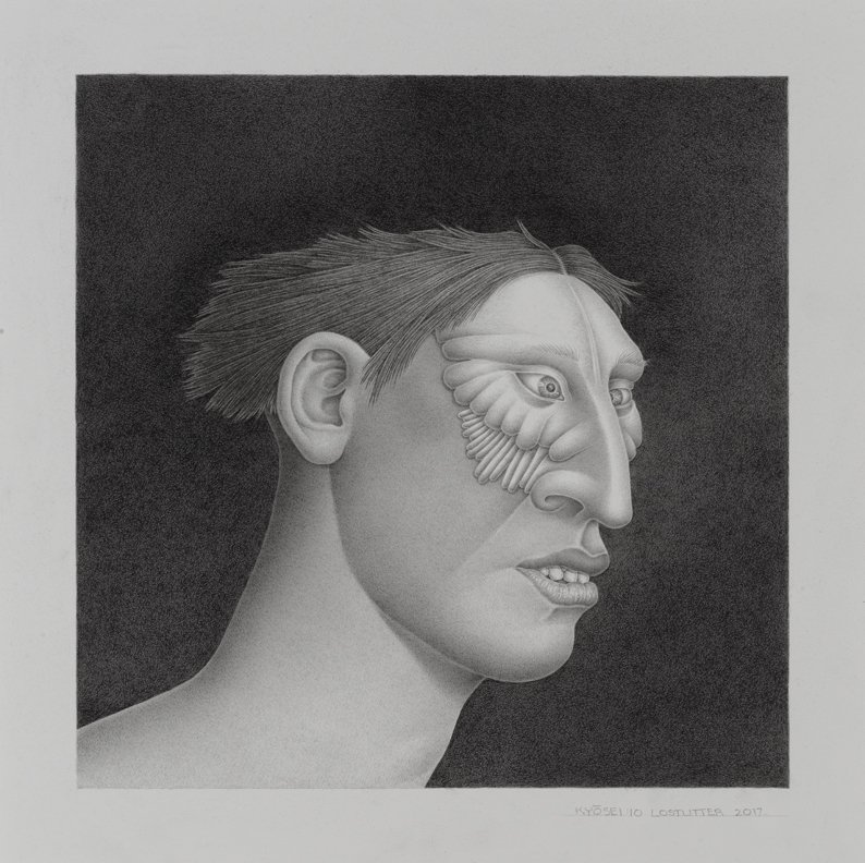 Robert Lostutter is in no way capricious. He does not move wistfully from thing to thing, but instead burrows deeply into an image or idea, excavating any available variation – a different angle, a change in gradient, an untried value – thereby demonstrating the importance of details, the high-stakes game of taking nuance seriously. Working on one of his masterful drawings, he’ll make nearly undetectable shifts by revisiting areas, adjusting lights and darks, buffing and honing the leadwork into a kind of ultimate existence. Graphite has been central to Lostutter’s practice since he began in the early 1960s, at times serving as an ideal medium for sketches, but just as often leading to terminal works on paper and even the rarely-seen format of pencil on canvas. In recent years, he’s been committed to the investigation of gray-scale portraits, including ones of increasing ambition in scale and resolution. In the works for Kyōsei , he’s explored both ends of lightness and darkness, creating several portraits that nearly evaporate into their ground and several with a rich, shadowy gunpowder tone that’s as velveteen and sumptuous as it is difficult to execute. The imagery is a continuation of Lostutter’s invented tribe of fantastic, harlequinade men – part human, part bird, part flower. Like John Graham’s mystical cross-eyed women, Lostutter’s bare-chested flock of floral fellows are psychologically loaded, projecting a complex interior thought space, a luminous penumbral membrane between day and night, persona and atmosphere. “Morning begins to brush the sky,” writes Lostutter in the poem that gives the show its title. “The day wolf chases the jackrabbit down/Sunset slope/Tender night/Suddenly I find the sweetest hours/ Midnight light/ Midnight floor/This is the ghost that I leave behind.”