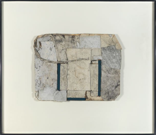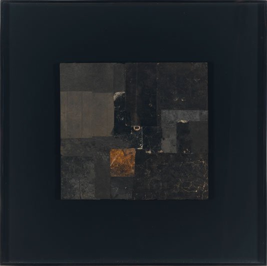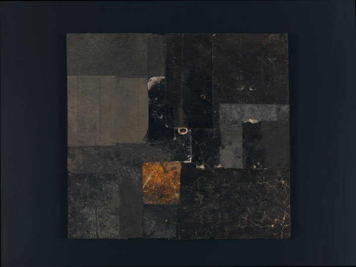 In the East Wing, Corbett vs. Dempsey presents a selection of works by Robert Nickle (1919-1980). One of the preeminent collage artists in Chicago, Nickle’s sumptuous abstractions were constructed of weathered bits of paper and cardboard he found on the street. Each of the small pieces took years to make, the artists waiting for precisely the correct element to add to a specific spot. Associated with the New Bauhaus for years, Nickle’s work has its affinities with Kurt Schwitters and Alberto Burri, but his sensibility is wholly personal, as is reflected in his elaborate and unusual manner of framing. The works all have a little window on the verso with a photo of the artist on the day he finished the collage, a literal portal onto the visage of the maker.