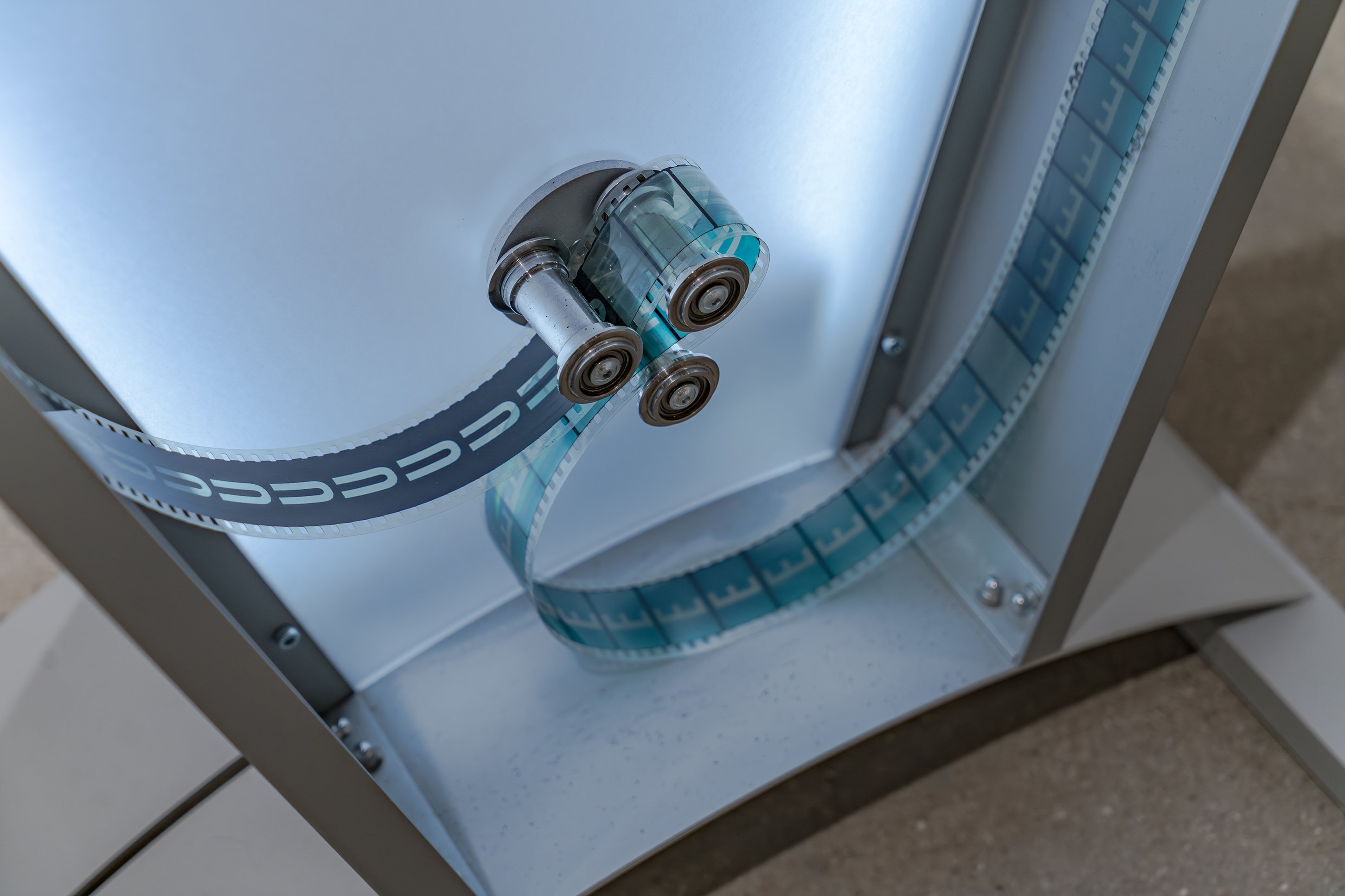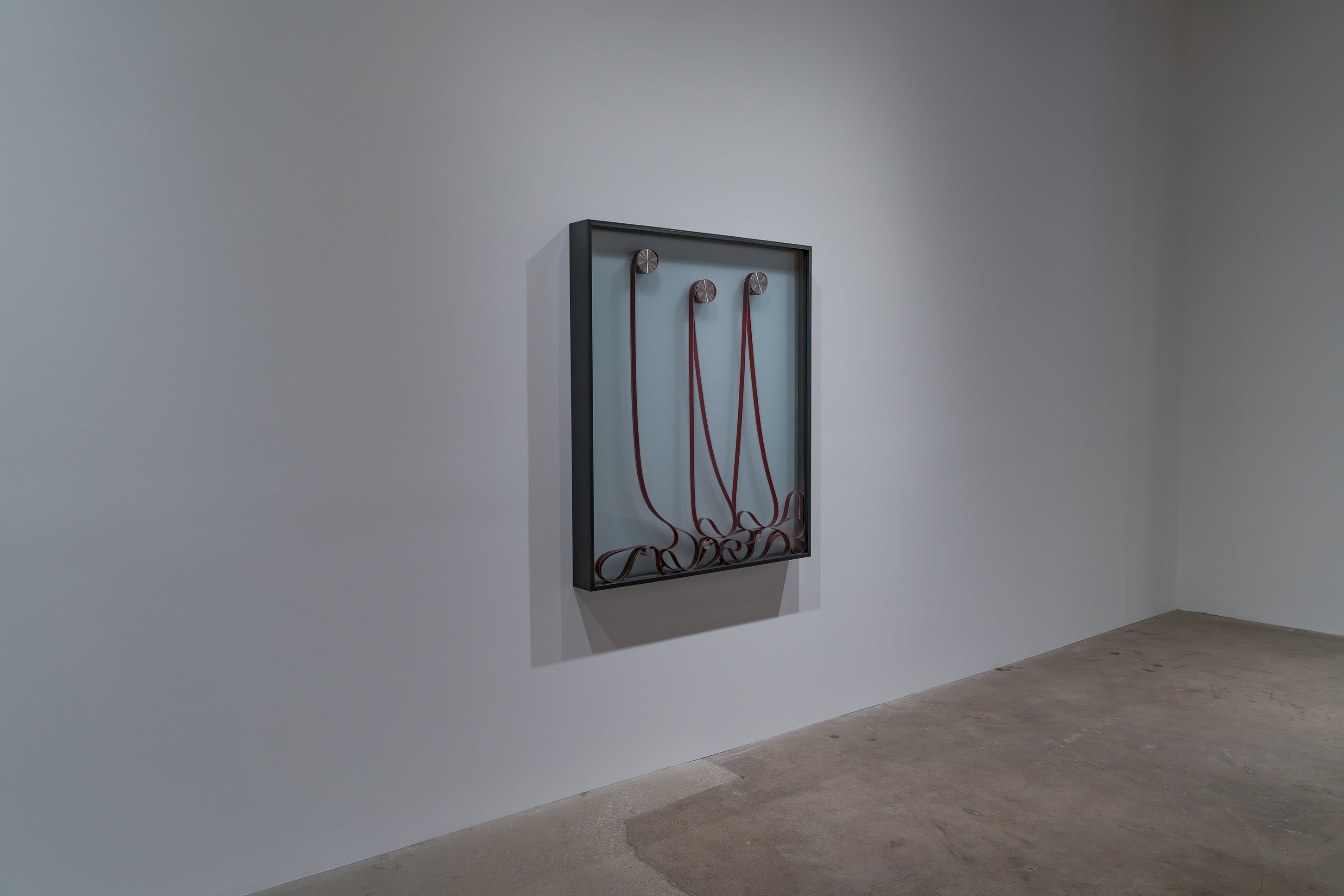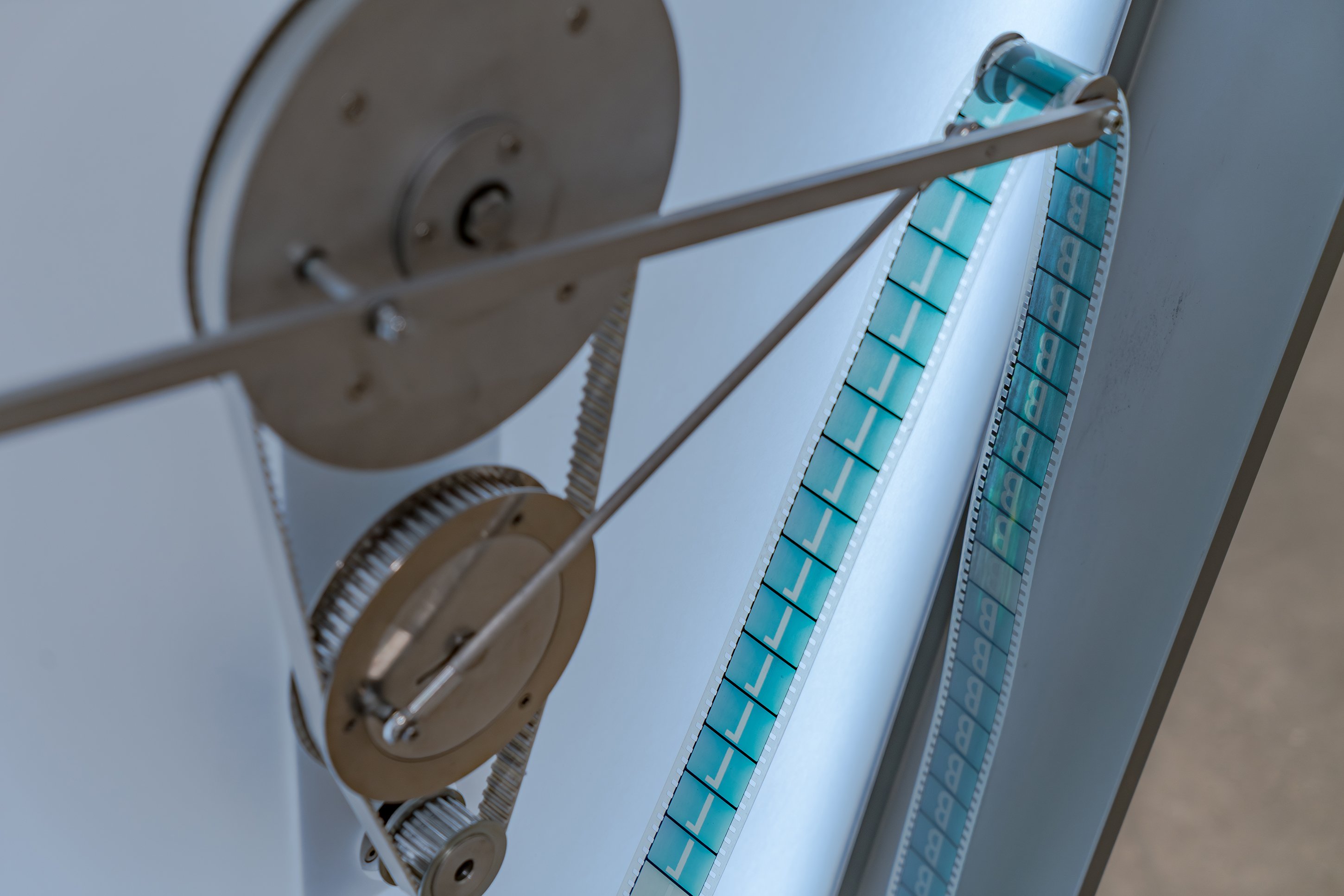 If our present moment is, as Rosa Barba has postulated, held captive by a particular version of the cinematic, one that we deploy unquestioningly with screens and projections of every imaginable scale, how can an artist critique and interrogate those by now thoroughly internalized mechanisms of viewing? Over the course of two decades, Barba has sought to rewire the cinematic stranglehold on our collective phenomenological reality. Both in the content of her films and in her inventive deconstruction of the cinematic apparatus, the Italian-born, Berlin-based artist has created an extensive oeuvre of free-standing and wall-hanging works, as well as movies, music, writings, performances, and installations that deeply question cinema’s construction of time, space, and perspective and subvert the way it has been subtly substituted for the popular unconscious. Poised Compression is the first gallery exhibition to follow (with a short cross-fade) Barba’s highly lauded solo show at New York’s Museum of Modern Art, The Ocean of One’s Pause, which surveyed fifteen years of her work and included performances and screenings, as well as an installation of the work in MoMA’s permanent collection. CvsD’s presentation includes one pivotal work that also appears in MoMA’s show, her 2009 sculpture “One Way Out,” which conceives of a film projector as a mysterious kind of feeder, spooling celluloid up into and back out from a swath of HVAC tubing, which amplifies the sound of the film as it bounces against the metal edges; over time, the film’s image, which is simultaneously being projected against a wall, acquires scratches made during the continuous action of its being sucked up into the pipe. The show includes two other kinetic sculptural works. “Color Clocks: Verticals Lean Occasionally Consistently Away from Viewpoints” (2012) consists of three towers with open housings each containing red, yellow, or blue 35mm film strips imprinted with letters spelling the colors they represent, which slide through a mechanical set of rollers in an infinite loop. The exhibition’s title work, “Poised Compression” (2023) is a wall-hanging, glazed metal box in which three spools rotate continuously, spinning strips of 35mm film in an ever-shifting pattern of lines, a kind of perpetual drawing machine. The exhibition also includes two still pieces, “Weavers” (2023), framed wall-works consisting of woven red and milky white 16mm film as an abstract painting, a ductile reclamation of cinema’s basic means of production.