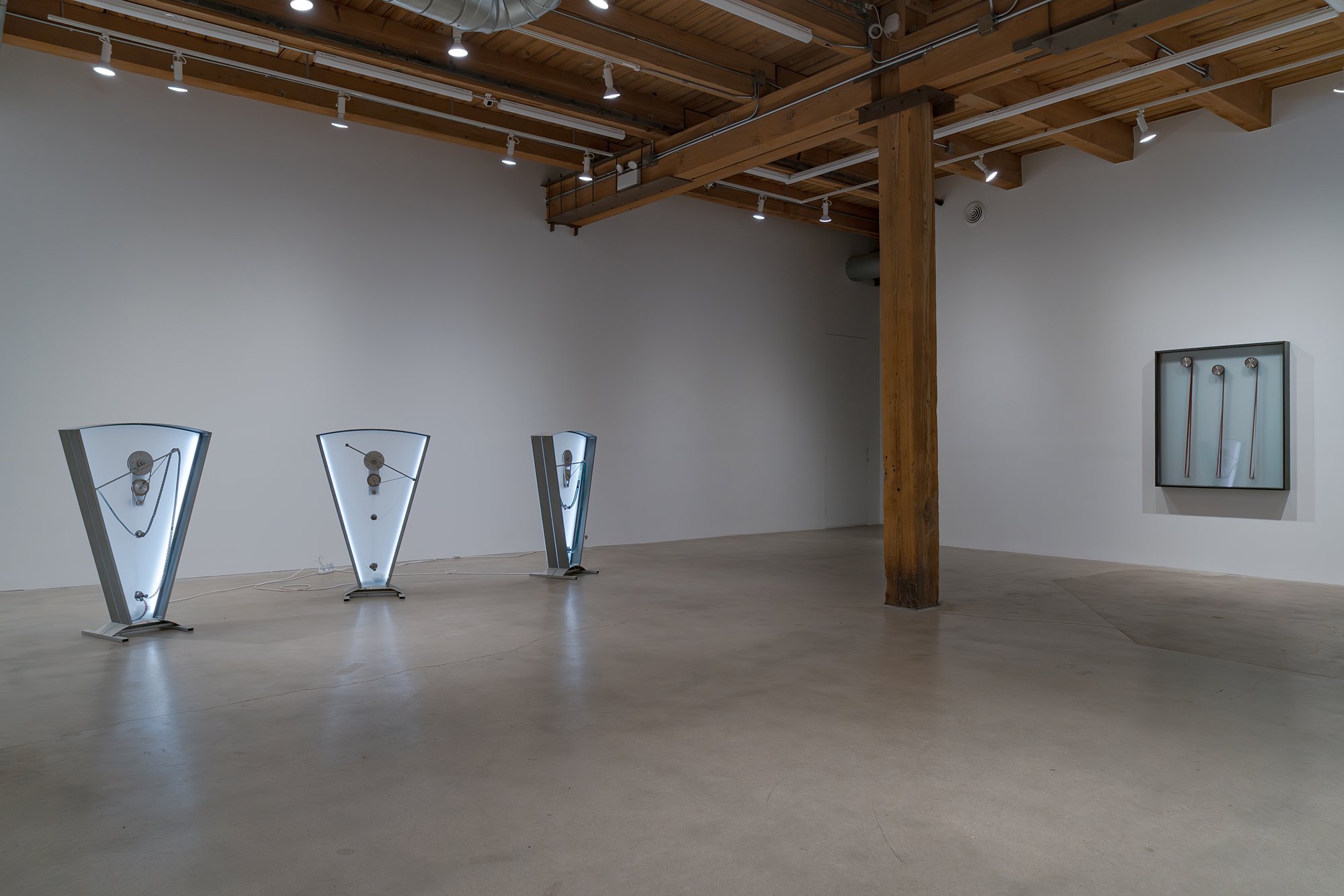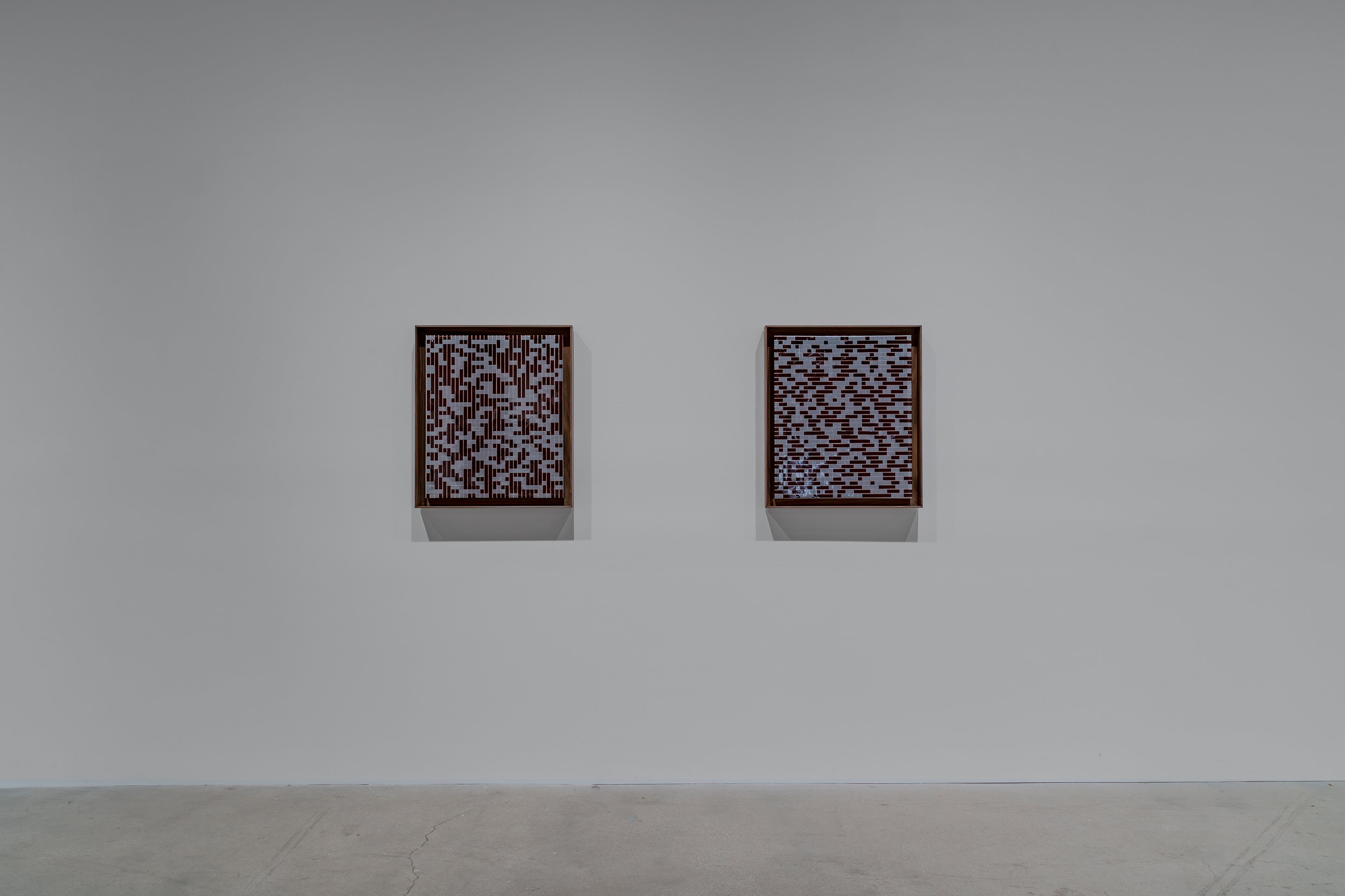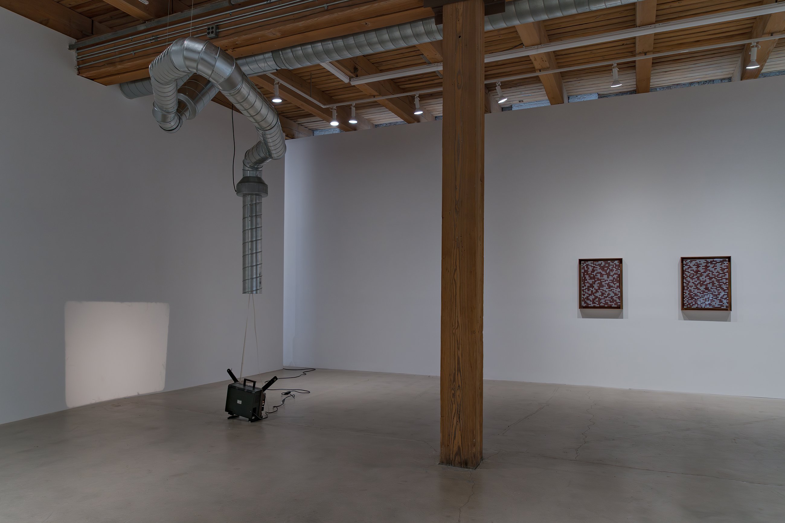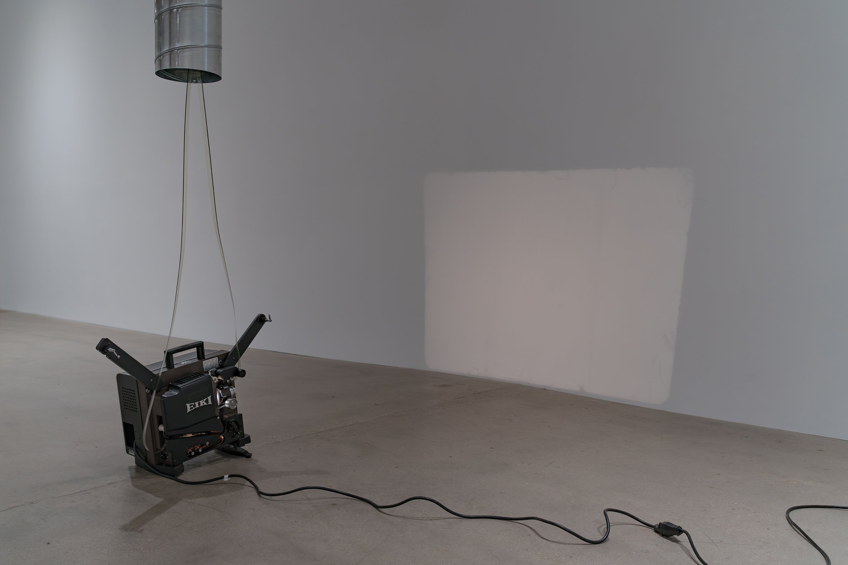 If our present moment is, as Rosa Barba has postulated, held captive by a particular version of the cinematic, one that we deploy unquestioningly with screens and projections of every imaginable scale, how can an artist critique and interrogate those by now thoroughly internalized mechanisms of viewing? Over the course of two decades, Barba has sought to rewire the cinematic stranglehold on our collective phenomenological reality. Both in the content of her films and in her inventive deconstruction of the cinematic apparatus, the Italian-born, Berlin-based artist has created an extensive oeuvre of free-standing and wall-hanging works, as well as movies, music, writings, performances, and installations that deeply question cinema’s construction of time, space, and perspective and subvert the way it has been subtly substituted for the popular unconscious. Poised Compression is the first gallery exhibition to follow (with a short cross-fade) Barba’s highly lauded solo show at New York’s Museum of Modern Art, The Ocean of One’s Pause, which surveyed fifteen years of her work and included performances and screenings, as well as an installation of the work in MoMA’s permanent collection. CvsD’s presentation includes one pivotal work that also appears in MoMA’s show, her 2009 sculpture “One Way Out,” which conceives of a film projector as a mysterious kind of feeder, spooling celluloid up into and back out from a swath of HVAC tubing, which amplifies the sound of the film as it bounces against the metal edges; over time, the film’s image, which is simultaneously being projected against a wall, acquires scratches made during the continuous action of its being sucked up into the pipe. The show includes two other kinetic sculptural works. “Color Clocks: Verticals Lean Occasionally Consistently Away from Viewpoints” (2012) consists of three towers with open housings each containing red, yellow, or blue 35mm film strips imprinted with letters spelling the colors they represent, which slide through a mechanical set of rollers in an infinite loop. The exhibition’s title work, “Poised Compression” (2023) is a wall-hanging, glazed metal box in which three spools rotate continuously, spinning strips of 35mm film in an ever-shifting pattern of lines, a kind of perpetual drawing machine. The exhibition also includes two still pieces, “Weavers” (2023), framed wall-works consisting of woven red and milky white 16mm film as an abstract painting, a ductile reclamation of cinema’s basic means of production.