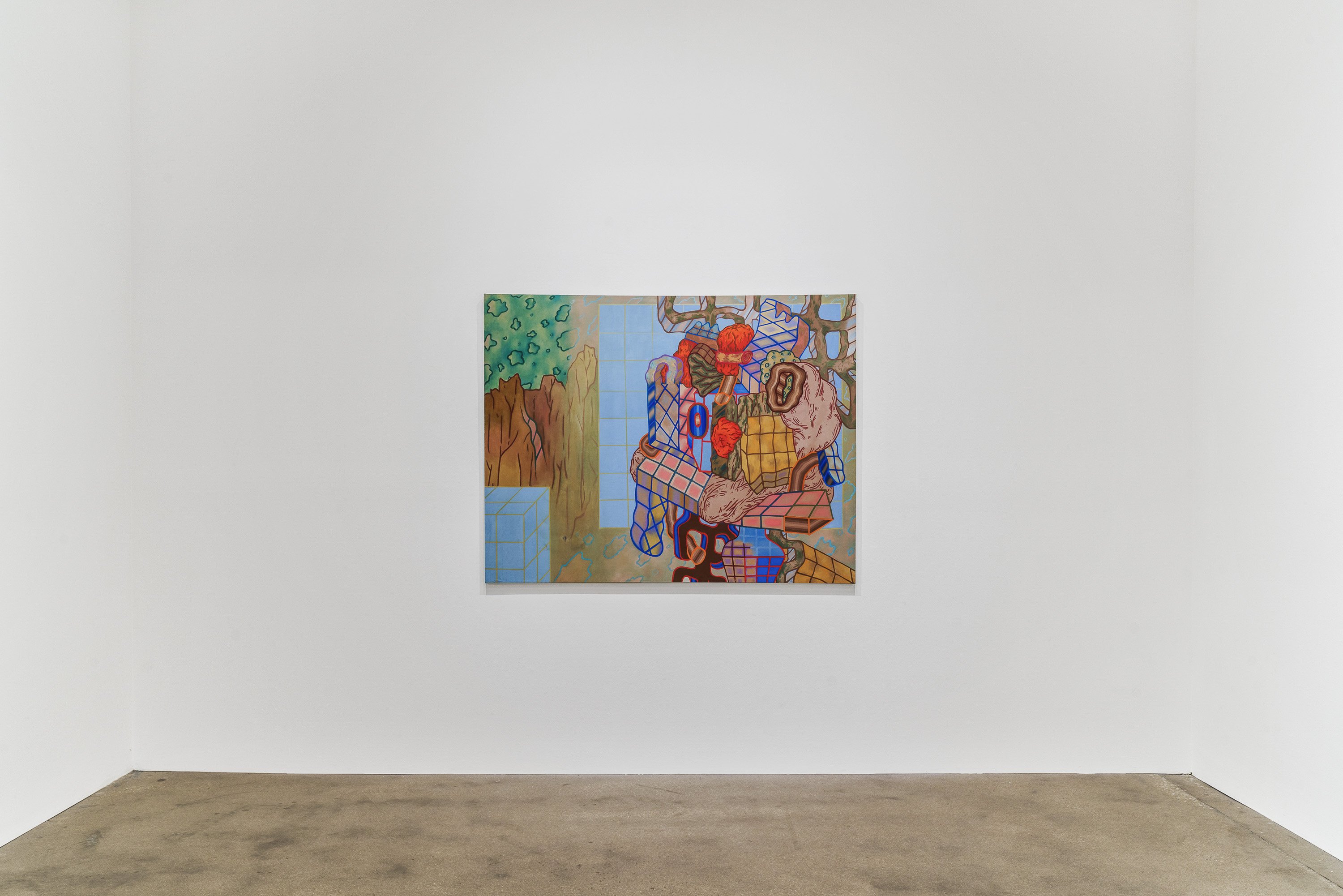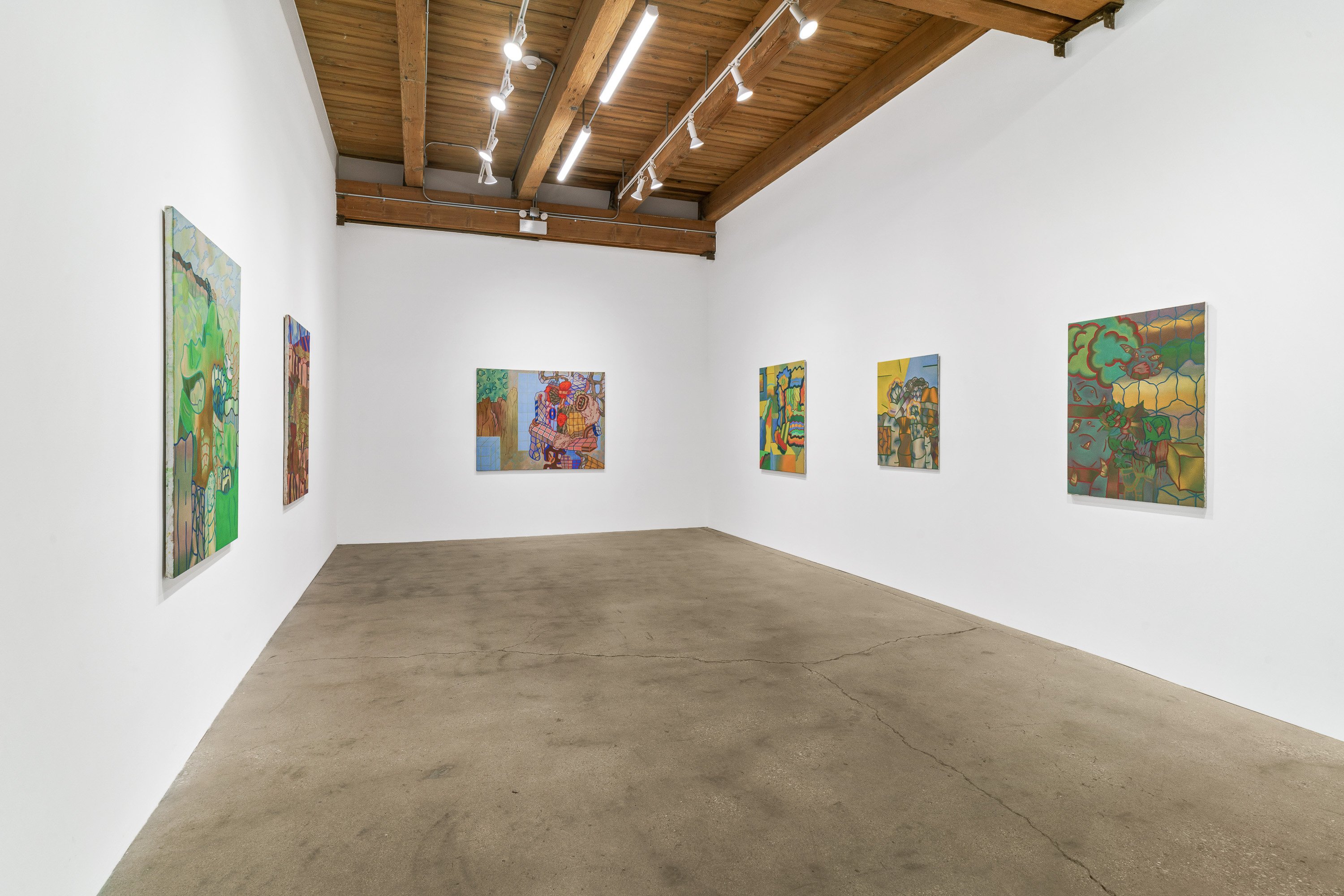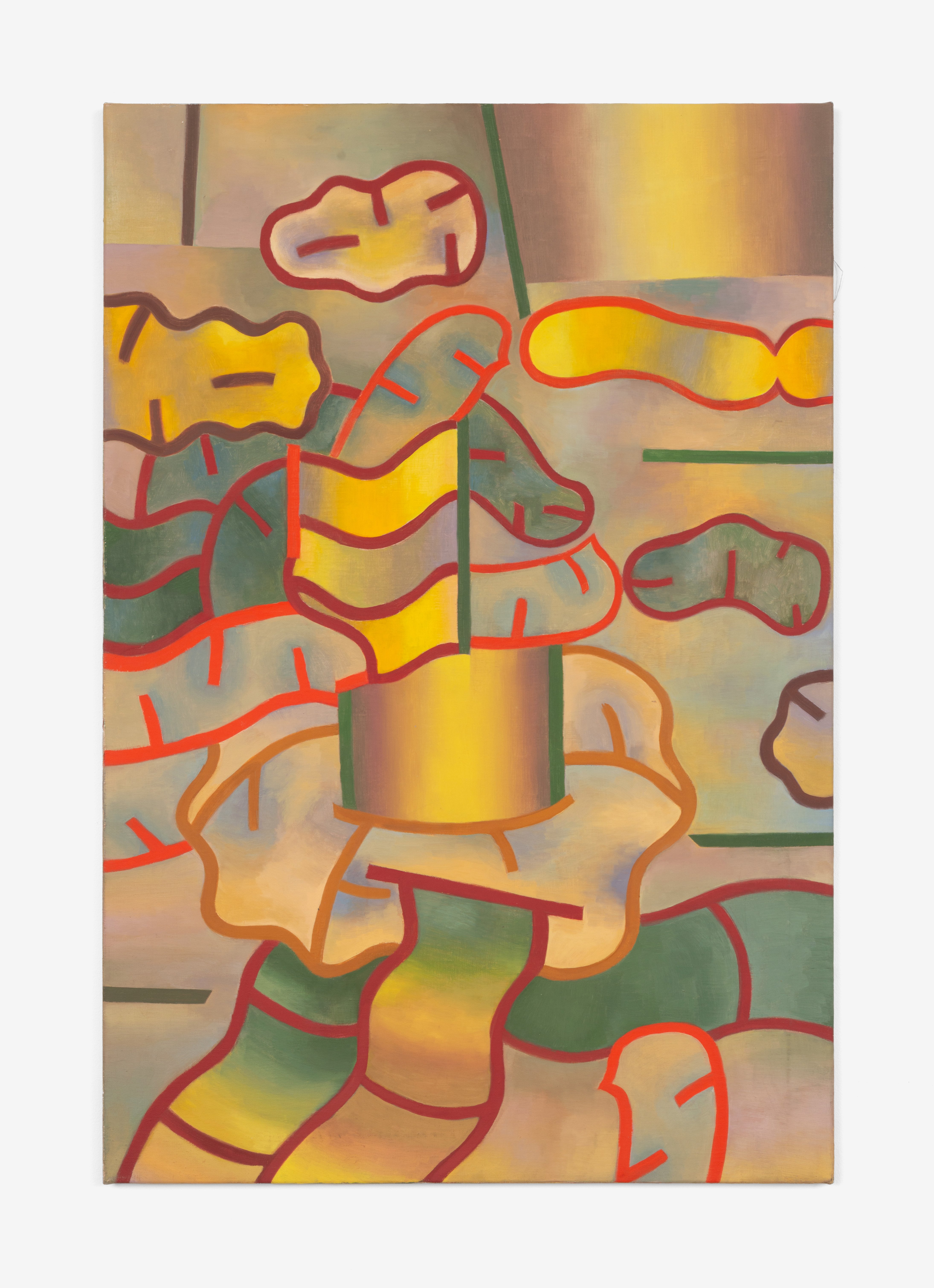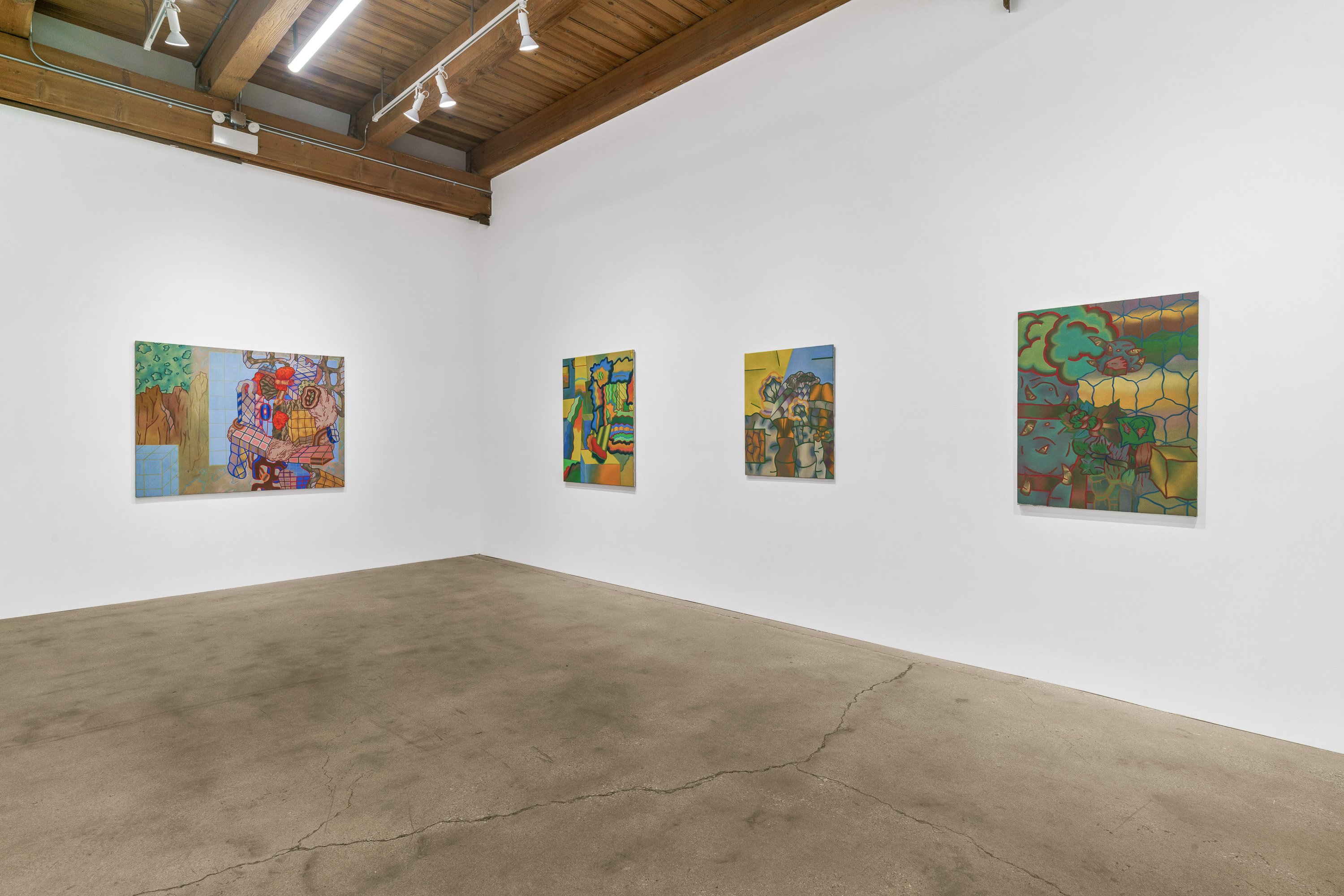 Ted Halkin (1924-2020) was a central figure in Chicago's art scene for more than half a century. Emerging in the postwar period as one of the original members of the so-called Monster Roster, alongside Leon Golub, Dominick Di Meo, George Cohen, and Evelyn Statsinger, Halkin exhibited with Alan Frumkin Gallery in New York and Phyllis Kind Gallery in Chicago. He made paintings with low-relief elements and whimsical figures in earthen tones as well as biomorphic papier-mâché sculptures with orifices and knotted forms, sometimes featuring found furniture parts. In the mid-1960s, Halkin's work took a rather abrupt turn. The forms continued to be complex, biomorphic, and highly abstract, but the colors and overall composition shifted dramatically, moving into a bright, saturated palette and an open-ended, spatially labyrinthine compositional concept quite different from the earlier scenarios. Halkin's initial advances in this direction came in the form of the sculptures and their associated drawings, followed by a series of incredible canvases and works on paper made between 1967 and 1970, which have certain features in common with well-known Chicago Imagist artists – one might find similarities with Jim Nutt and Karl Wirsum works from the same period – but always much more abstractly composed. Some of these works were exhibited at the time, but a large group of them remained unshown by the time Halkin moved to a new house in Evanston in 1970. There the paintings were rolled and safely stored in the basement, where they stayed until 2023, when, in preparation for the exhibition Four Chicago Artists: Ted Halkin, Evelyn Statsinger, Barbara Rossi, and Christina Ramberg (which opened at the Art Institute of Chicago on May 11), they were rediscovered. Brilliant and as immaculate as the day they were painted, these paintings parallel the drawings in the AIC, their formal puzzles, glancing allusions to representation, and shivering color vibrations demonstrating how Halkin's creativity was in overdrive at the time. This exhibition presents a selection of these newly uncovered paintings and several important precursor sculptures, also unearthed in the artist's studio dwelling.