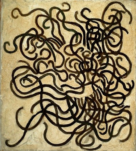 In 1955, Hahn was awarded the Prix-de-Rome. While in Italy, he painted large, often mythologically inspired canvases – Janus-faced faced figures, Medusas, 100-eyed women, winged snakes. Late in the ’50s, Hahn moved to New York, where he was represented by Gallery G, alongside an as-yet-unknown artist named Lee Bontecou. By the mid ’60s, his work had grown somewhat more naturalistic, influenced by a growing immersion in Asian culture, and in 1964 he stopped painting and by-and-large left the public artworld – not unlike Bontecou. Hahn’s creative life has continued through his design of Japanese tea ceremony teaspoons, of which his is one of the very few non-Japanese masters, and in the form of highly personal collages, which he has yet to exhibit. This exhibition at Corbett vs. Dempsey will bring together Walter Hahn’s Chicago-era paintings and drawings for the first time since the 1950s. Among the works exhibited will be sketches of H. C. Westermann, who was a model in life-drawing classes in the late ’40s, and an astonishing group of pieces drawn and painted directly onto the pages of a Swedish book on massage. Hahn’s important canvases on display will include AQUARIUM and SATAN, as well as MEDUSA II, WINGED SNAKES and GOLDEN BOUGH from the prix-de-Rome years.