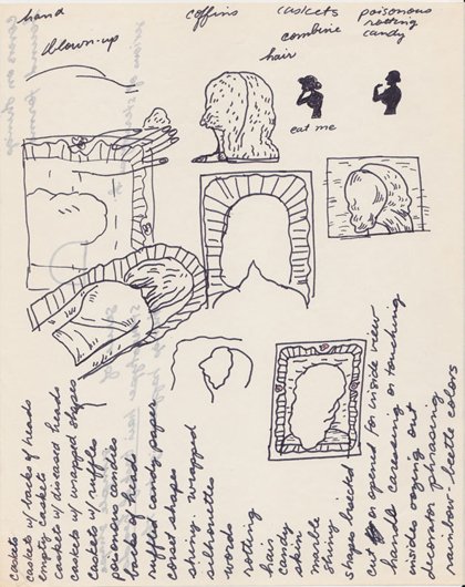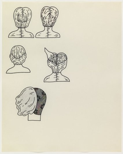 Untitled (15 scarves in hair) c. 1968 black and blue felt-tip marker on paper 7 3/4 x 9 3/4 inches