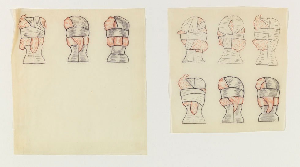 Untitled (bound heads) c.1972 red and black ballpoint pen on tracing paper 4 1/4 x 4 inches and 3 3/4 x 4 inches