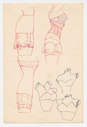 Untitled (corsets, mannequins, and undergarments) c. 1972 blue and red ballpoint pen on paper card 6 x 4 inches