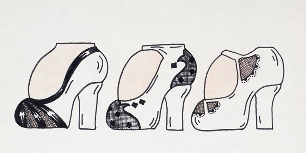 Untitled (3 shoes) c. 1968 colored pencil and black felt-tip marker on paper 4 x 8 inches