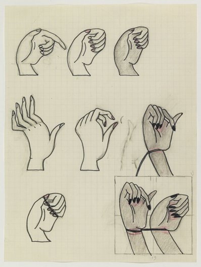 Untitled (nine hands) c. 1971 felt-tip pen, graphite, and colored pencil on graph paper 8 1/2 x 6 1/2 inches; framed